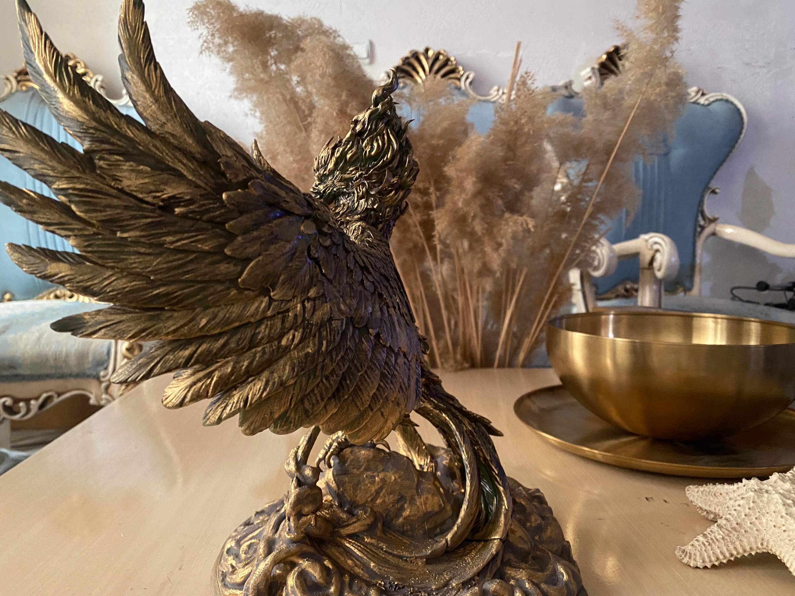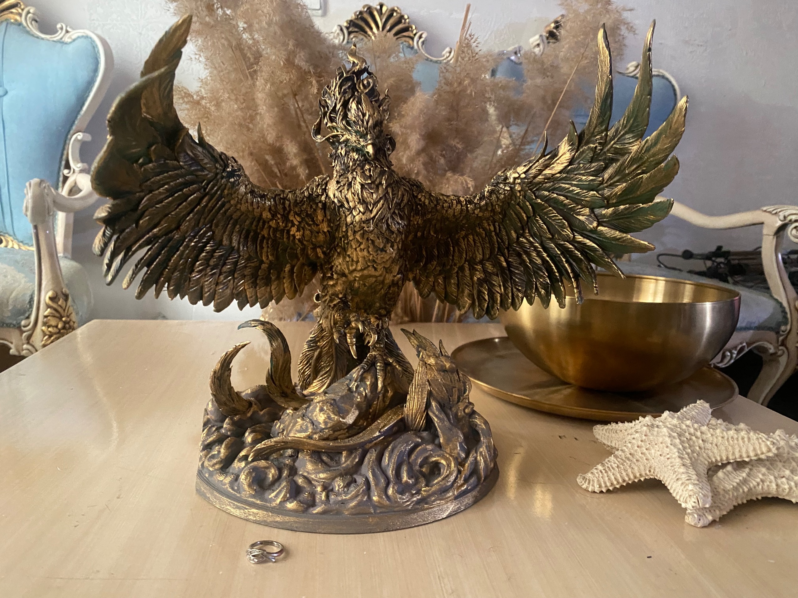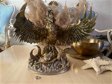 تندیس رزینی ققنوس با بالهای باز نماد آزادی و رهایی بسیار شکیل ومناسب برای دکوراسیون ارتفاع حدود 30 سانتی متر و عرض حدود 25 سانتی متر با ظرافت و جزییات و وزن بالا