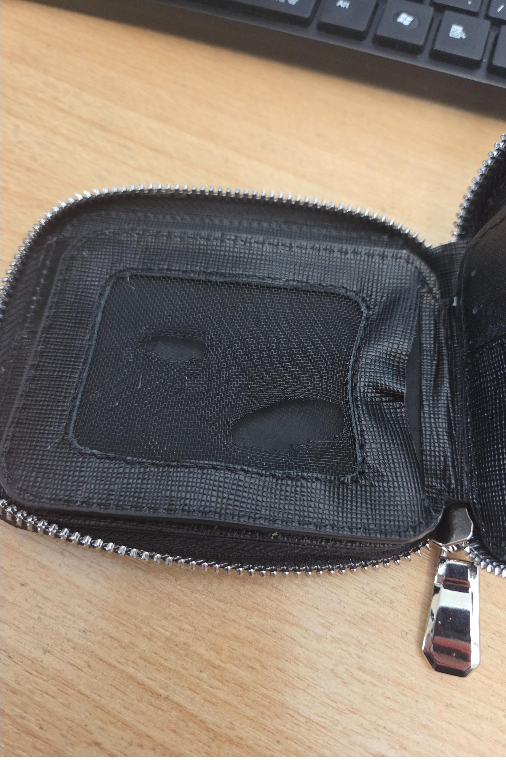 با توجه به اینکه مجموعه تولیدی ما برای برندهای مطرح محصولات تمام چرم طبیعی تولید میکند، این کیف جیبی همانطور که در عکس شماره 2 مشخص است قسمت توری عکس به هنگام چک کردن با فندک جمع شده است که باعث عدم تایید در تیم کنترل کیفیت مجموعه تولیدی ما شده است .