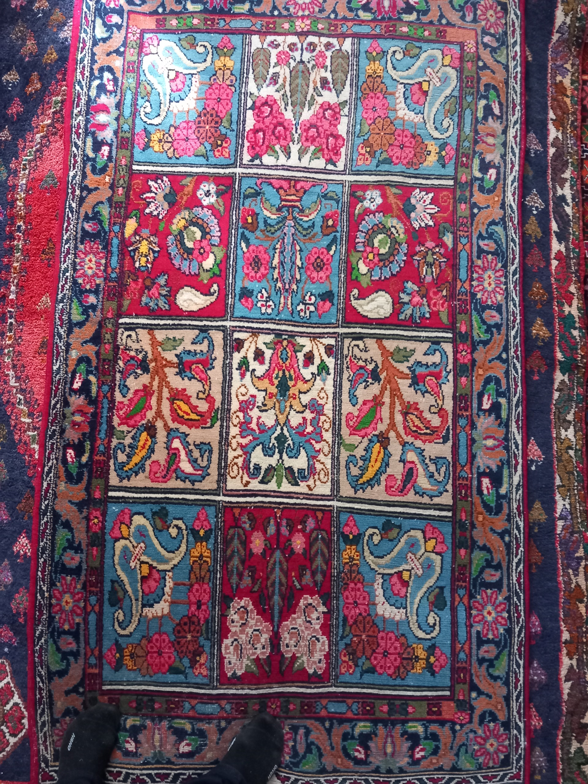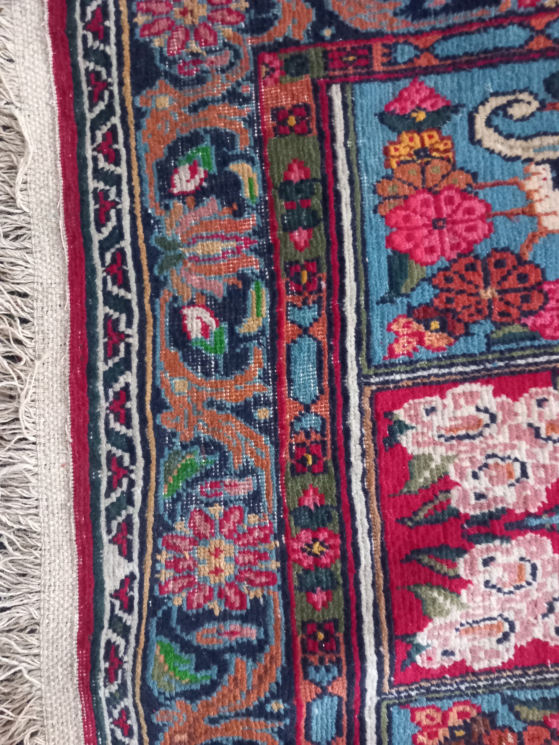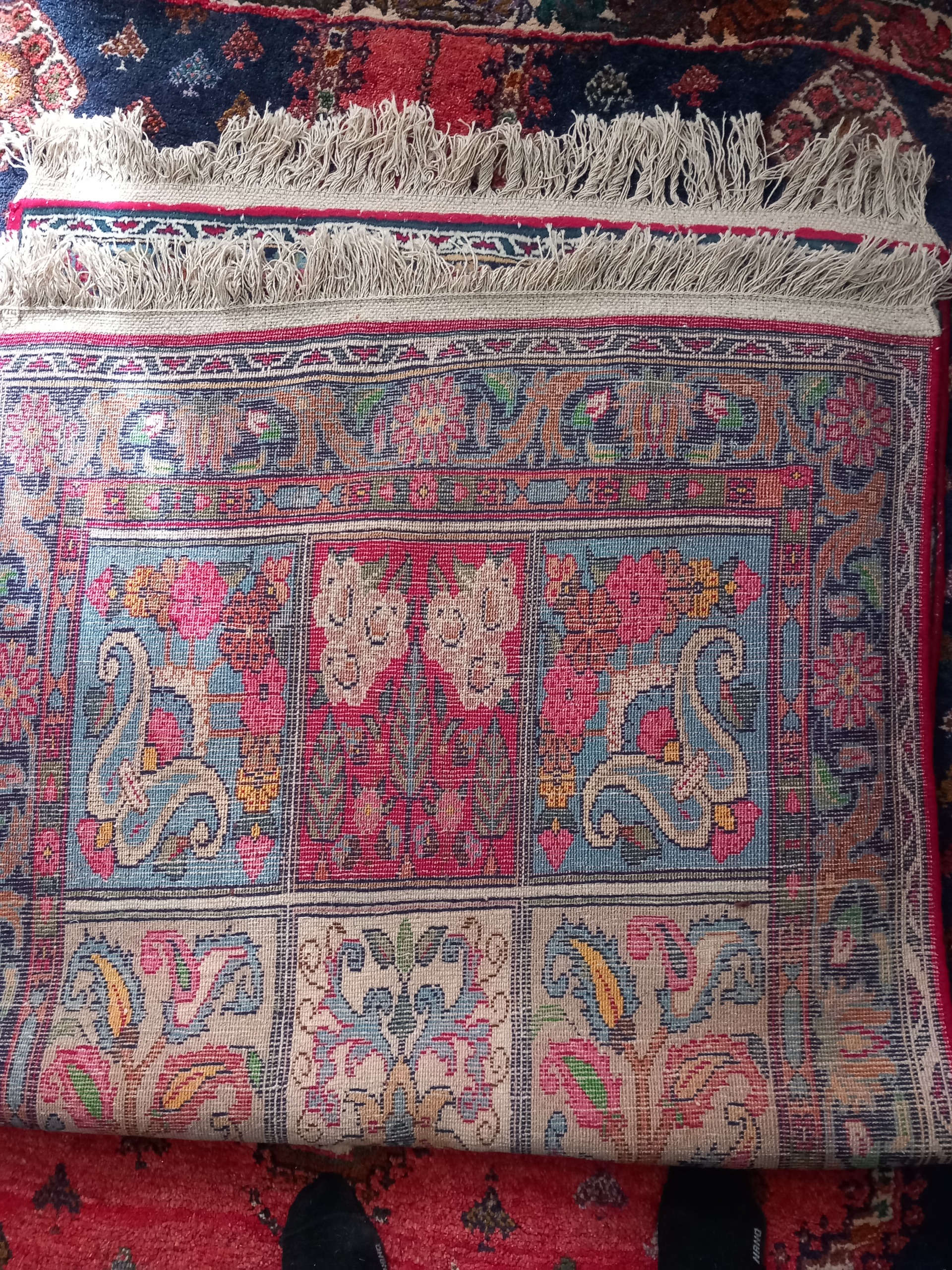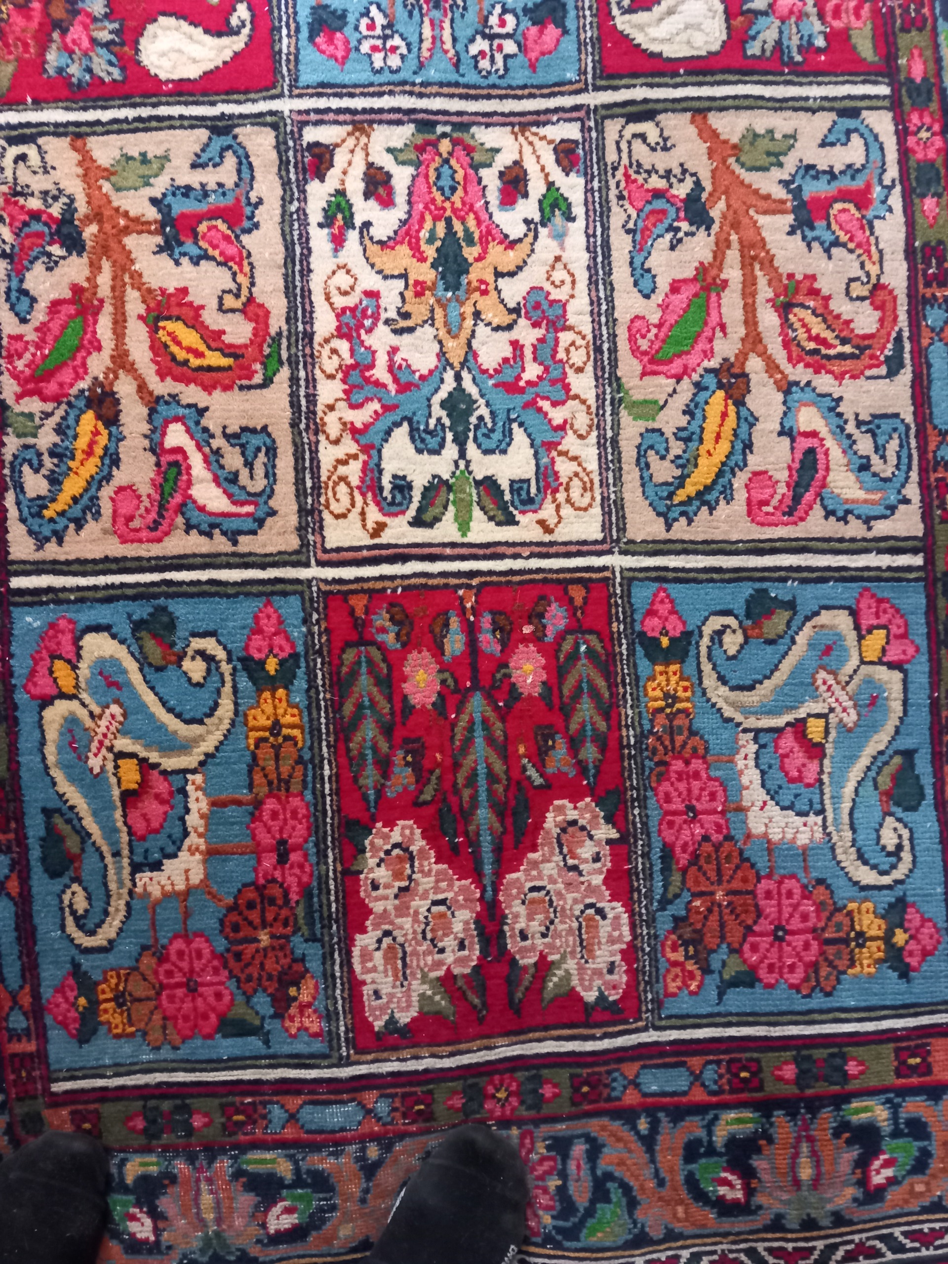 قالیچه دستباف طرح گل با قاب گل ریز بافت با رنگ گیاهی قدیمی پشمی