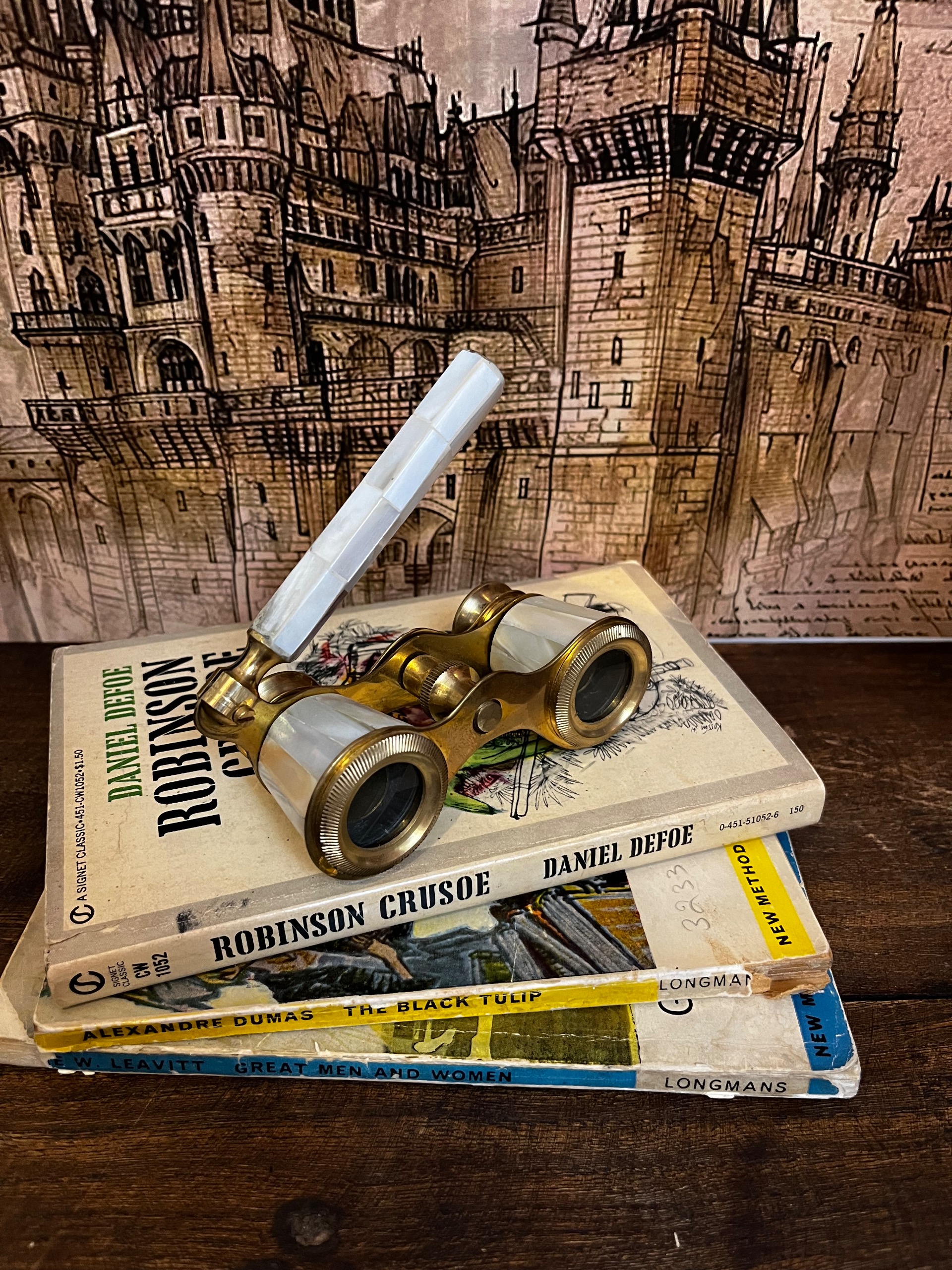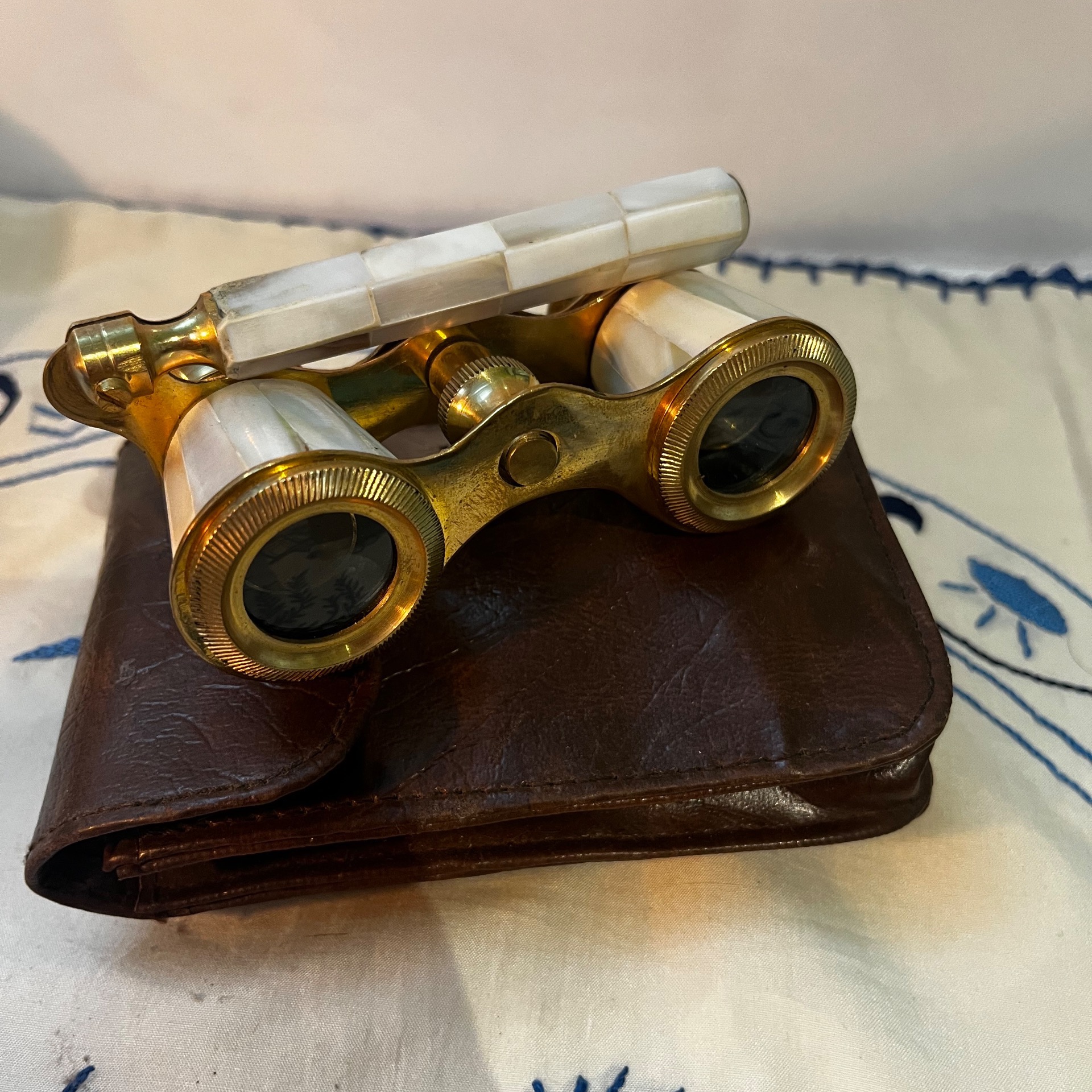 دوربین دوچشم برنجی با دسته های صدف کاری شده همراه با کیف چرمی و دسته جمع شونده با قابلیت تنظیم عدسی ساخت هندوستان به طول 10 سانت