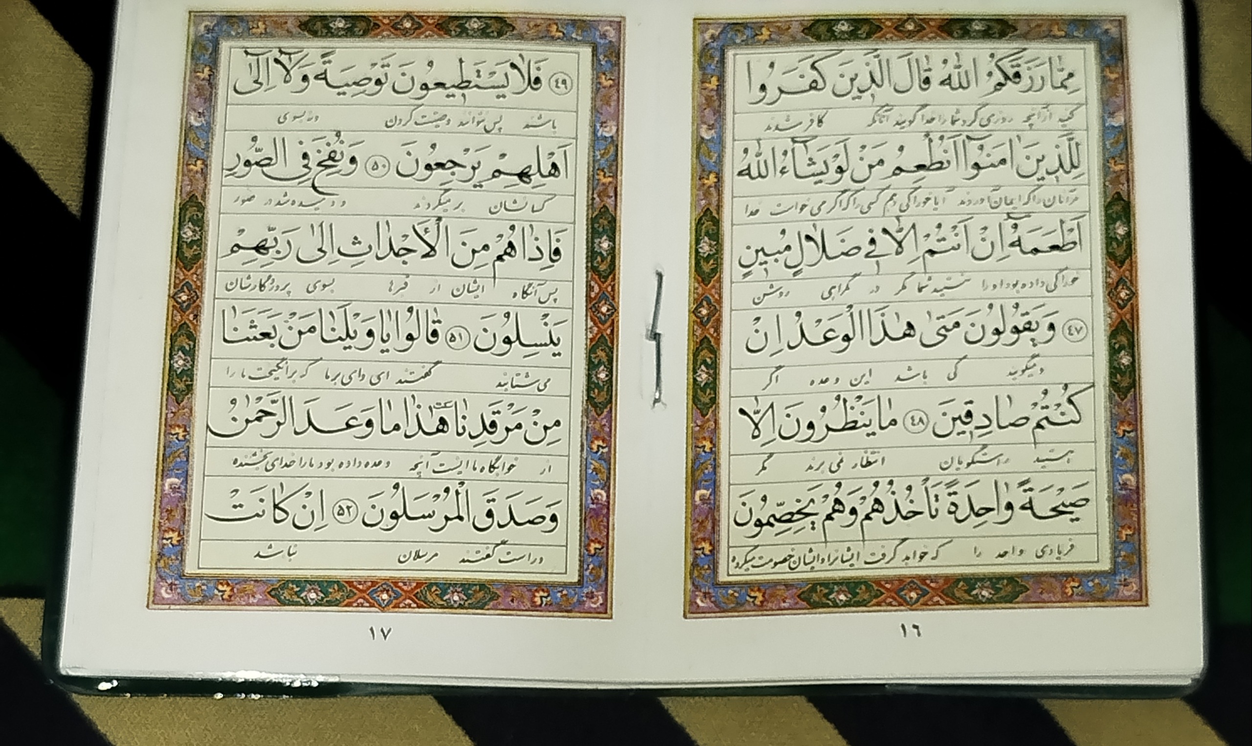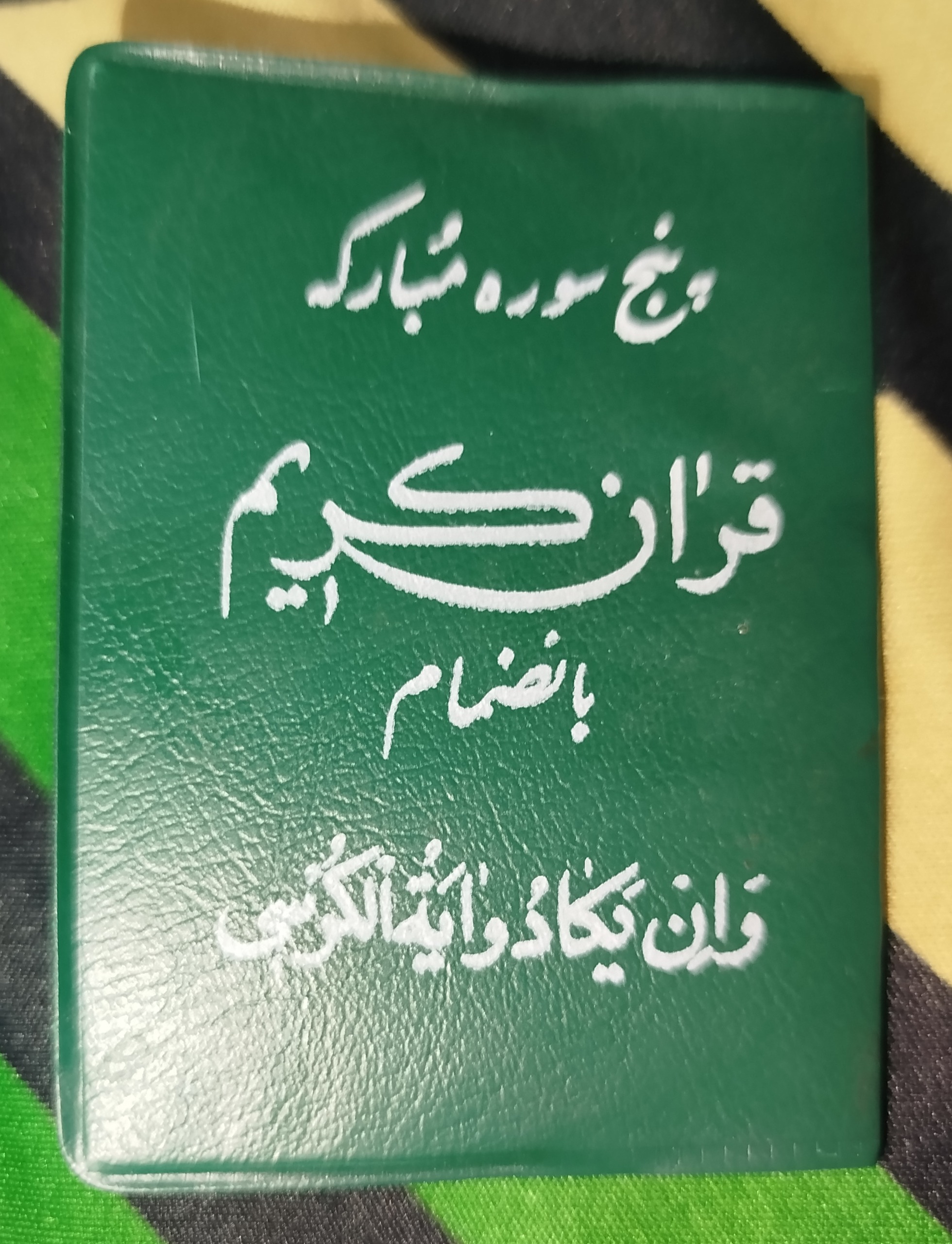 قرآن کلکسیونی کوچک قطع جیبی یک چهارم چاپ تهران 1375 لطفاً تصاویر را زوم شده ببینید و به ابعاد توجه داشته باشید.