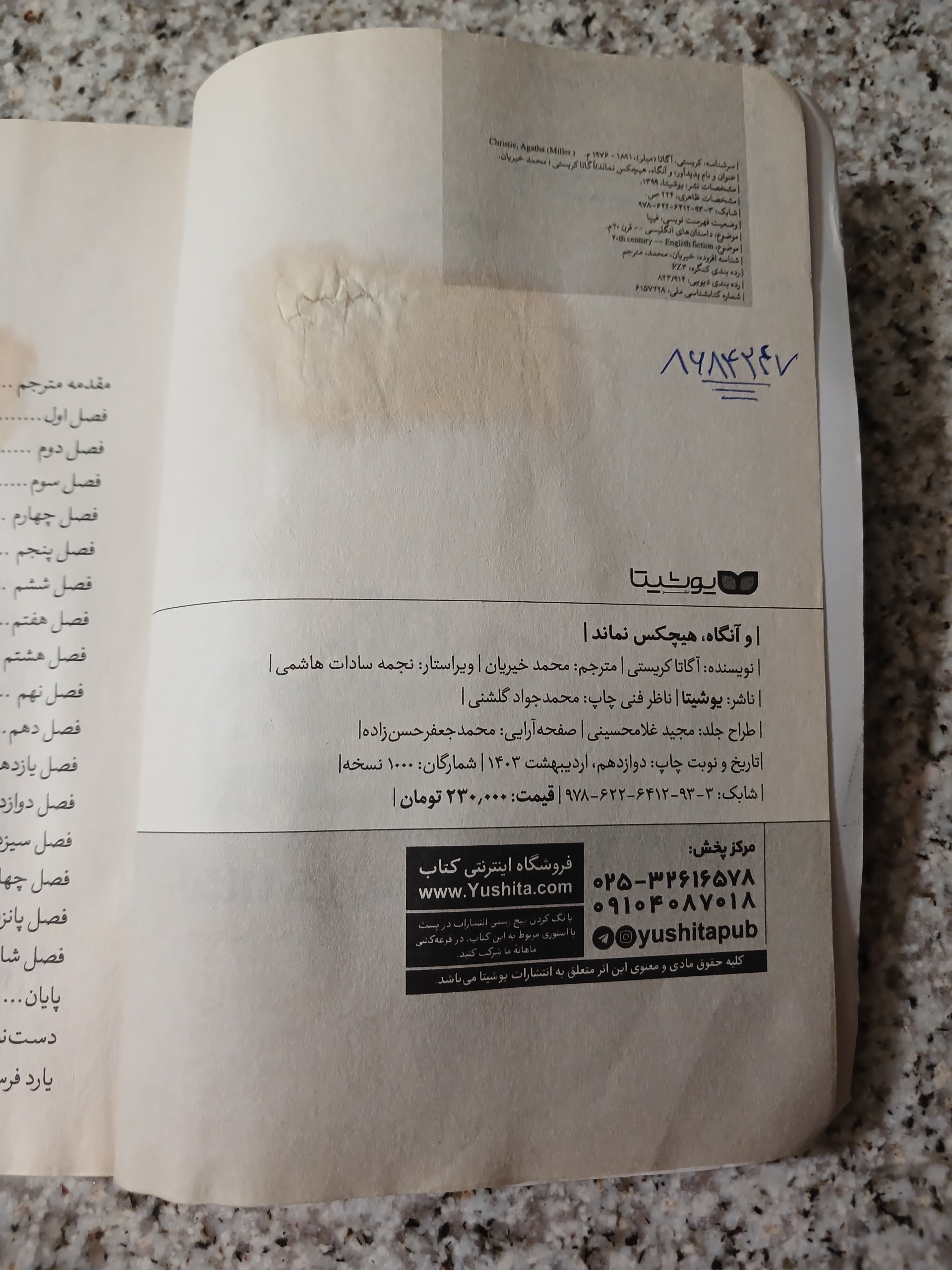 فقط 2 ورق از کتاب اندکی با خودکار نوشته یا لکه ی قهوه ای رنگ یا مهر خوردگی دارد که تصویر آنرا گذاشته ام.