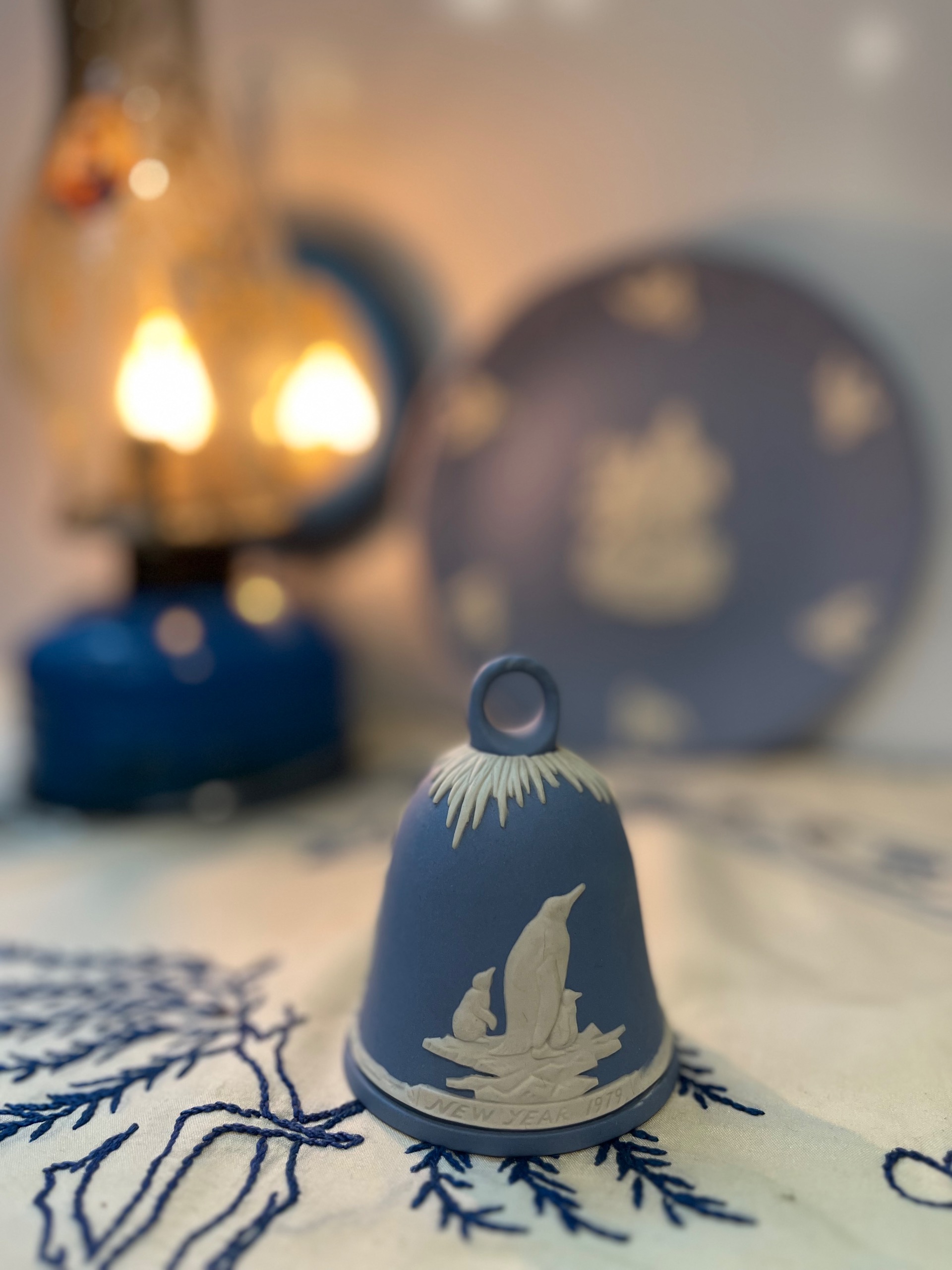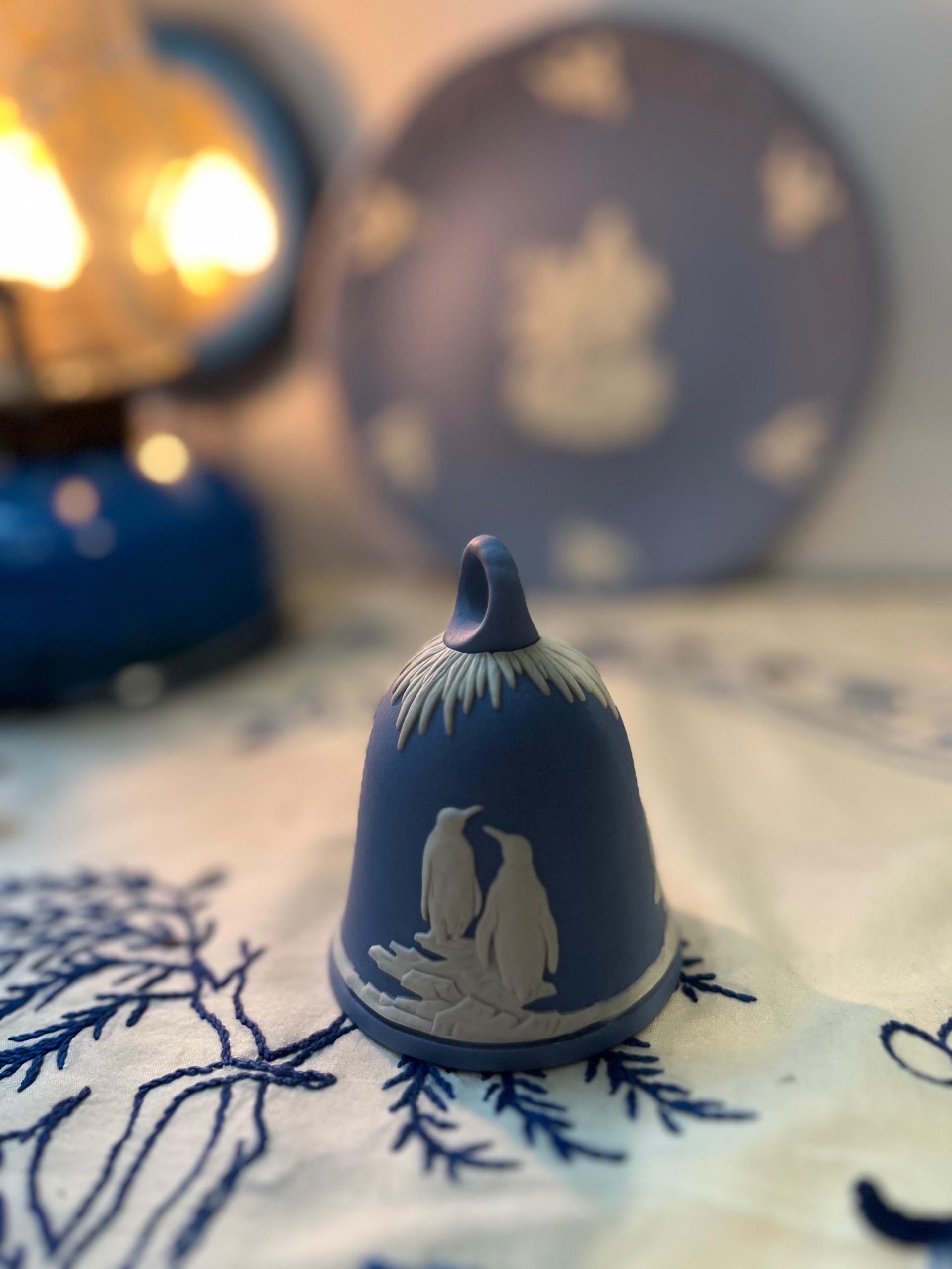 زنگوله وجوود قدیمی با طرح پنگوئن های قطبی به مناسبت سال نو میلادی 1979 ( حک شده ) بدون خط و خش با رنگ خاص ابی سفید و ارتفاع 9 سانتی متر