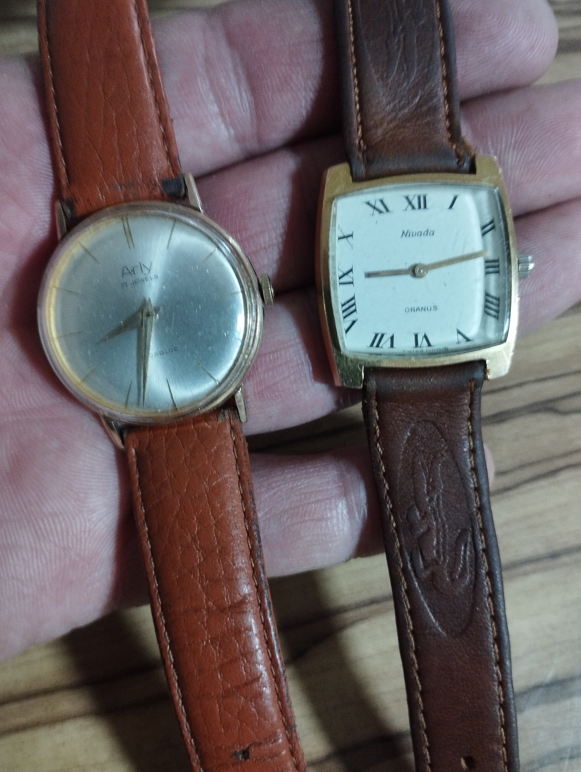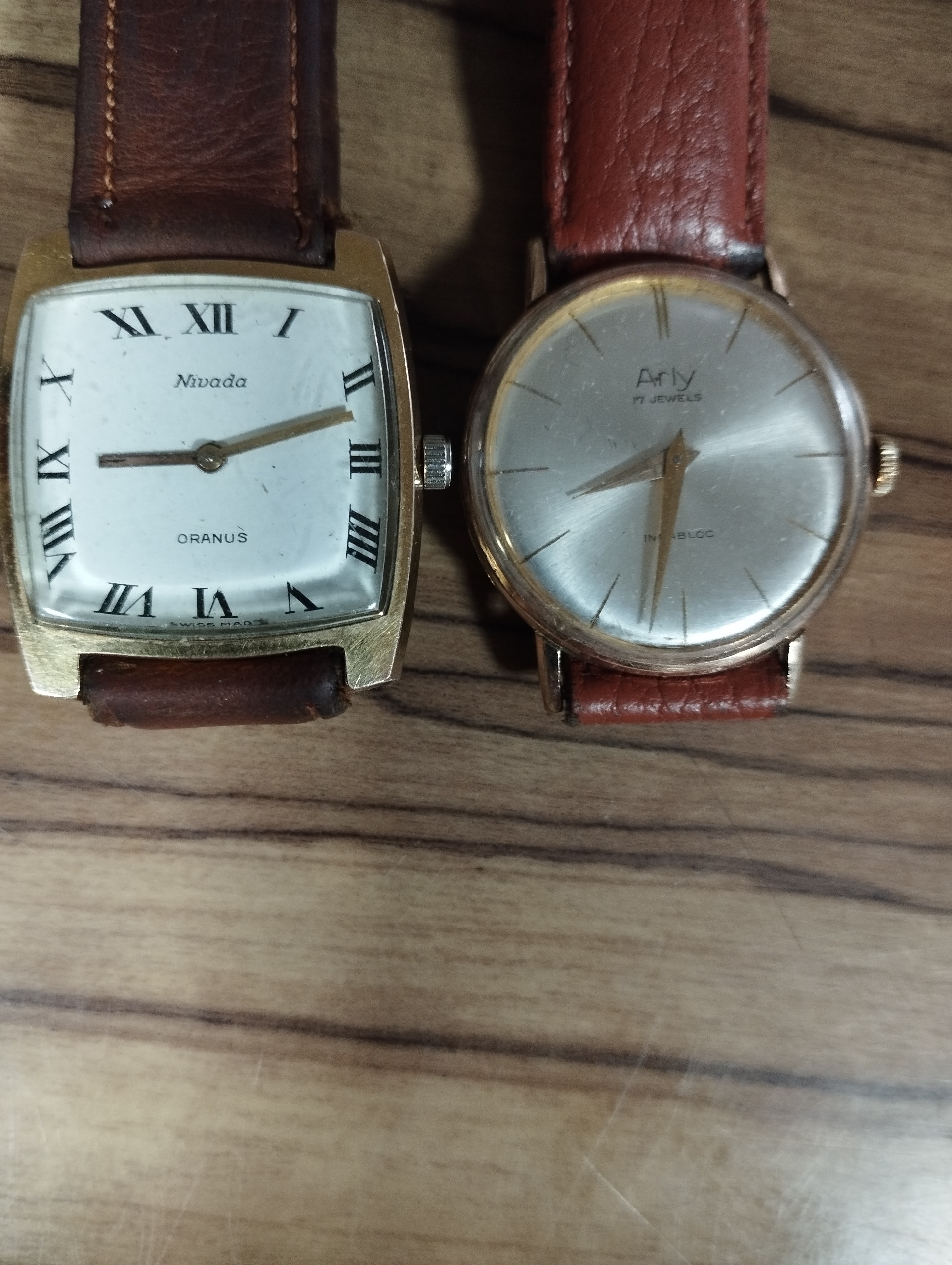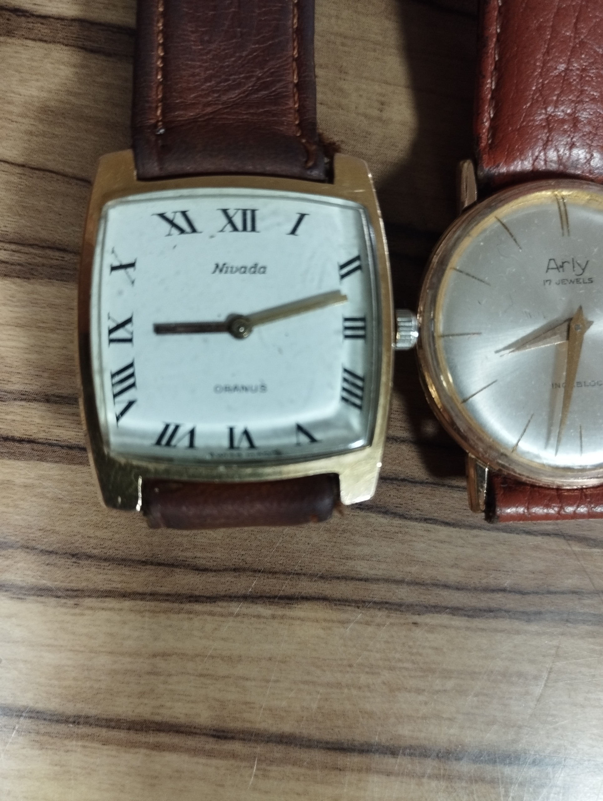 دو عدد ساعت میکرون دار زیبا بدون ریختگی میکرون با صفحه های سالم و در حال کار سلامت کامل یکی از ساعتها با مارک آرلی و دومی نوادا می باشد