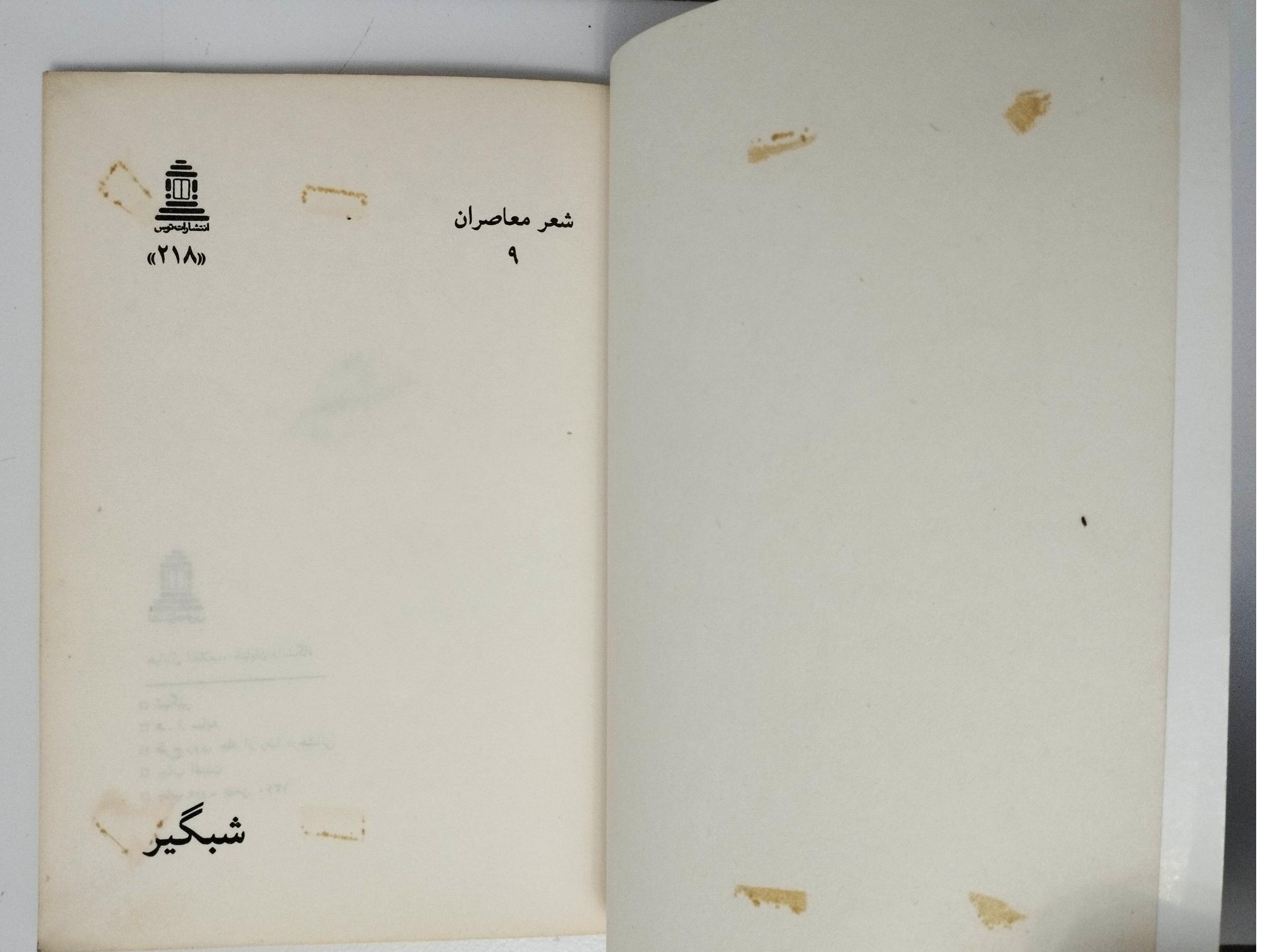 بدلیل قدمت چاپ برخی صفحات و لبه های صفحات دارای لکه و زدگی و تاخوردگی می باشند.