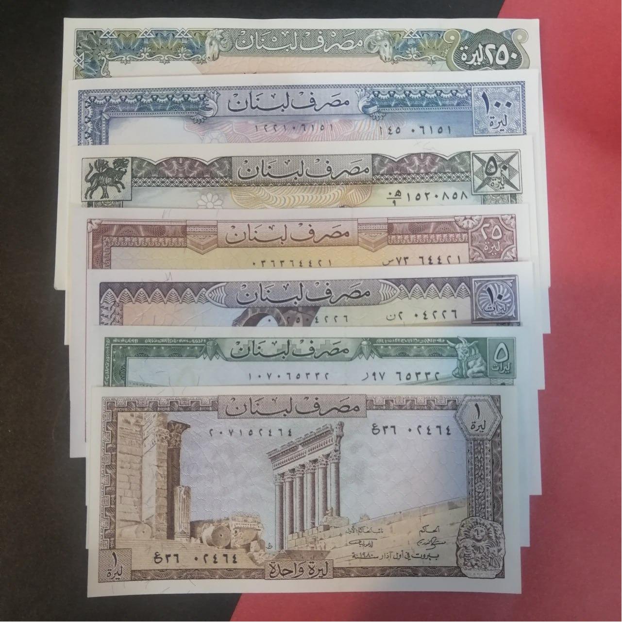 ست زیبا و ارزشمند شامل 7 قطعه اسکناس قدیمی لبنان از بانک مرکزی لبنان (مصرف لبنان)، با طرحهای کلاسیک، معماری تاریخی و نقوش سنتی.