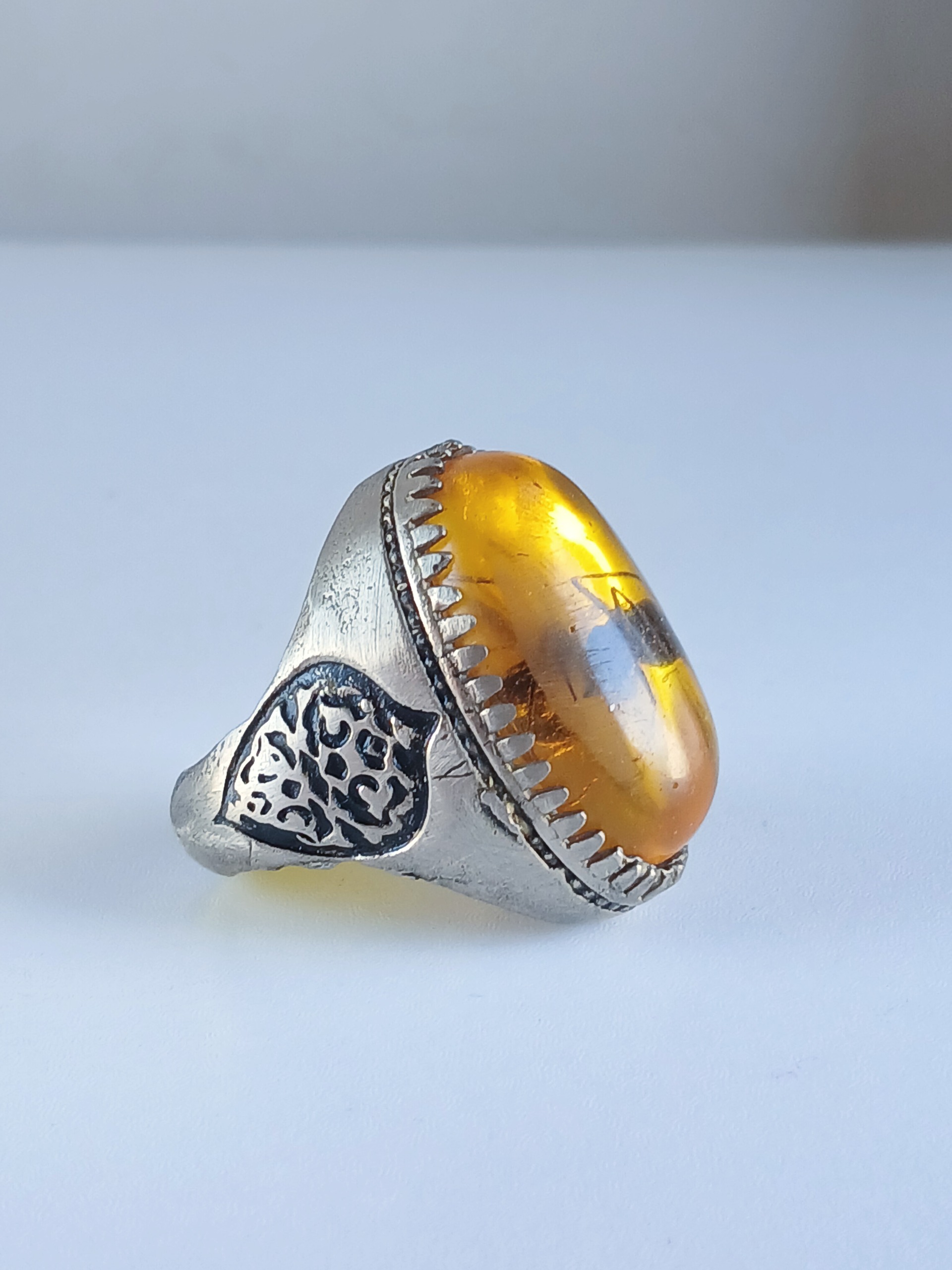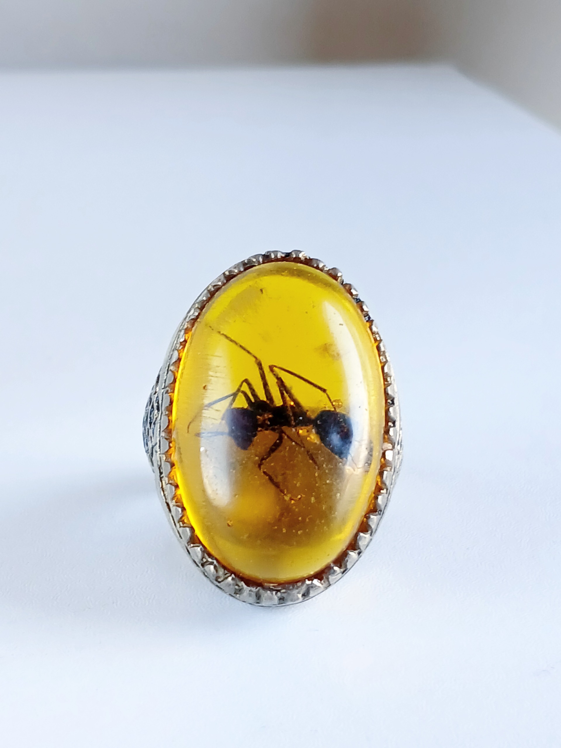 انگشتر کهربا رزینی طلایی مورچه دار درشت