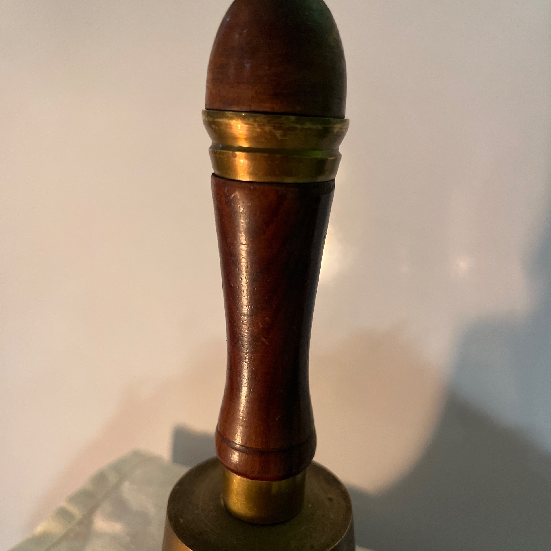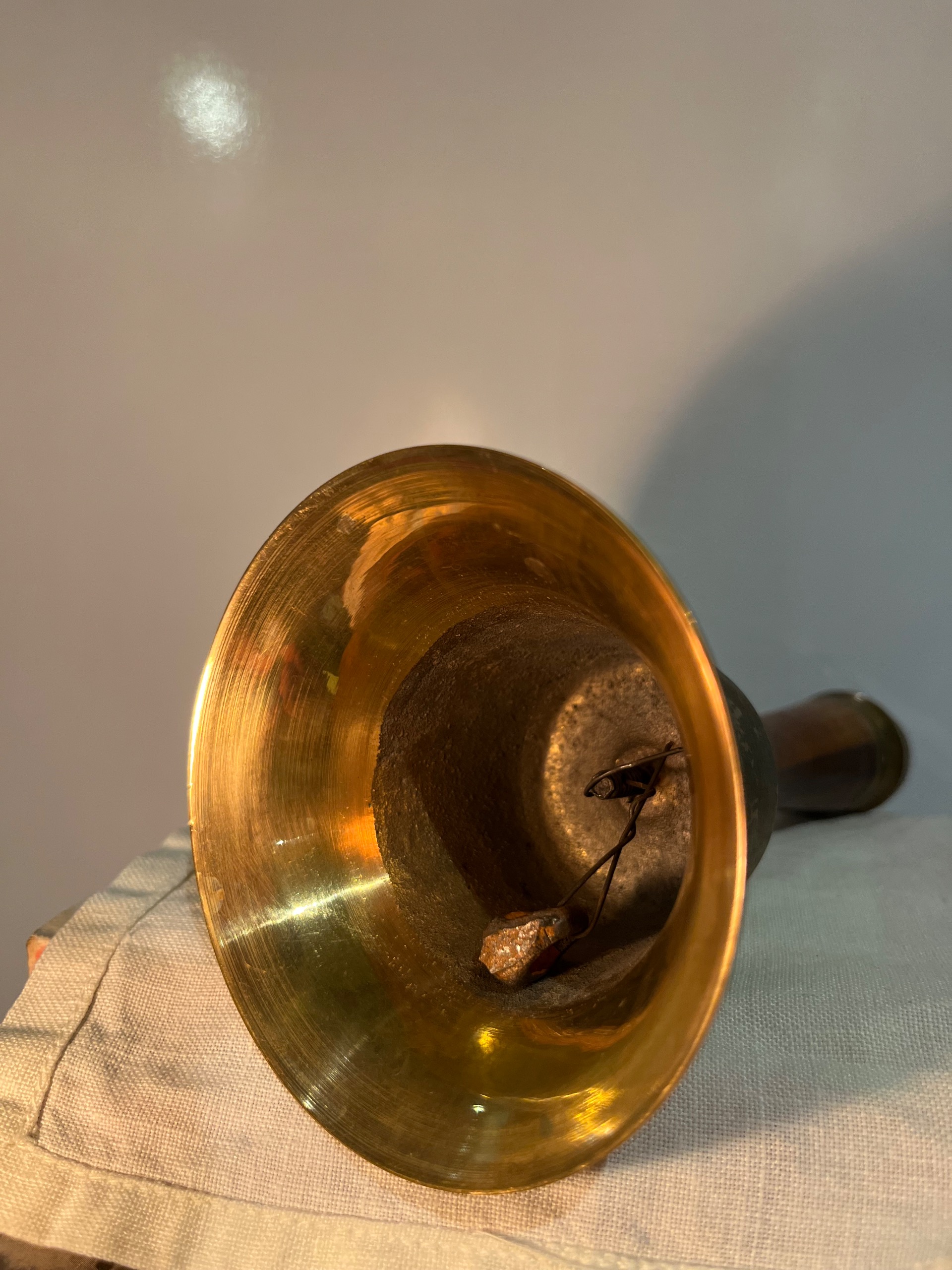 زنگوله اروپایی قدیمی با بدنه برنجی و دسته تلفیق برنج و چوب . مورد استفاده در کلیسا و صدای کلیسایی بوده و ارتفاع کار هم 18 سانتی متر می باشد