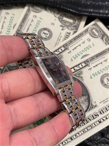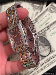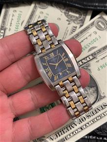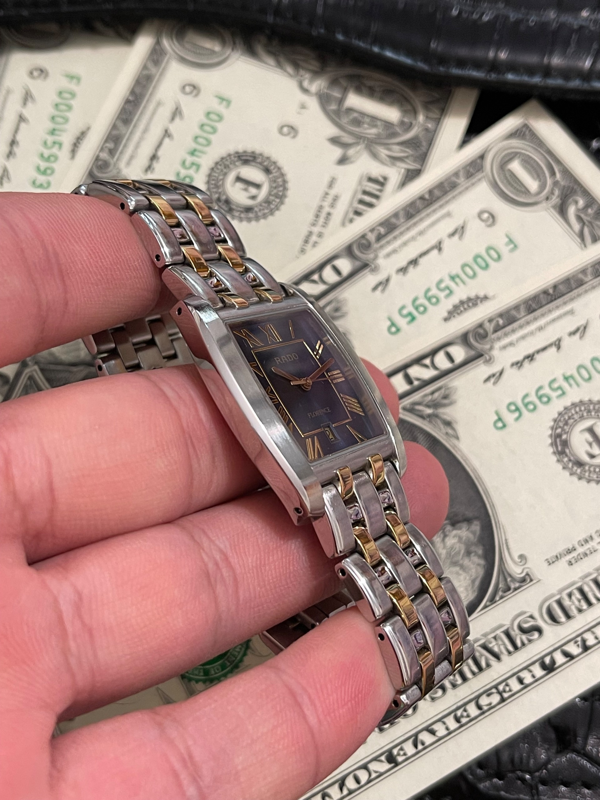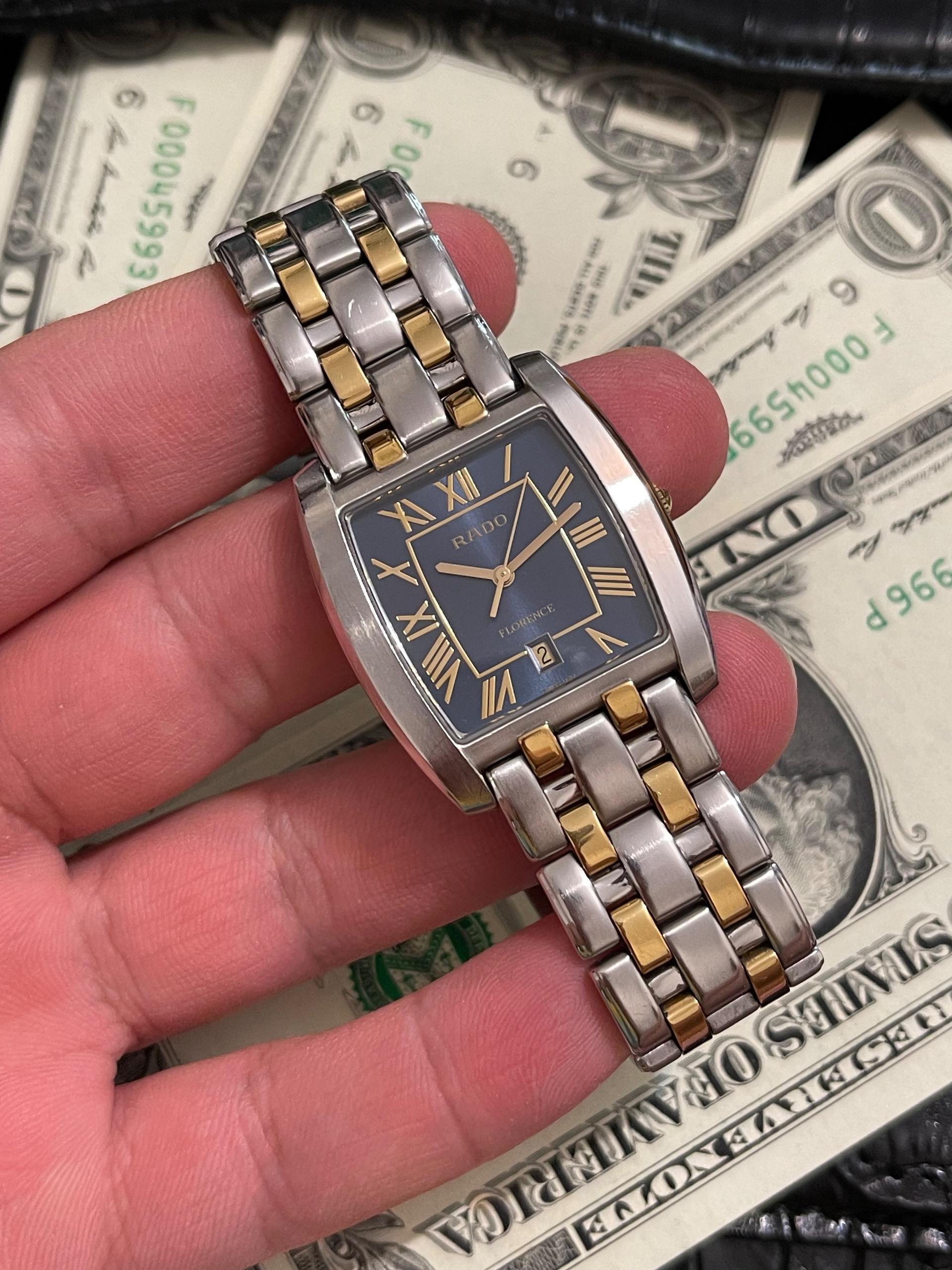ساعت رادو اورجینال مدل بسیار خاص و زیبا فلورانس کلاسیک کمیاب ترین رنگ صفحه سرمه ای و بند دو رنگ دارای موتور کوارتز و تقویم نواری شیشه رفلکس همراه با جعبه فابریک بزرگ رادو ساعت فوق مشابه نو میباشد و بسیار کم مورد استفاده قرار گرفته است باتری ساعت به تازگی در نمایندگی رسمی تعویض شده است