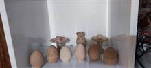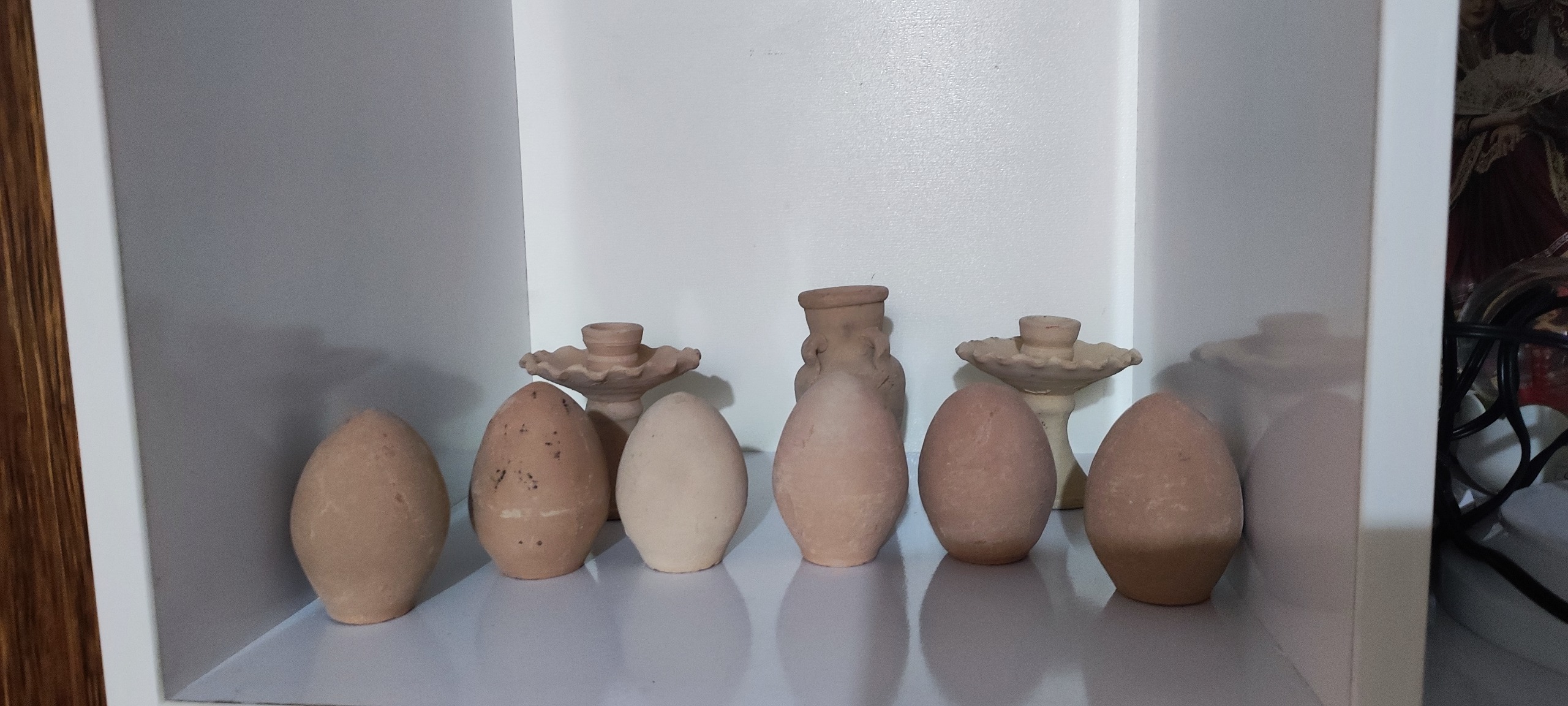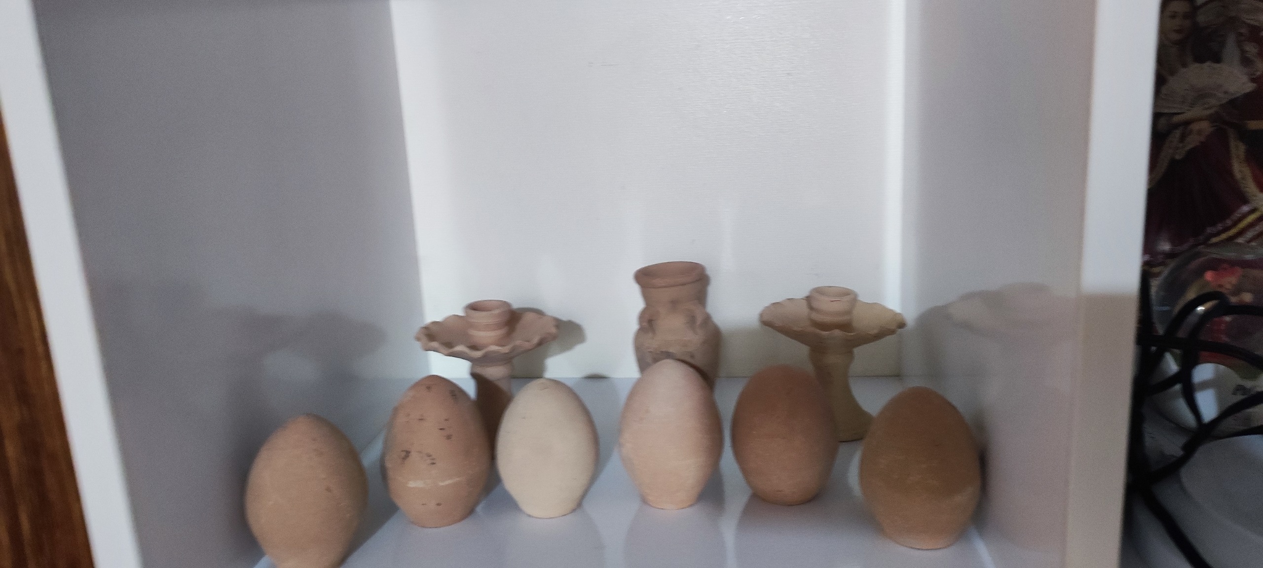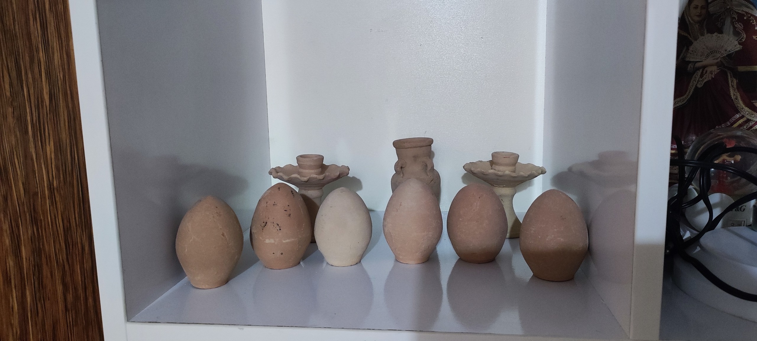 6 عدد تخم مرغ سفالی +دو عدد جا شمعی سفالی + یک عدد کوزه سفالی