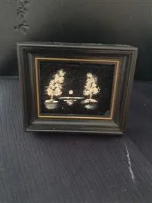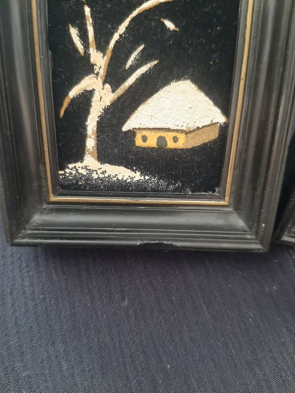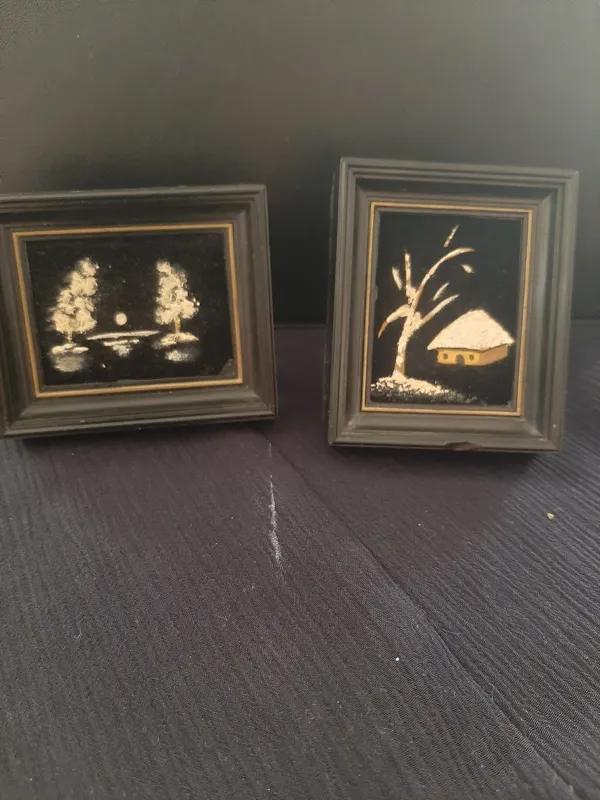 دو عدد تابلو پلاستیکی نقاشی روی مخمل دکوری کوچک ابعاد 5 و نیم در 6 و نیم عمودی و افقی لبه یکی پریدگی دارد دست دوم
