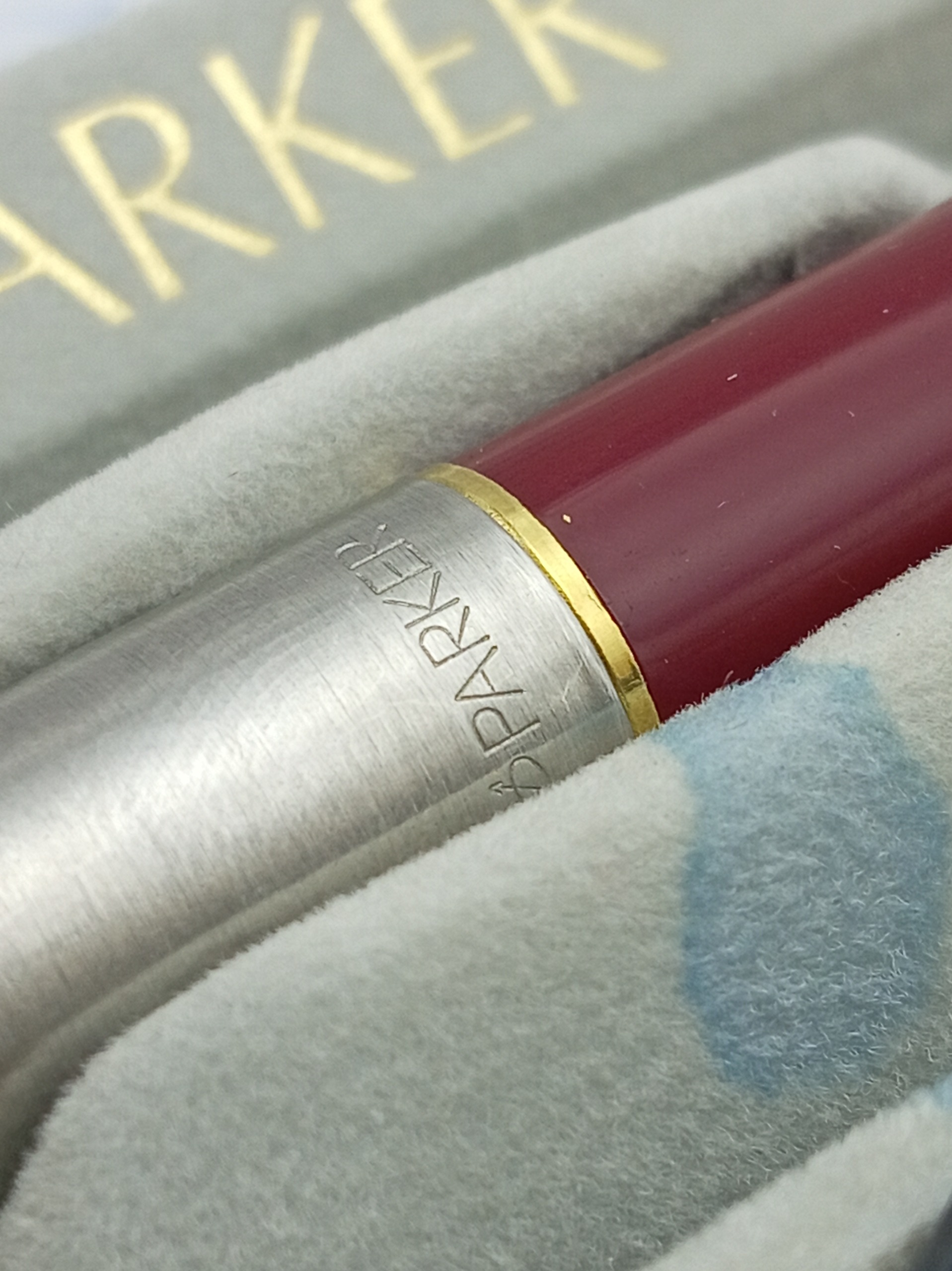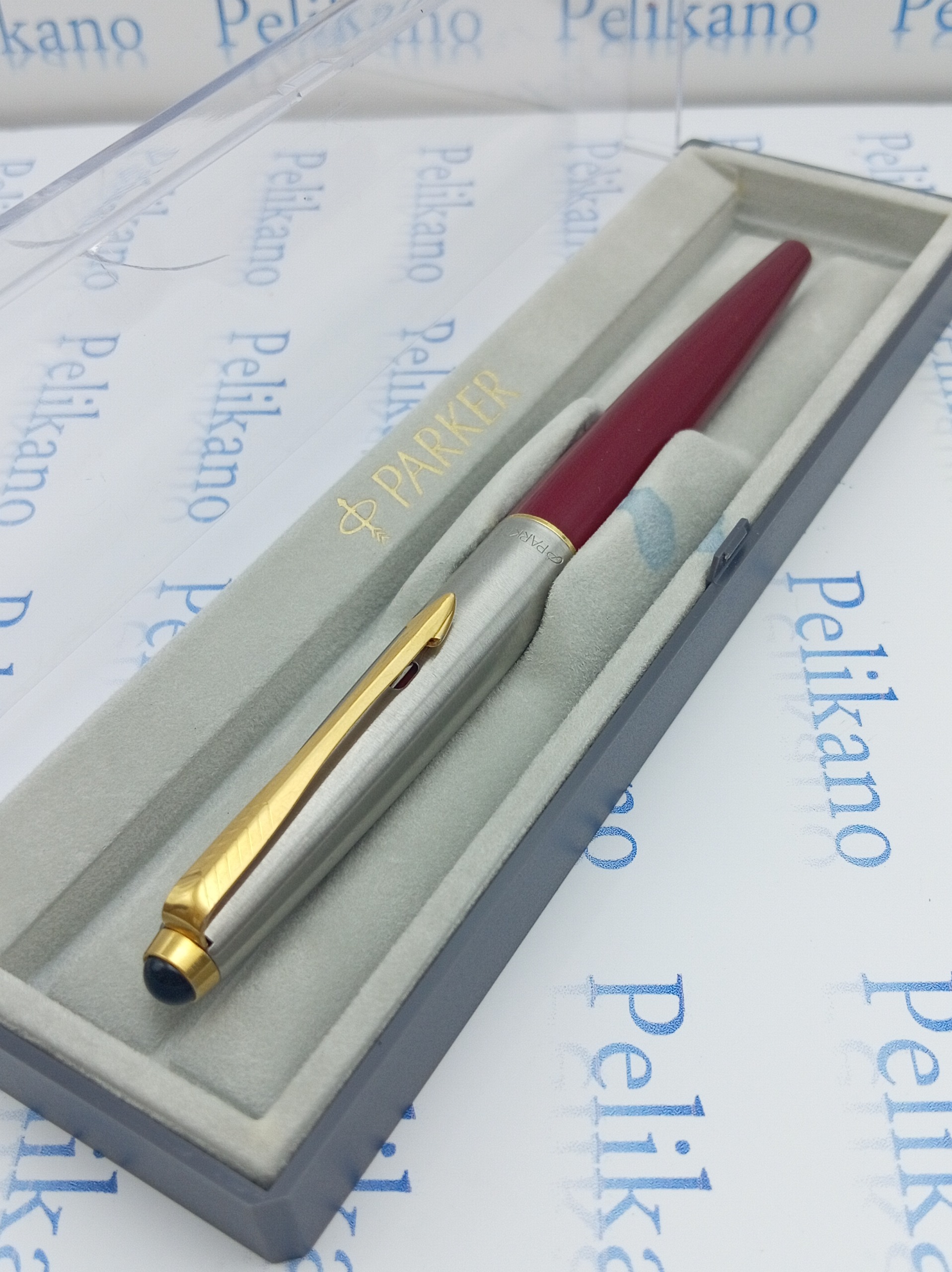 خودنویس پارکر 45 ترکیب قرمز و طلایی بسیار چشمنواز، پمپ نو مکشی دارد، فقط جعبه ضعف دارد که در تصاویر نمایش داده شده است.