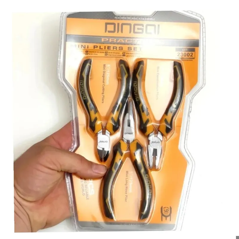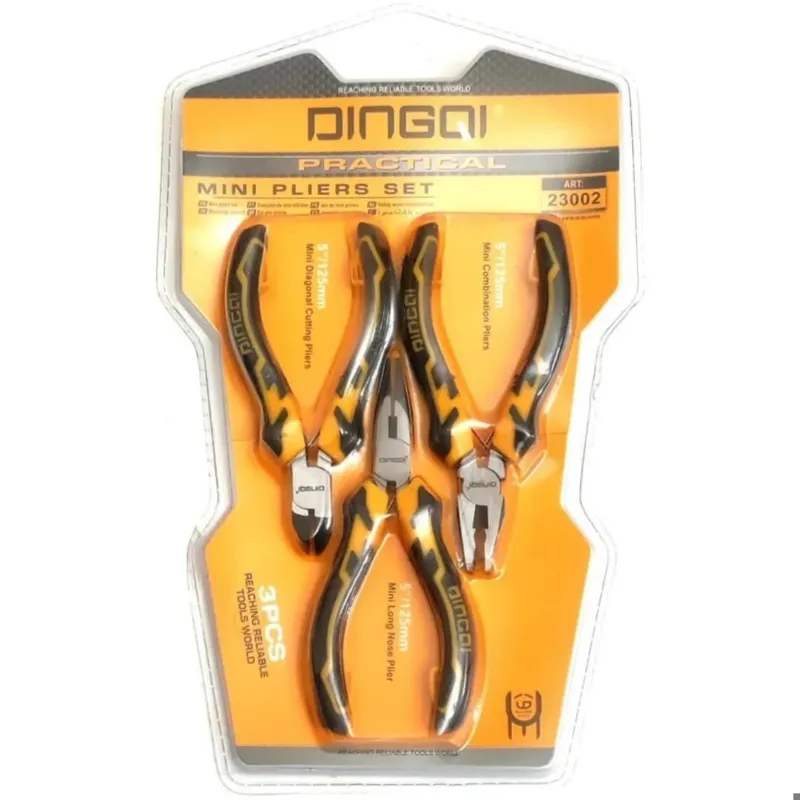 مجموعه 3 عددی ابزار الکترونیکی DINGQI بسیار با کیفیت با ااستاندارد اروپا ساخت کشور چین شامل انبردست دمباریک و سیم چین 5 اینچی الکترونیکی از جنس کروم وانادیوم برای کلیه مصارف و تعمیرات الکترونیکی