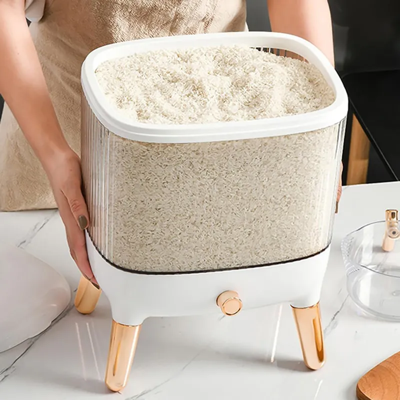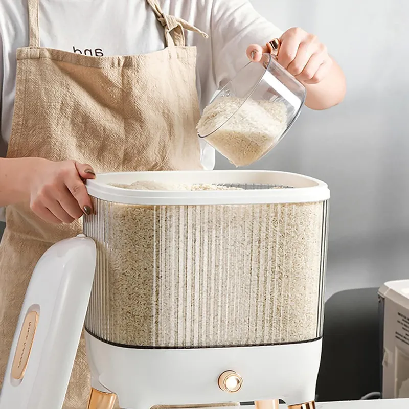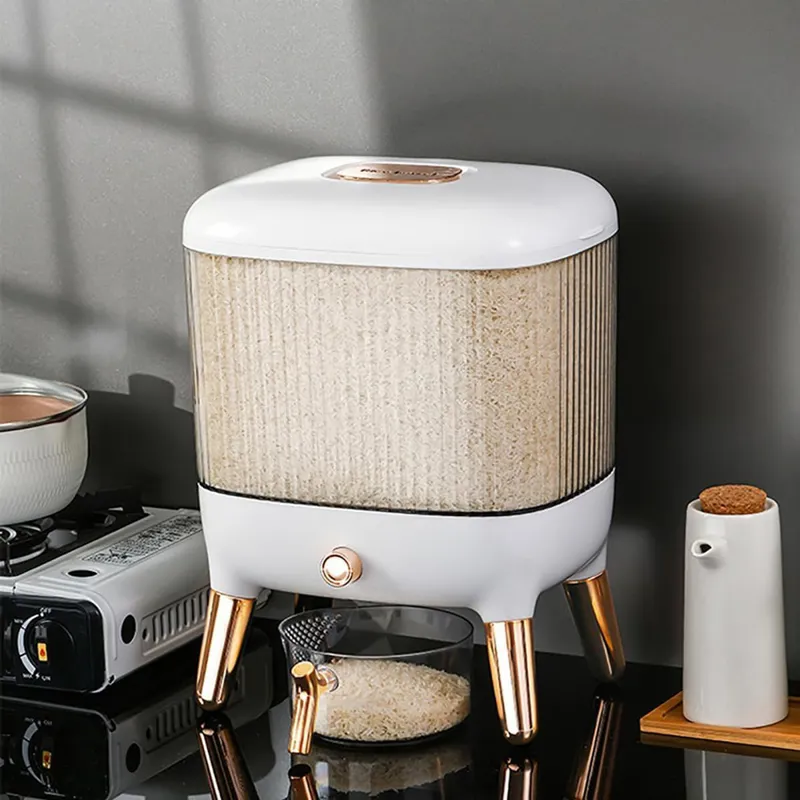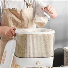 محصولی متفاوت با طراحی ظاهری منحصر به فرد که امکان استفاده از آن بر روی کابینت و یا میز آشپزخانه جهت دسترسی ساده و سریع به برنج و البته ایجاد شمایل ظاهری مناسب ، ویژه چیدمان آشپزخانه را دارد . ظرف برنج جدید ، دارای یک محفظه اصلی شفاف با ظرفیت جای دادن 10 کیلوگرم برنج درون خود می باشد ، بنابراین قادر خواهید بود از بیرون میزان برنج داخل محفظه را مشاهده کنید . دهانه محفظه با استفاده از یک درب بسته می شود ، دربی که در قسمت میانی خود محفظه ای کوچک را برای جای دادن حبه های سیر ، میخک و موادی مشابه برای نگهداری سالم برنج به دور از آفت و حشره ، با درب مجزا دارد . خروجی برنج در زیر محفظه اصلی تعبیه شده است که با استفاده از دکمه قرار گرفته در قسمت جلو باز و بسته می شود ، کافی است پیمانه دسته دار همراه محصول را در زیر خروجی گذاشته و دکمه را فشار دهید تا به میزان دلخواه بتوانید برنج بردارید . بدنه پیمانه کاملاً شفاف است و لبه آسان ریز آبکشدار دارد ، بدین ترتیب که در صورت نیاز می توانید از آن برای شستشو و آبکشی برنج متناسب با ظرفیت ظرف استفاده کنید . وجود چهار پایه در زیر ظرف نگهداری برنج شیشه ای ارتفاع لازم برای برداشت آسان برنج از خروجی محفظه را نیز فراهم آورده . زیبا ، جذاب ، جادار و کاملاً کاربردی ، ویژگی های بارز ظرف برنج دکمه ای است .