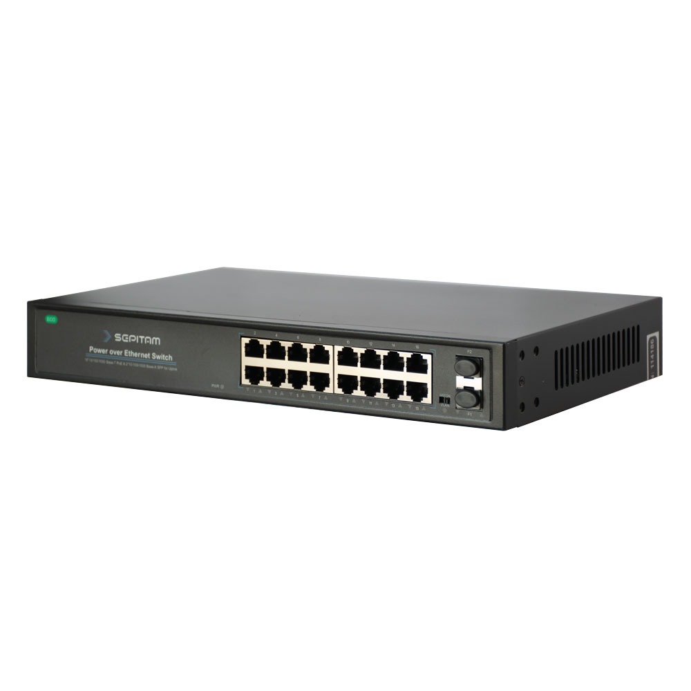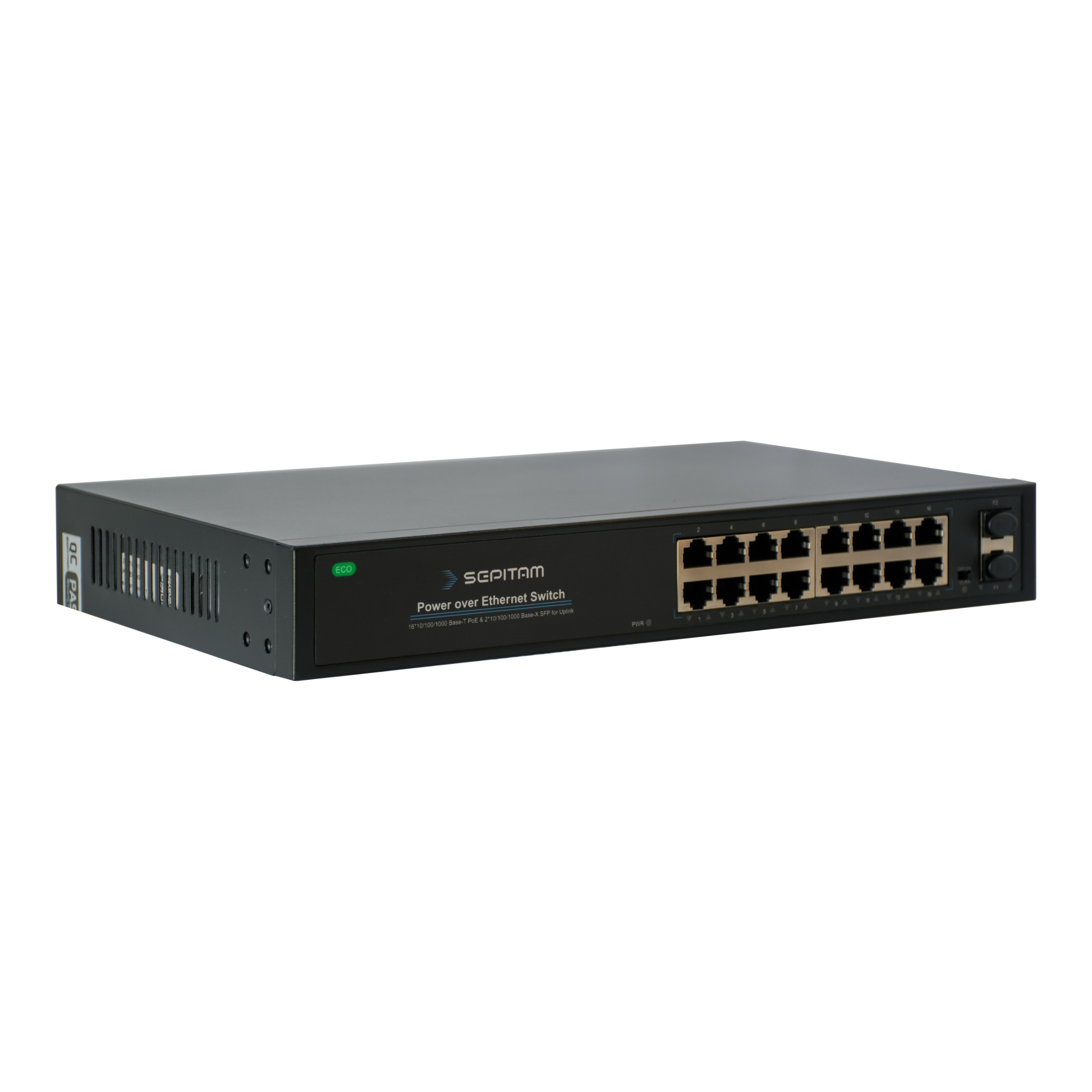 نوع: Sepitam-PS216G-DF-Eco مشخصات فنی Sepitam-PS216G-DF-Eco 16 پورت PoE 10/100/1000Base-T و 2 پورت فیبر SFP 1000Base-X سوئیچ PoE اقتصادی مشخصات