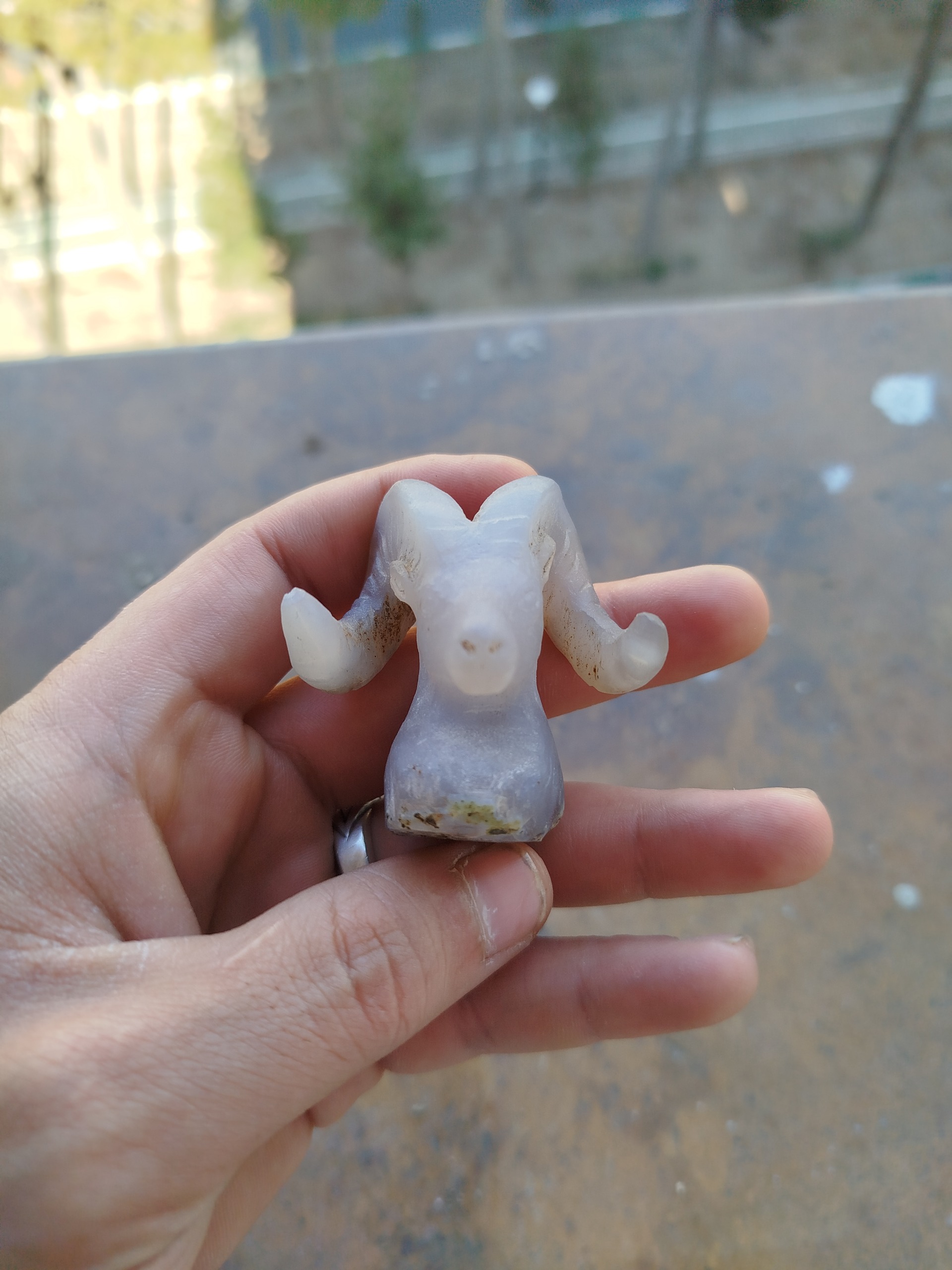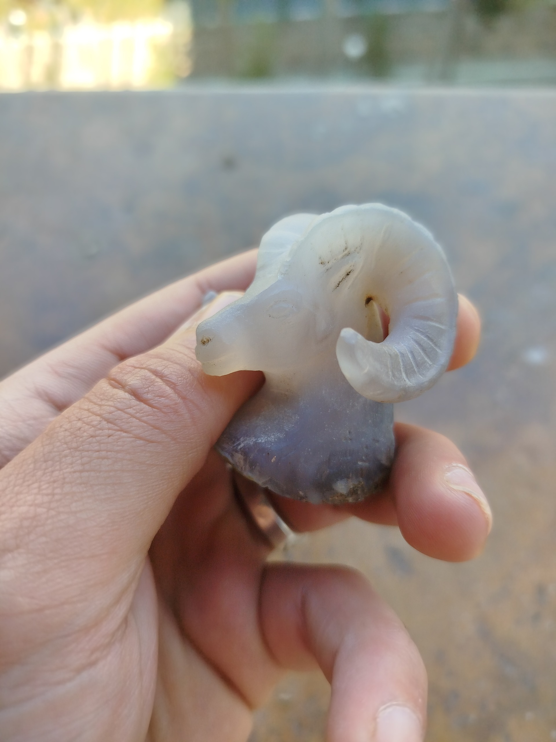 سر قوچ با دو شاخ بصورت حجمی بروی سنگ عقیق کبود تراش خورده