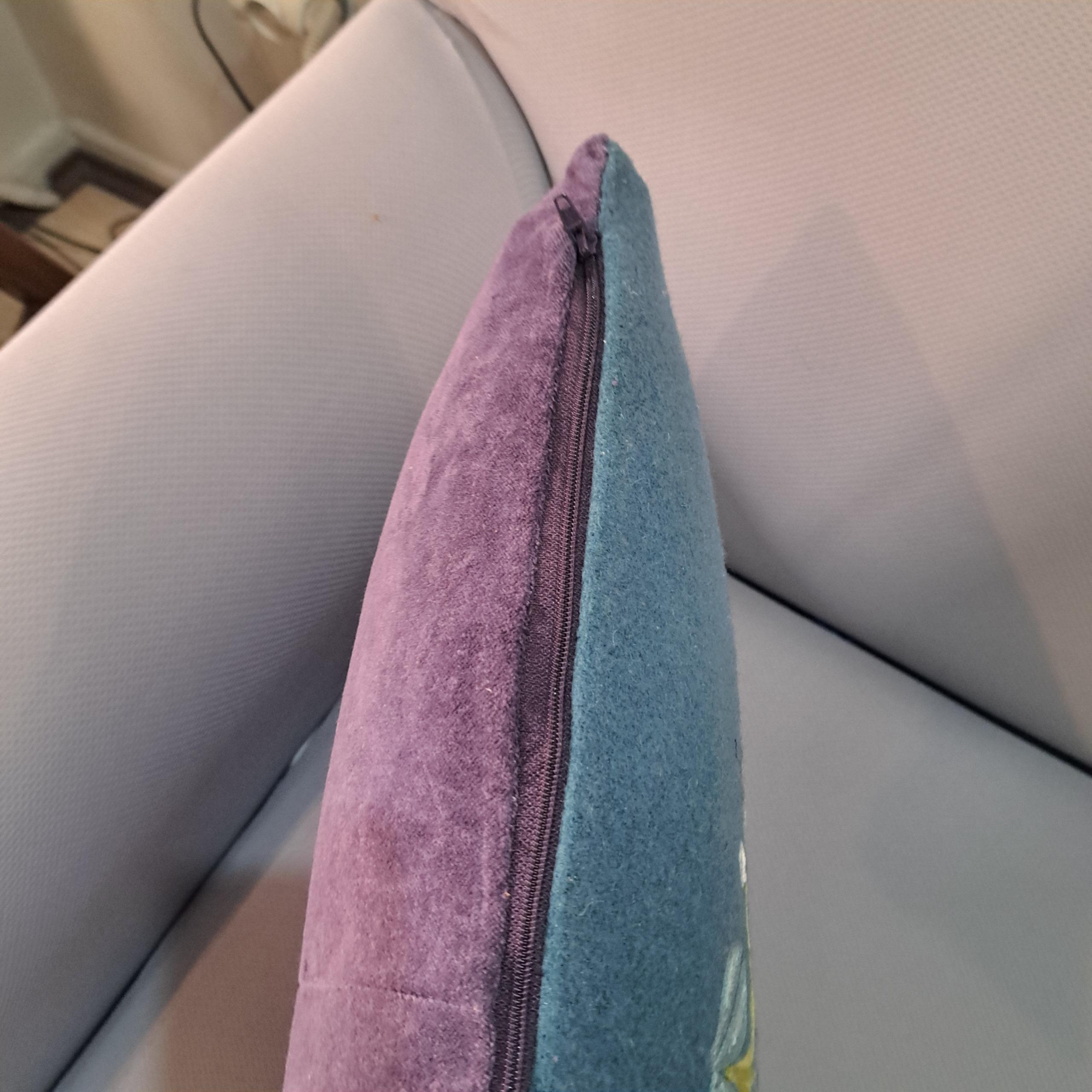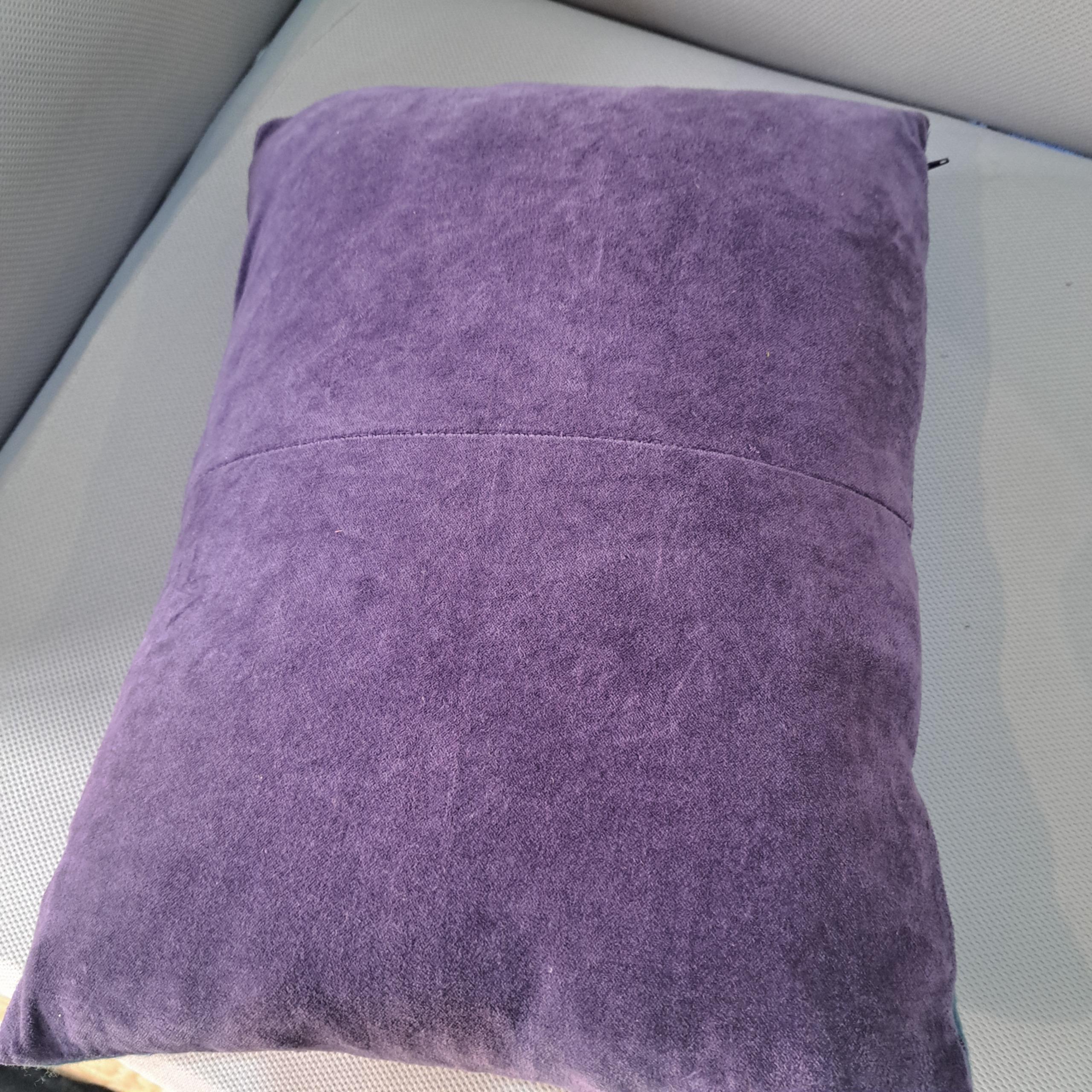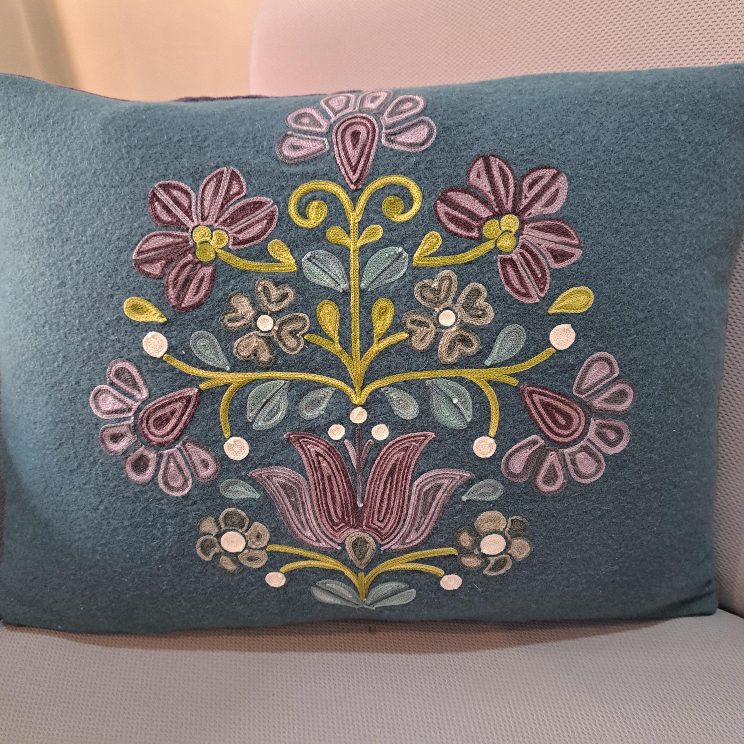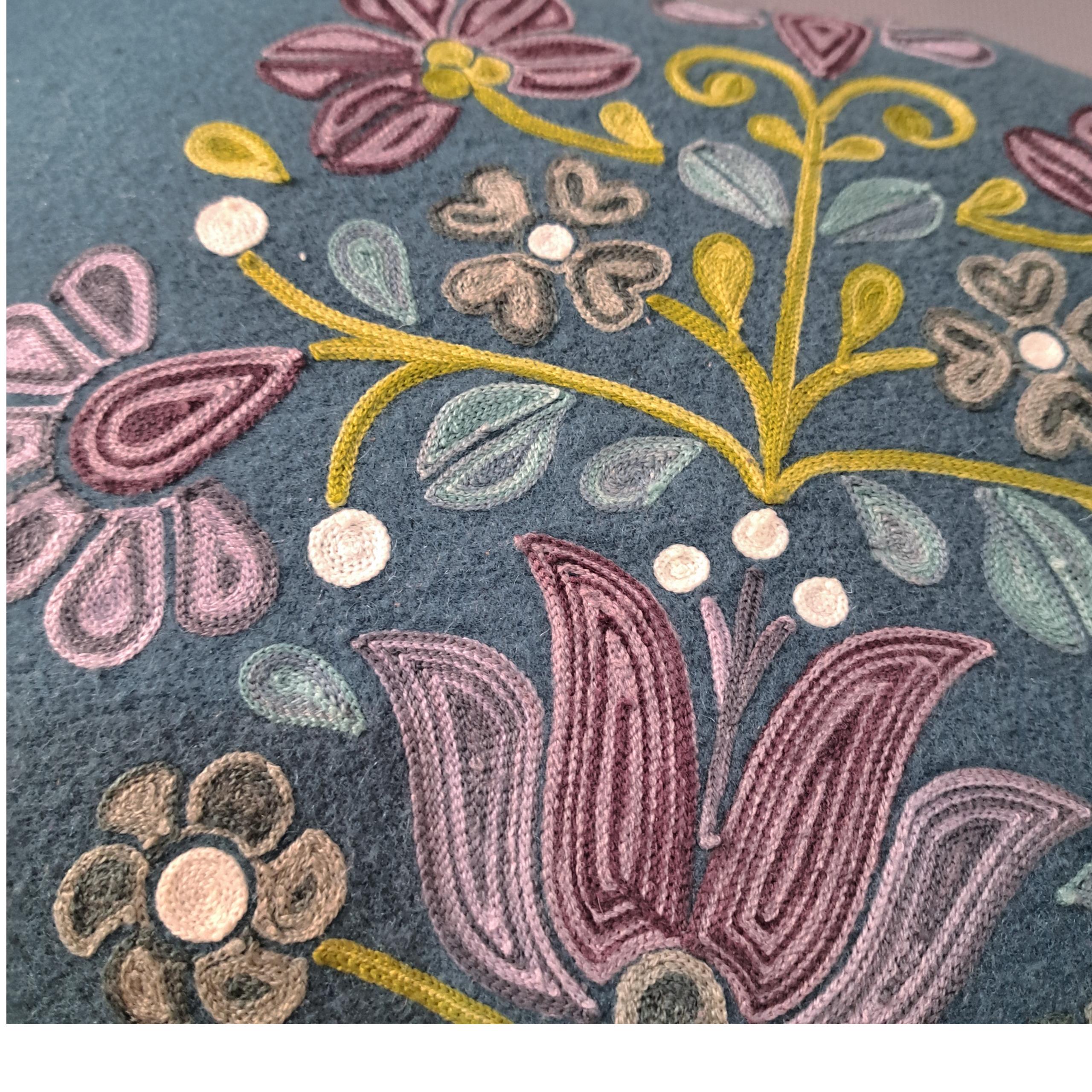 رویه کوسن قدیمی خارجی روی کار نمد ضخیم دوزی شده و گل دوزی ماشینی رنگ سبز آبی پشت کار مخمل بنفش ساده