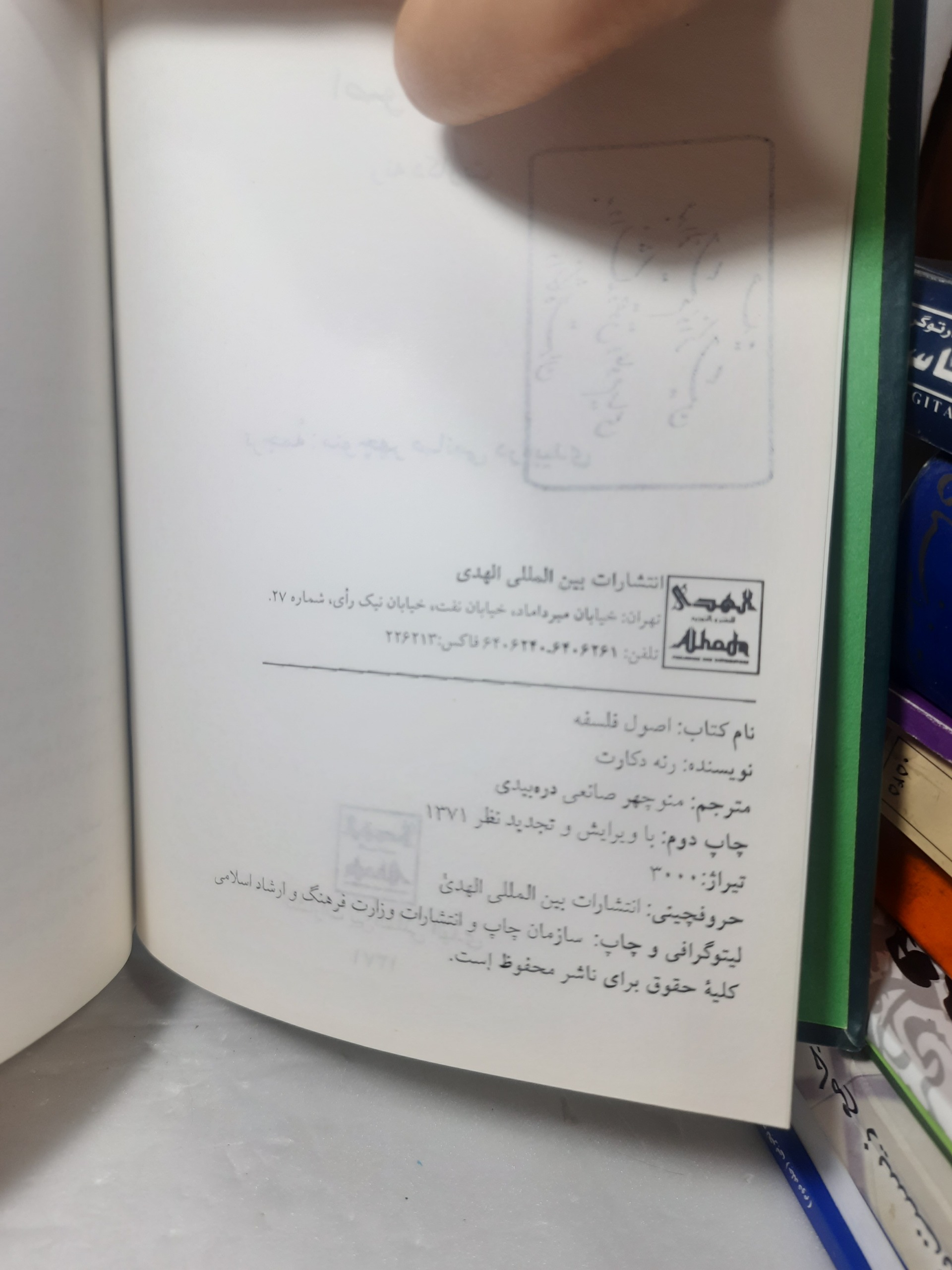 کد 1999 کتاب اصول فلسفه و کتاب فلسفه دکارت اثر رنه دکارت ترجمه منوچهر صانعی دو جلد در یک مجلد چاپ دوم سال 71 انتشارات بین المللی هدی در 580 صفحه جلد صفحات سالم میباشد