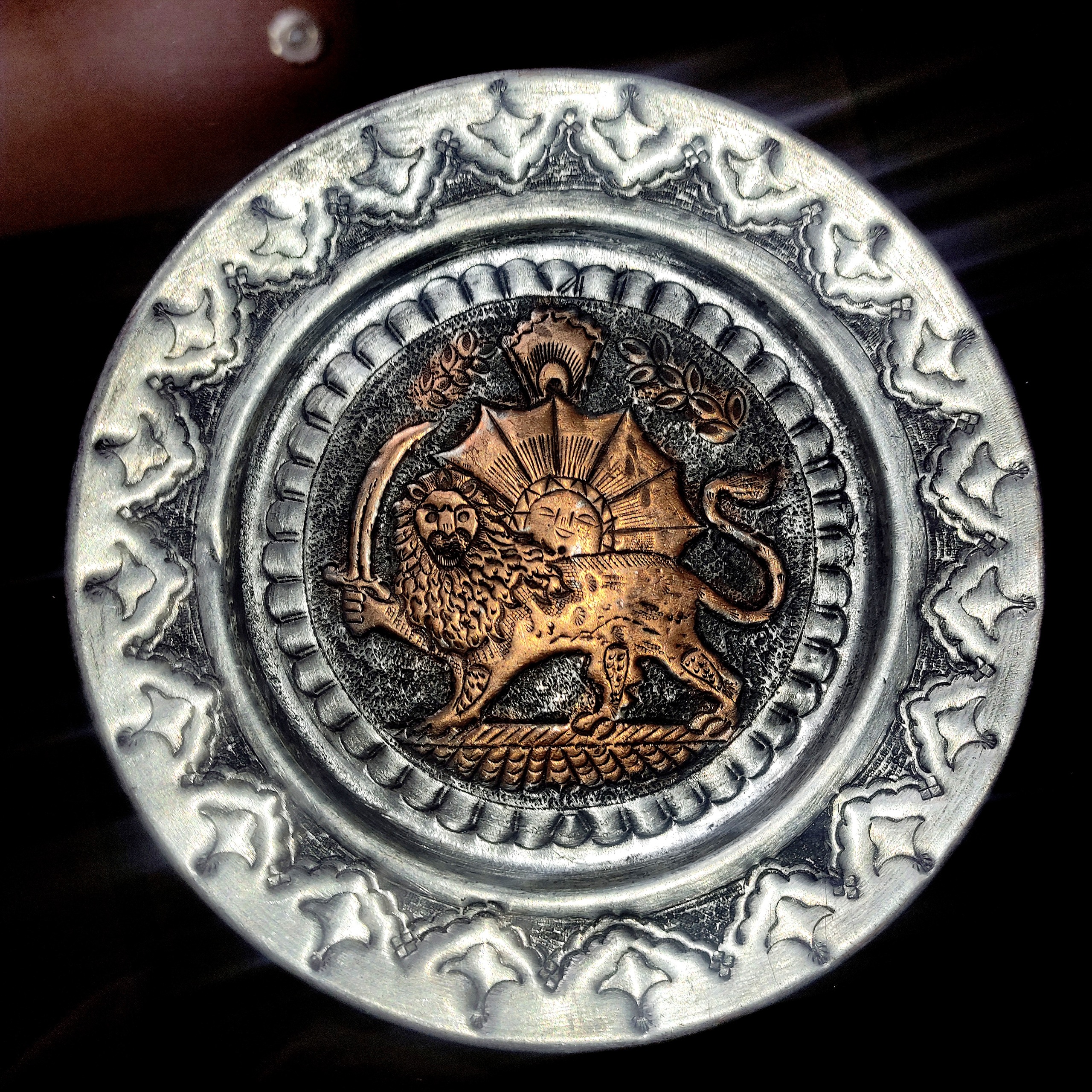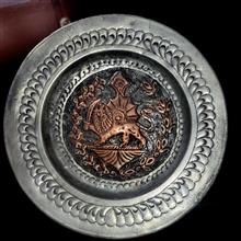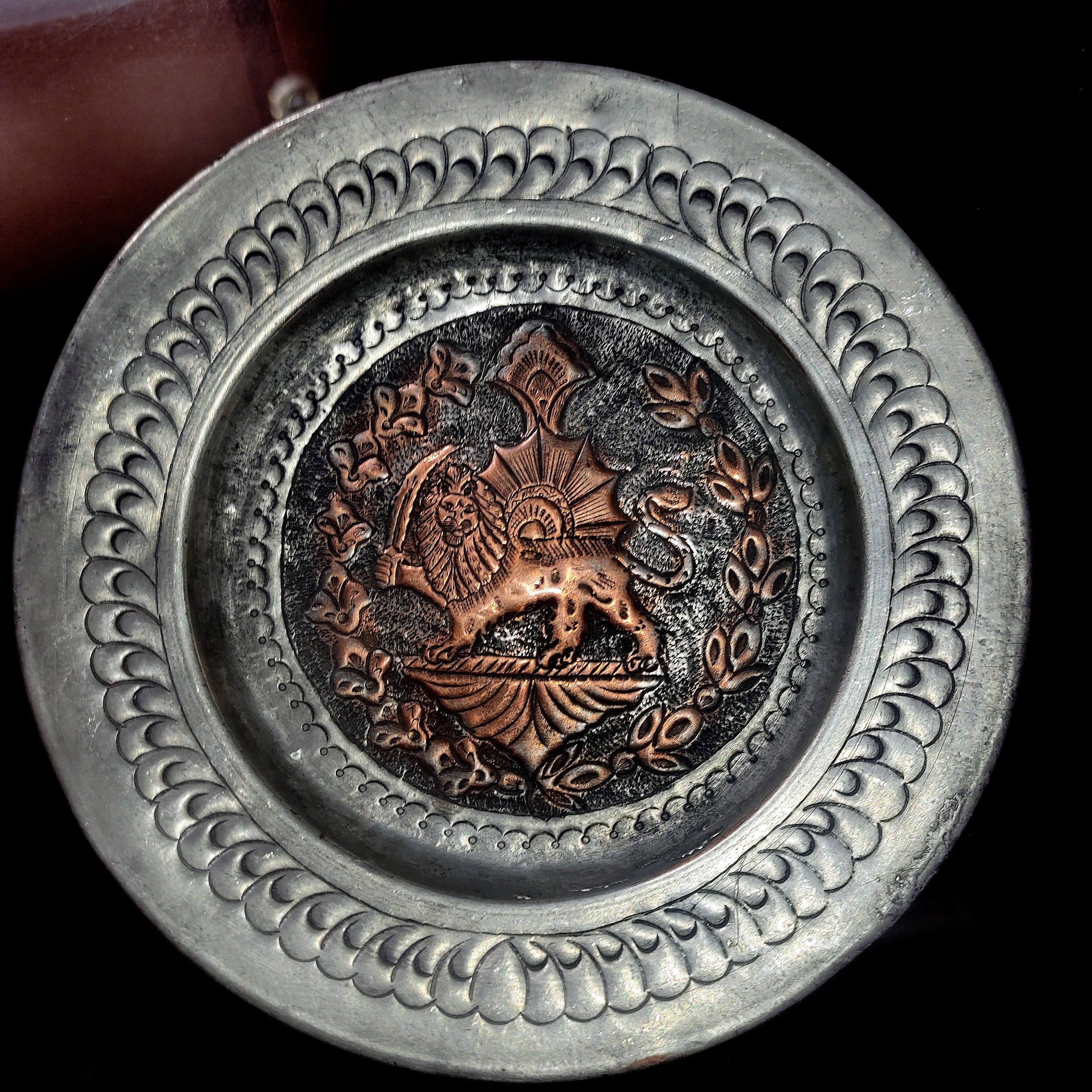 بشقاب آویز قلمزنی و سیاه قلم و دیوارکوب مس مربوط به دوره پهلوی و اثر دست هنرمندان شاخص ایران . قطر این بشقاب یا دیوارکوب بین 19 تا 20 سانتیمتر بوده و دارای نقش نمادهای تاریخی دوران گذشته است