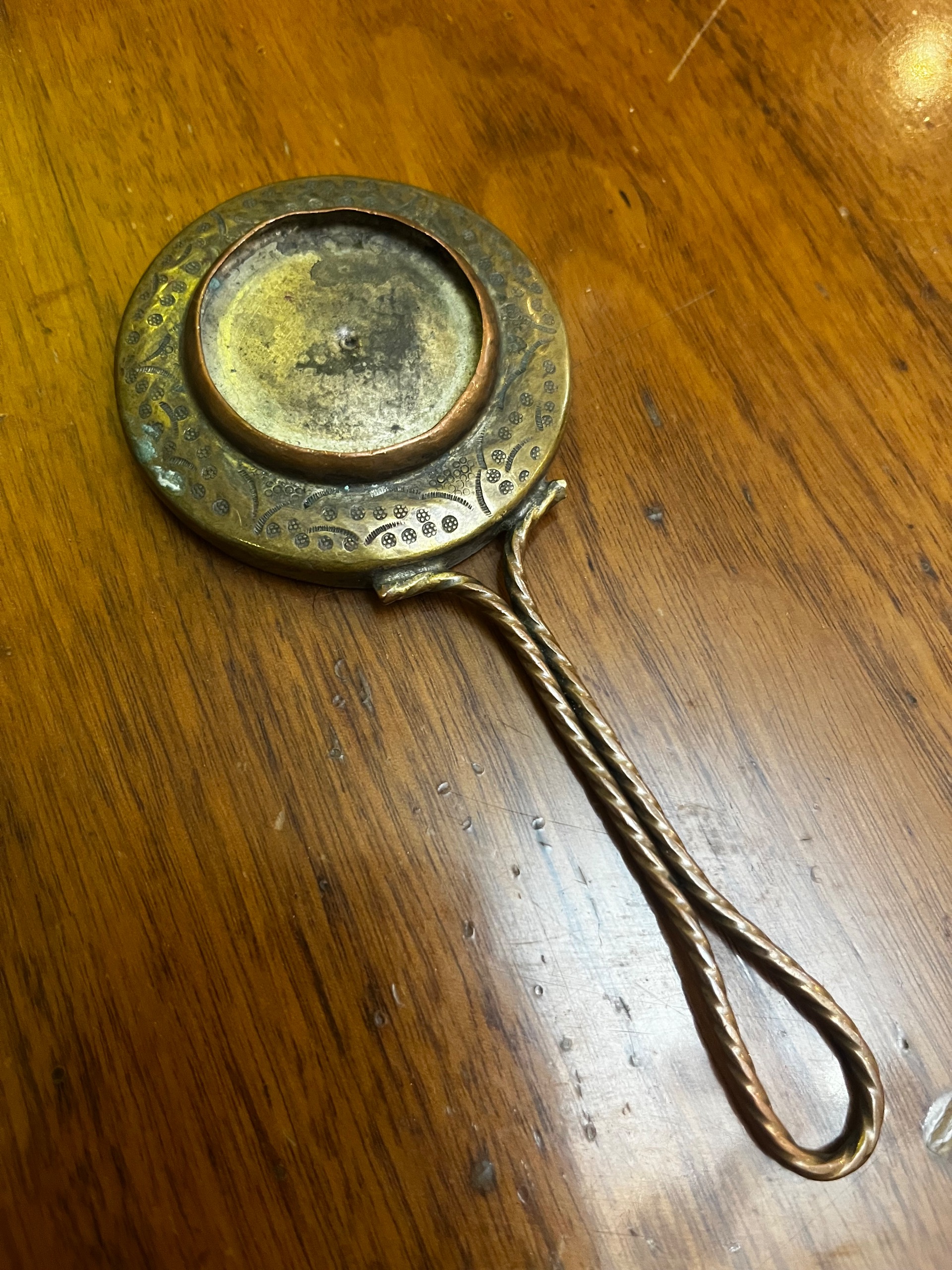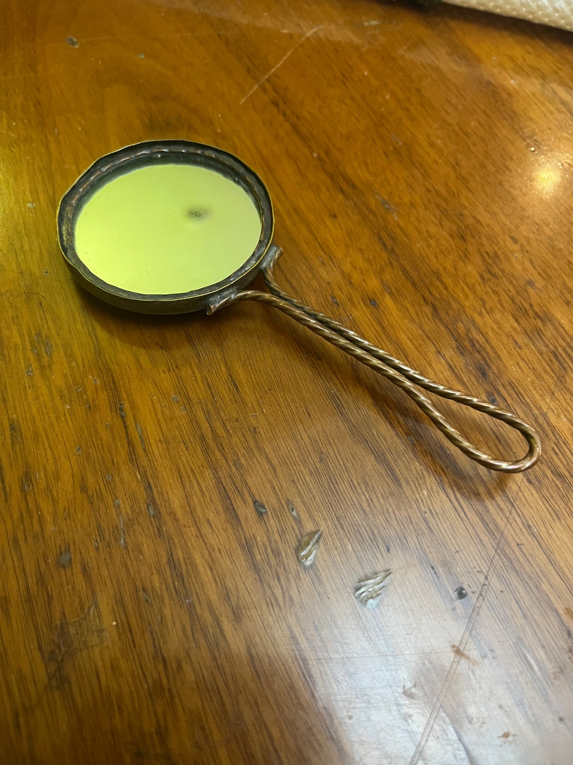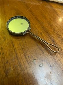 آینه دستی کوچک قاجاری کاری قدمت دار پشت کار حکاکی های ظریف و زیبا به علت قدمت بالا پشت کار نقاشی قسمت وسط افتاده طول 14 سانت
