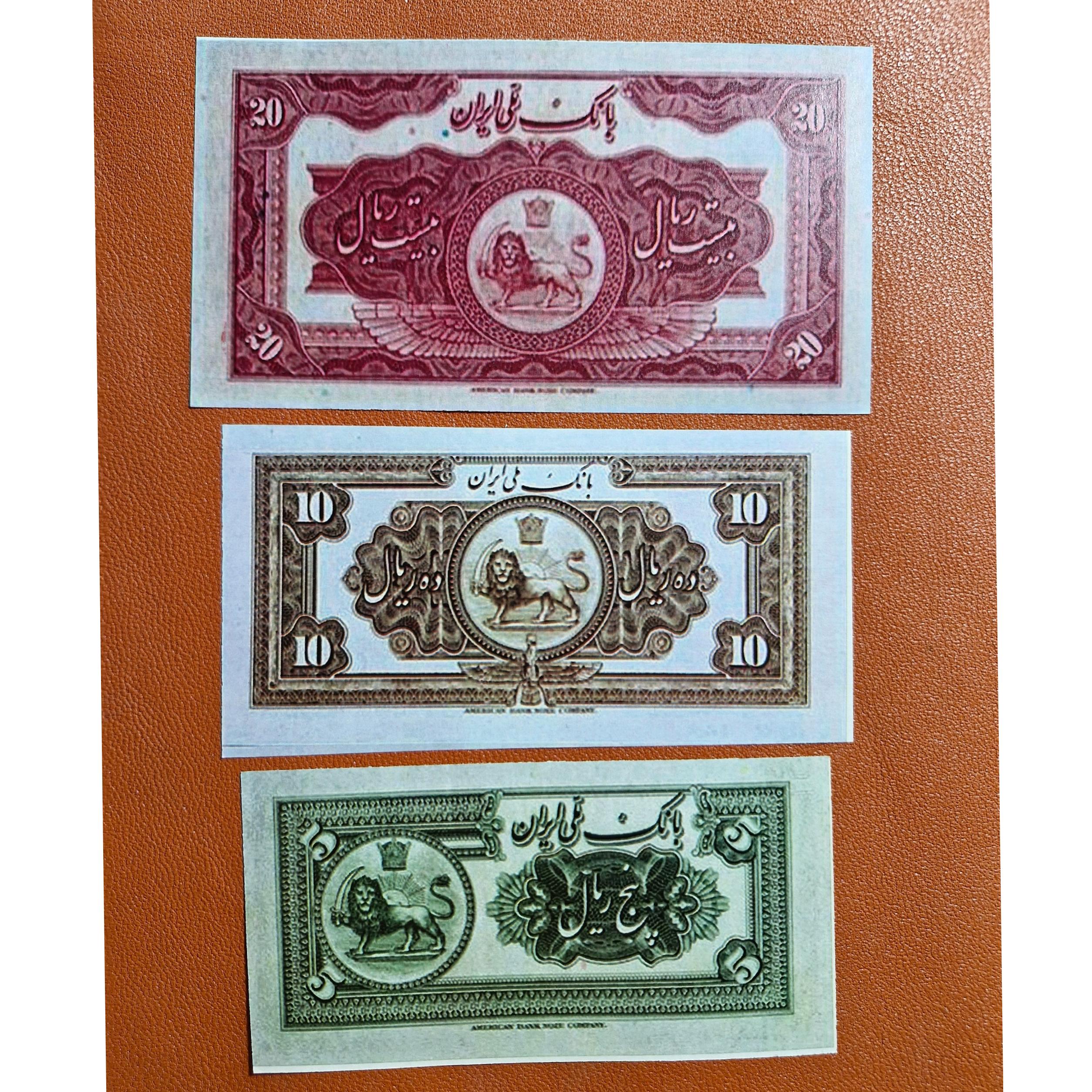 طبق عکس 3 عدد اسکناس کپی یا طرح میباشد و صرفا برای دوستانی که میخواهند البوم خود را تکمیل کنند و هزینه زیادی نکنند پول 3 برگ کپی رنگی 2 رو بیشتر از قیمت تعیین شده است