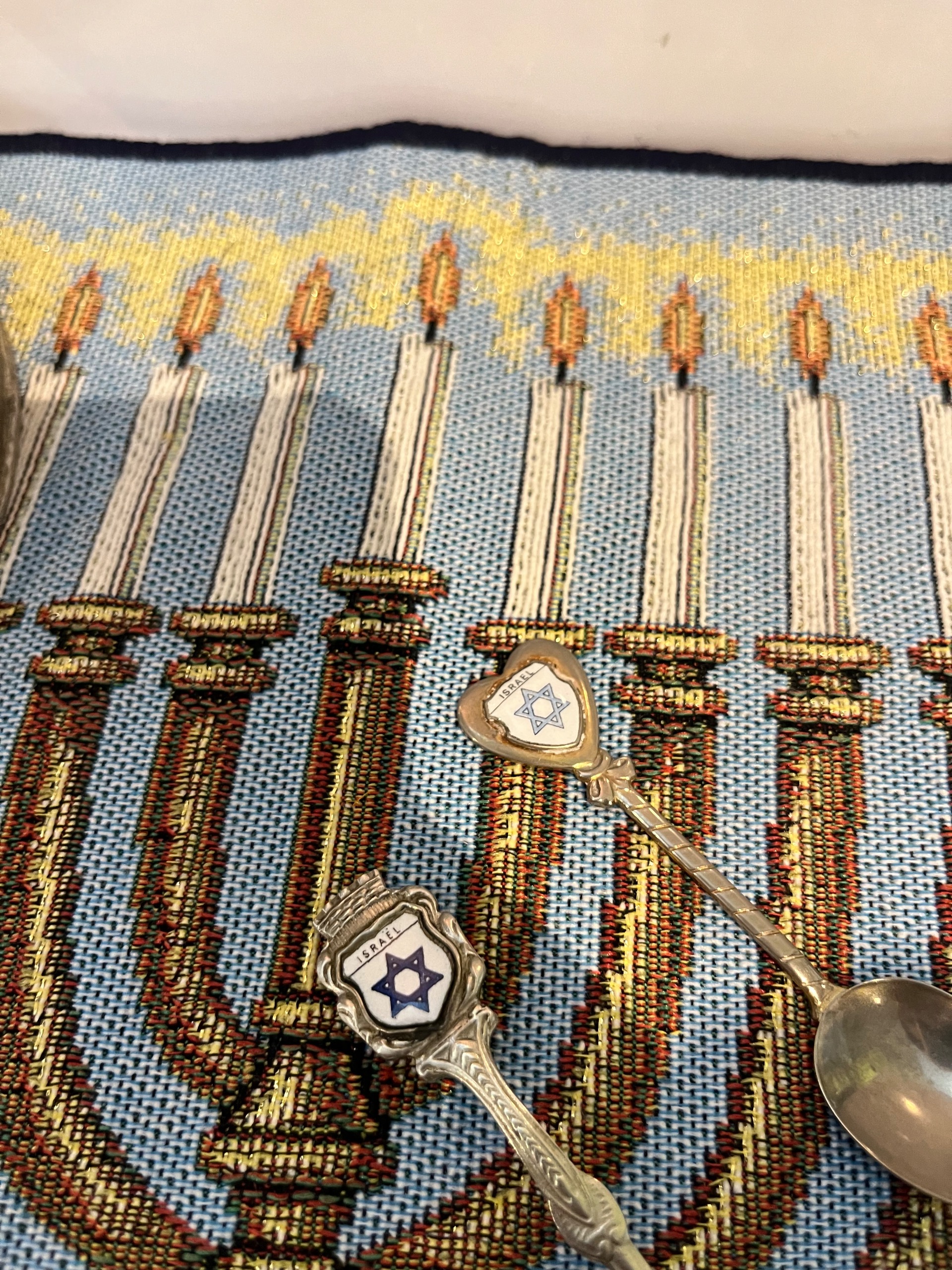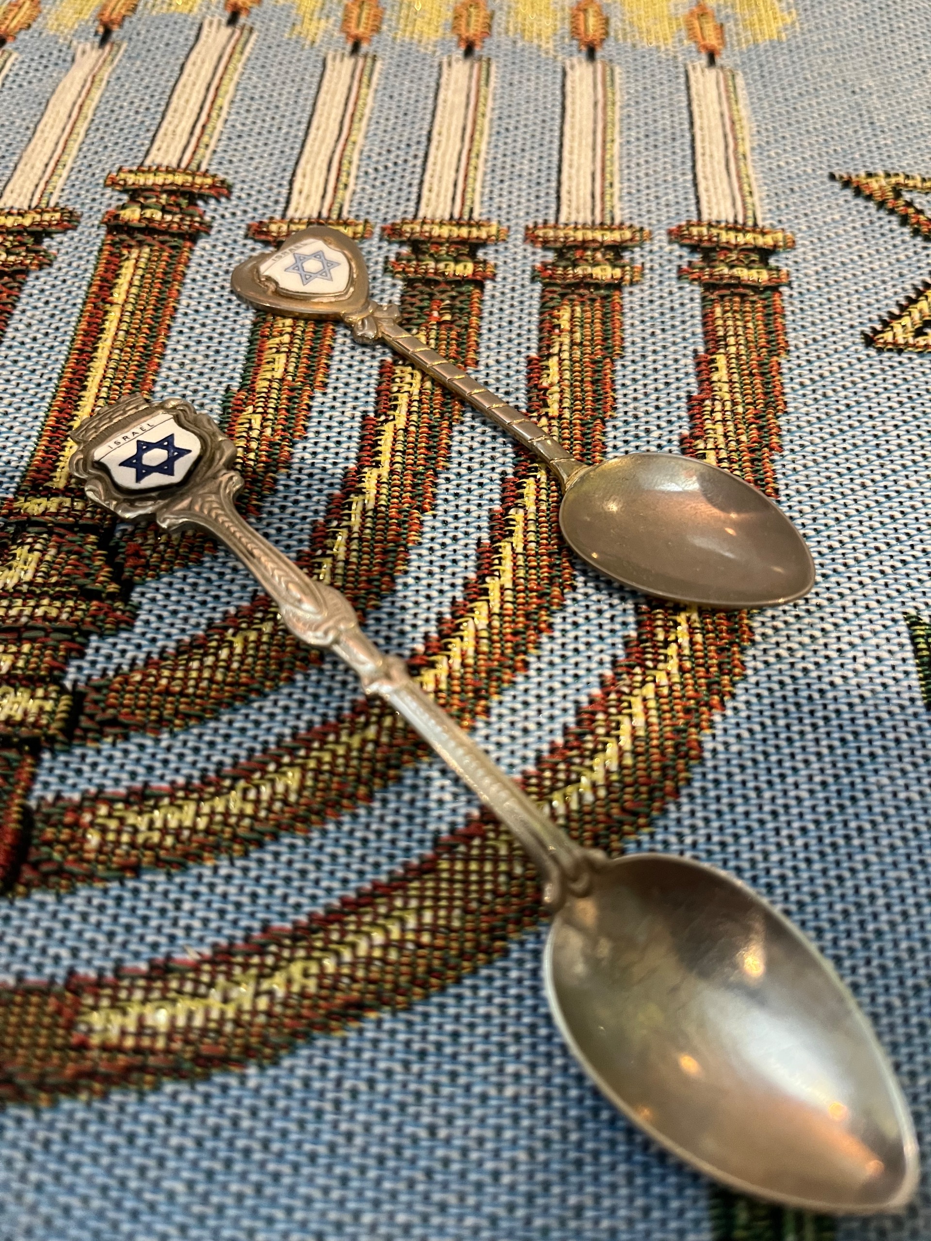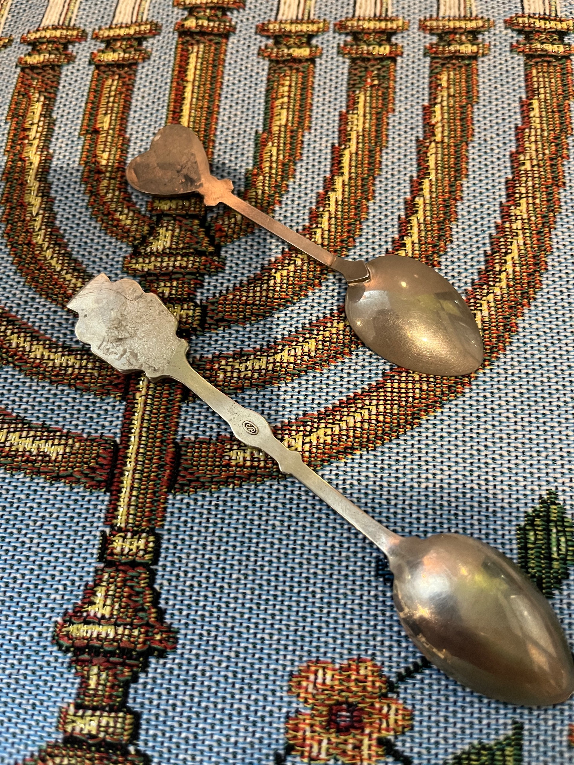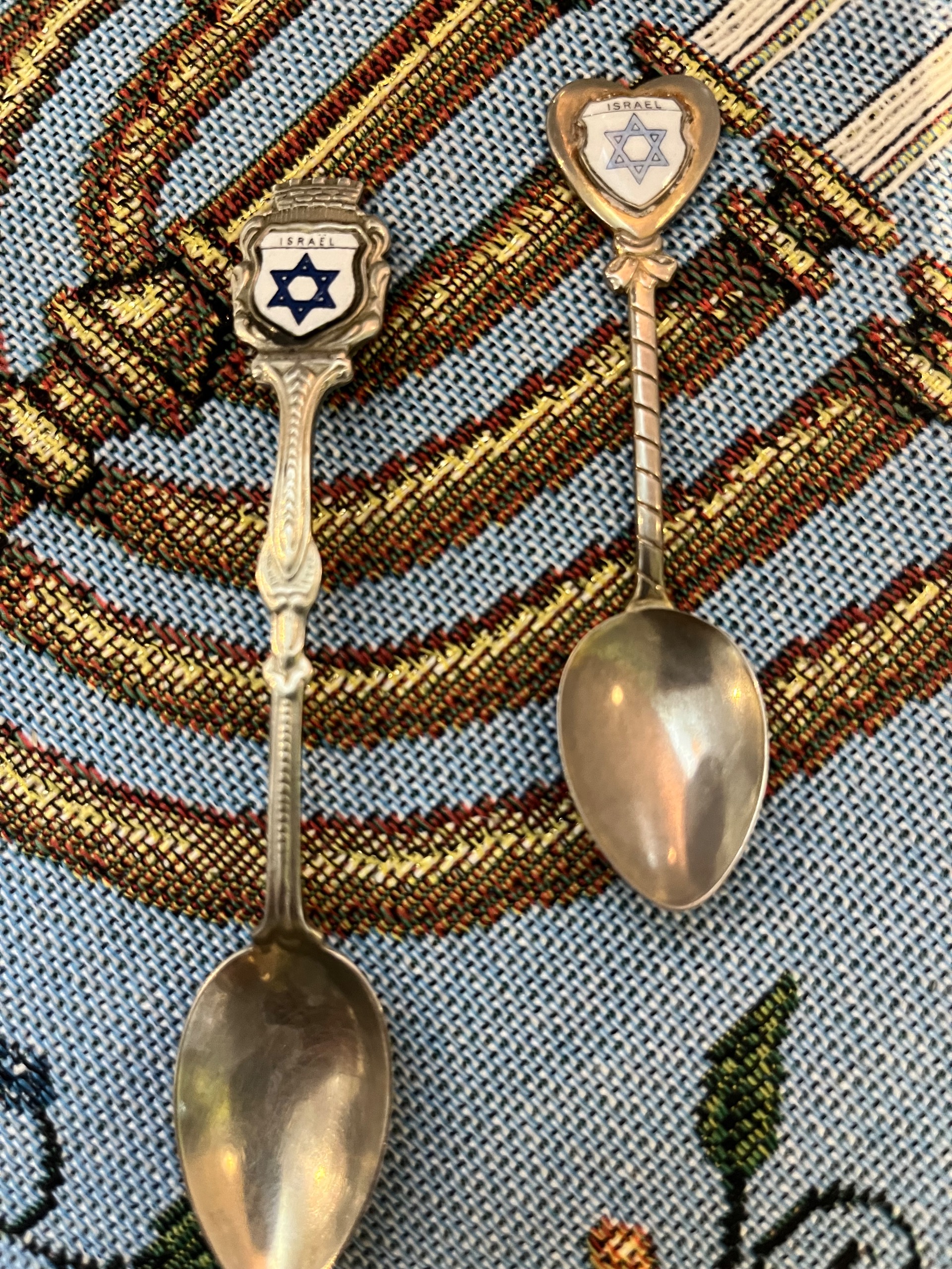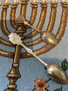 قاشق قدیمی و کلکسیونی عبری چای خوری به صورت جفت بسیار خاص و کمیاب که روی هر کدام پرچم کشور خاص به صورت برجسته کار شده است و برچسب نیست.