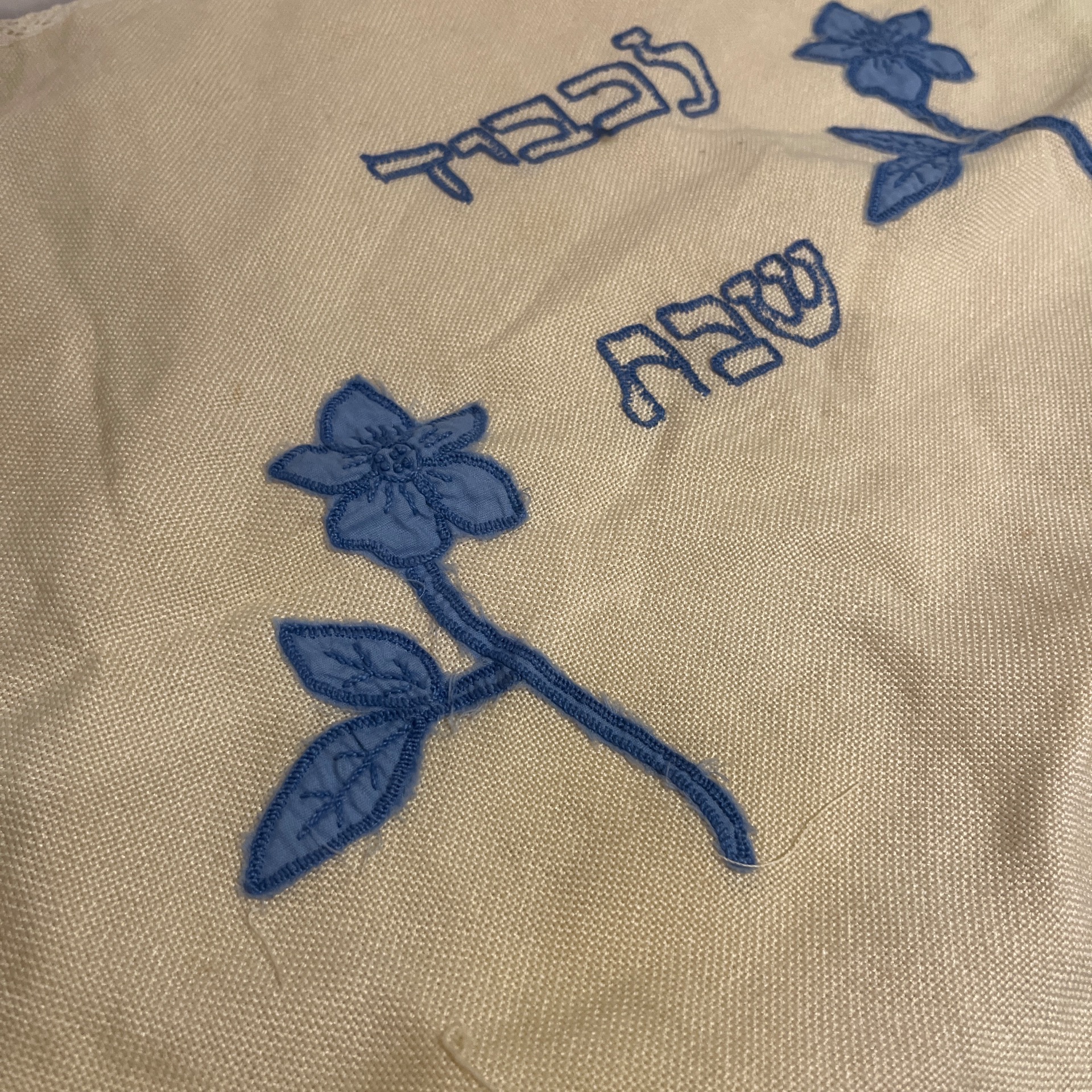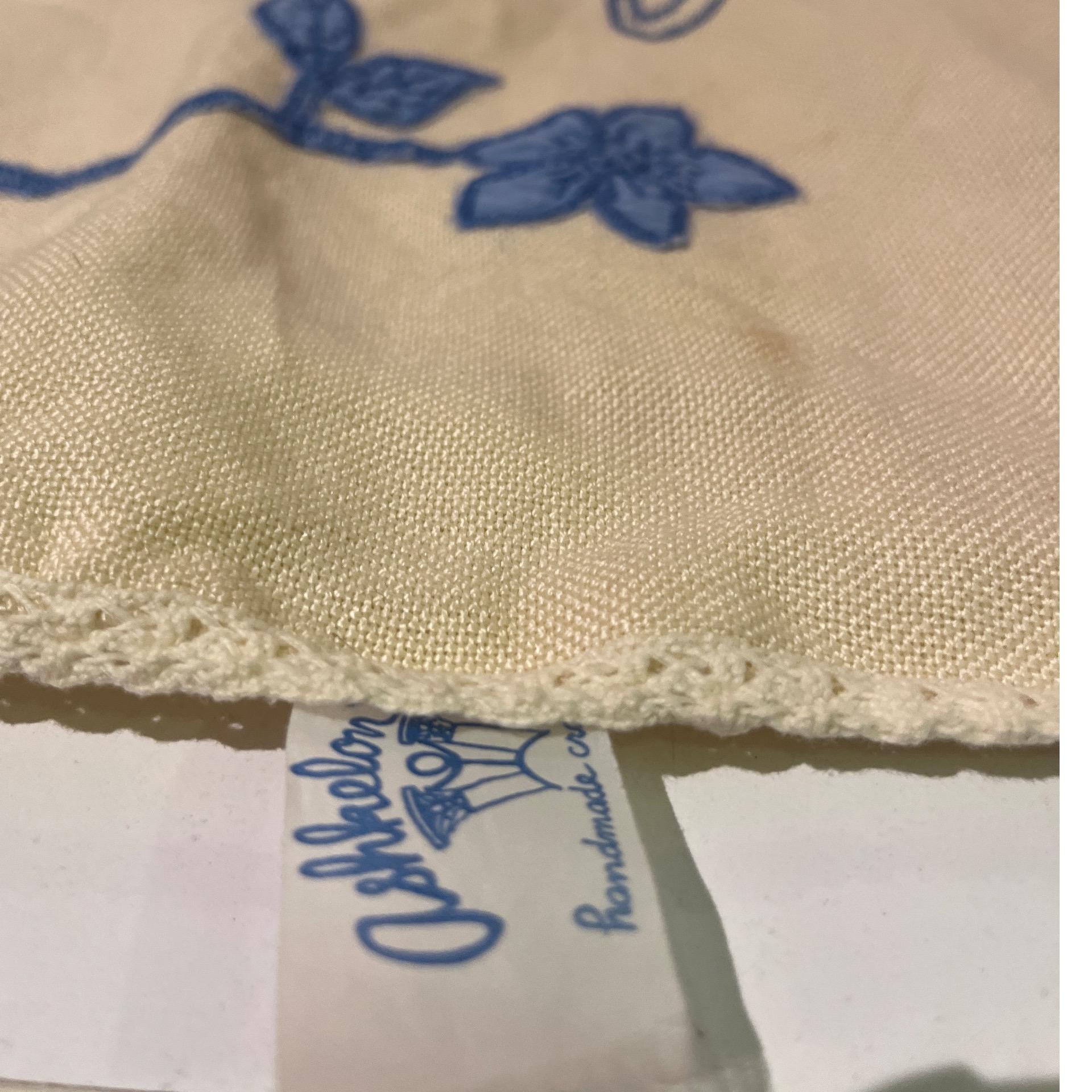 رومیزی قدیمی با طرح گلدوزی ابی و کلمات دوخته شده خاص . ابعاد کار 48*40 سالم و قابل استفاده.