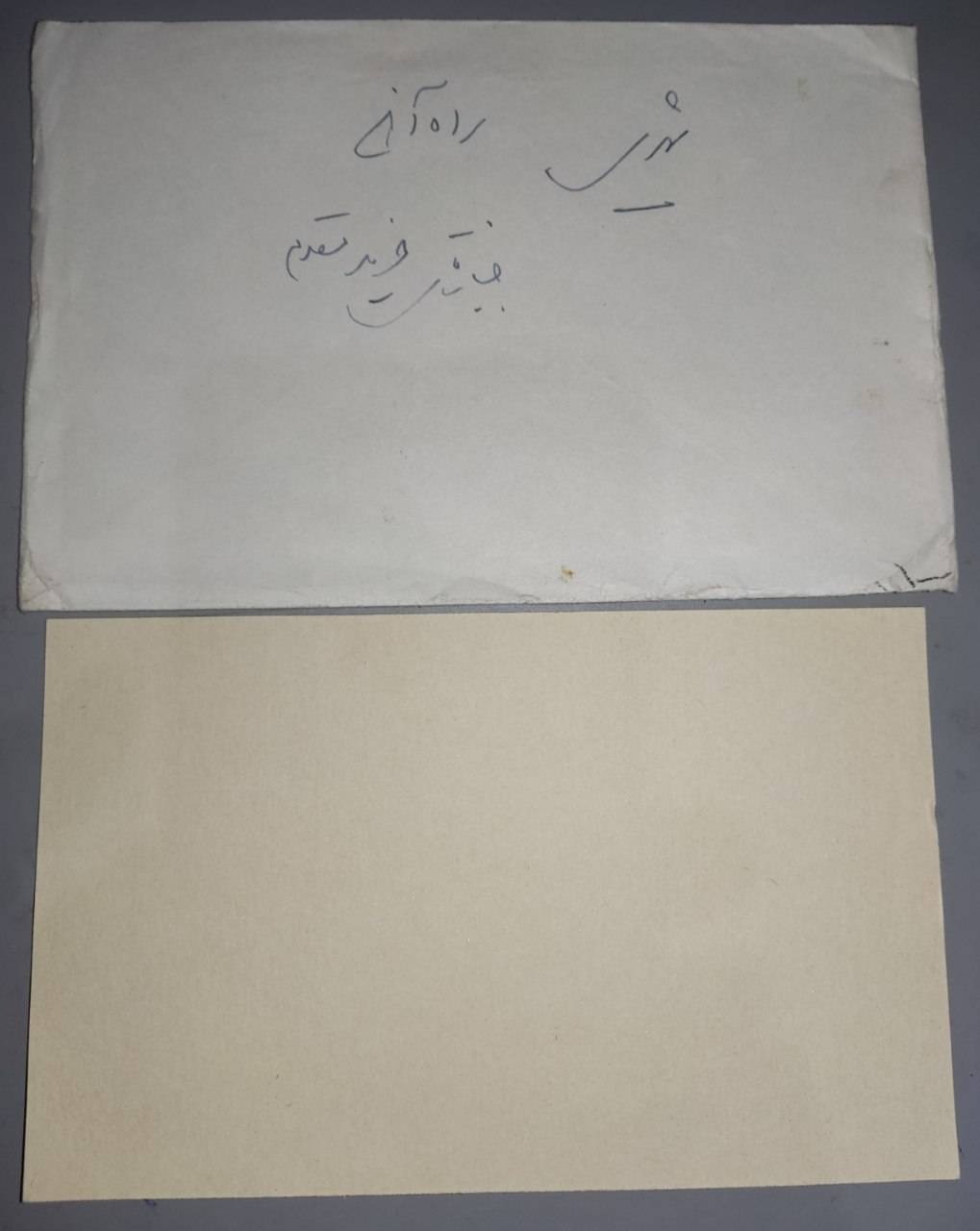 کارت تبریک کلکسیونی از جعفر حیدری رییس اداره مطبوعات و اطلاعات مجلس شورای ملی، در پاکت تمبر دار