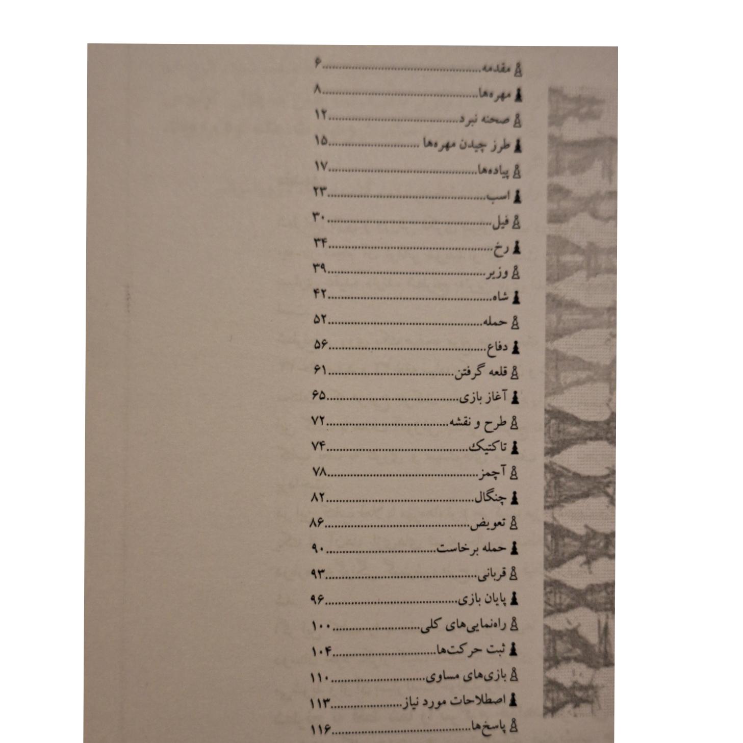در این کتاب فعلاً با مهره ها، نوع حرکت، میزان قدرت و ارزش هر یک از آنها بازیهای نمونه جالب، اصطلاحات و نیز مقدماتی درباره چه گونگی ،گسترش طرح ریزی و فینال بازی ها آشنا خواهید شد.