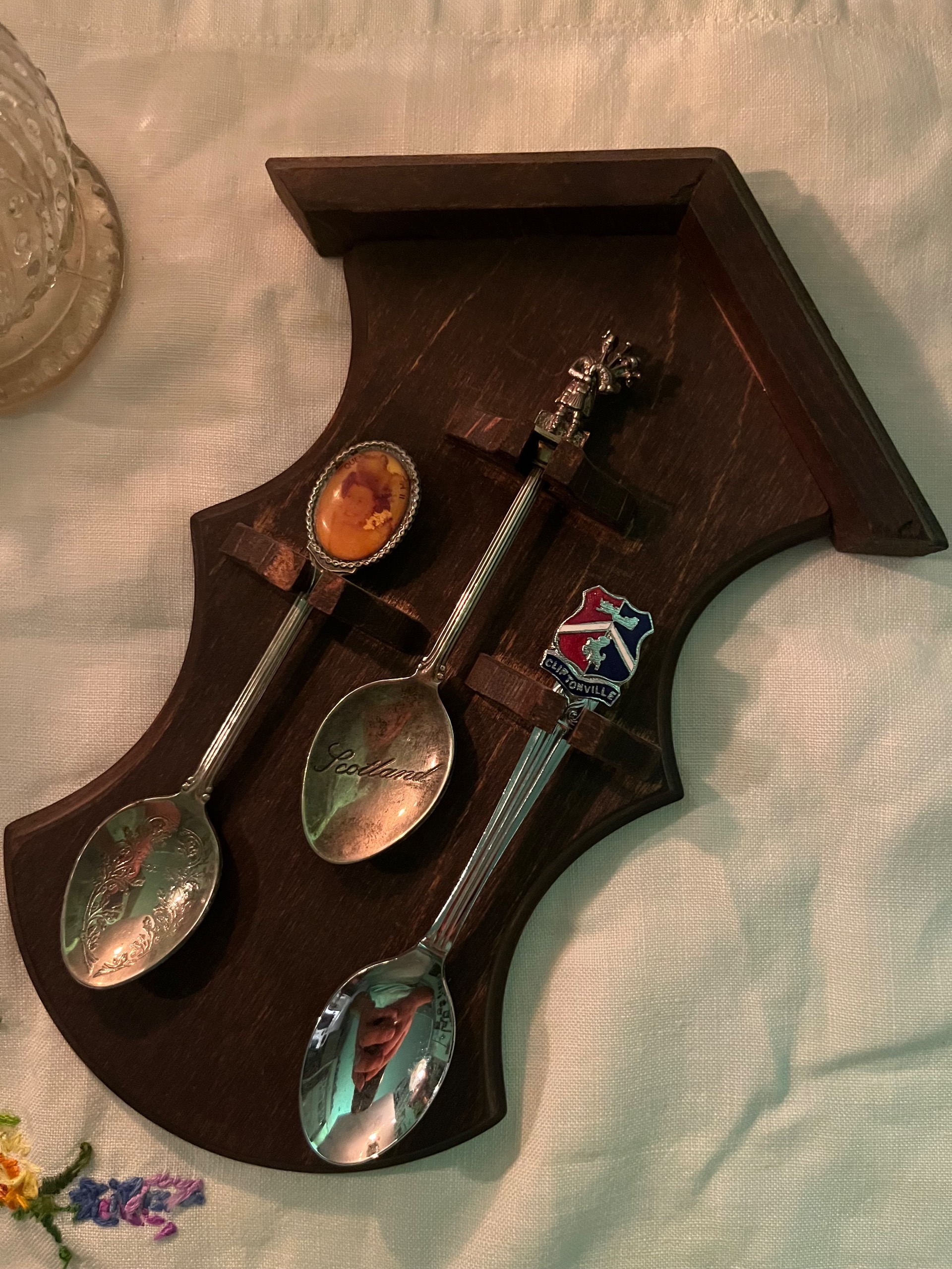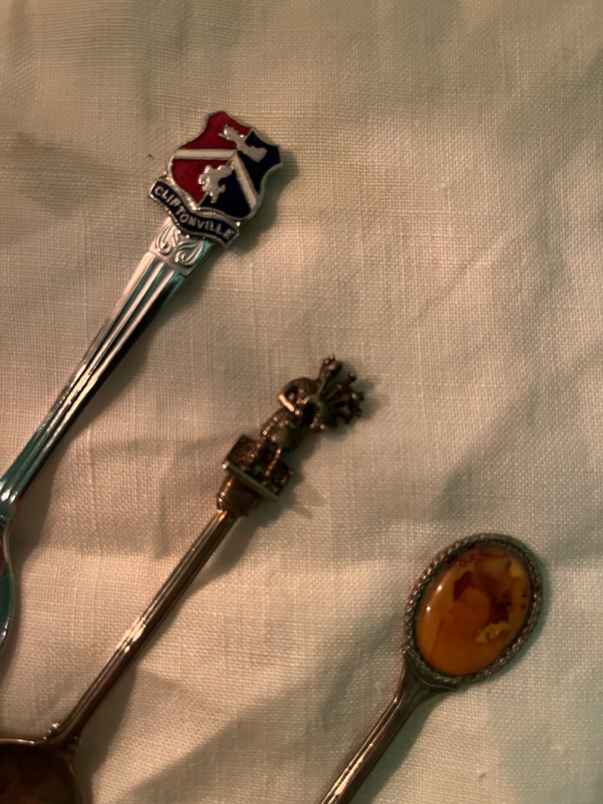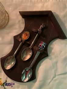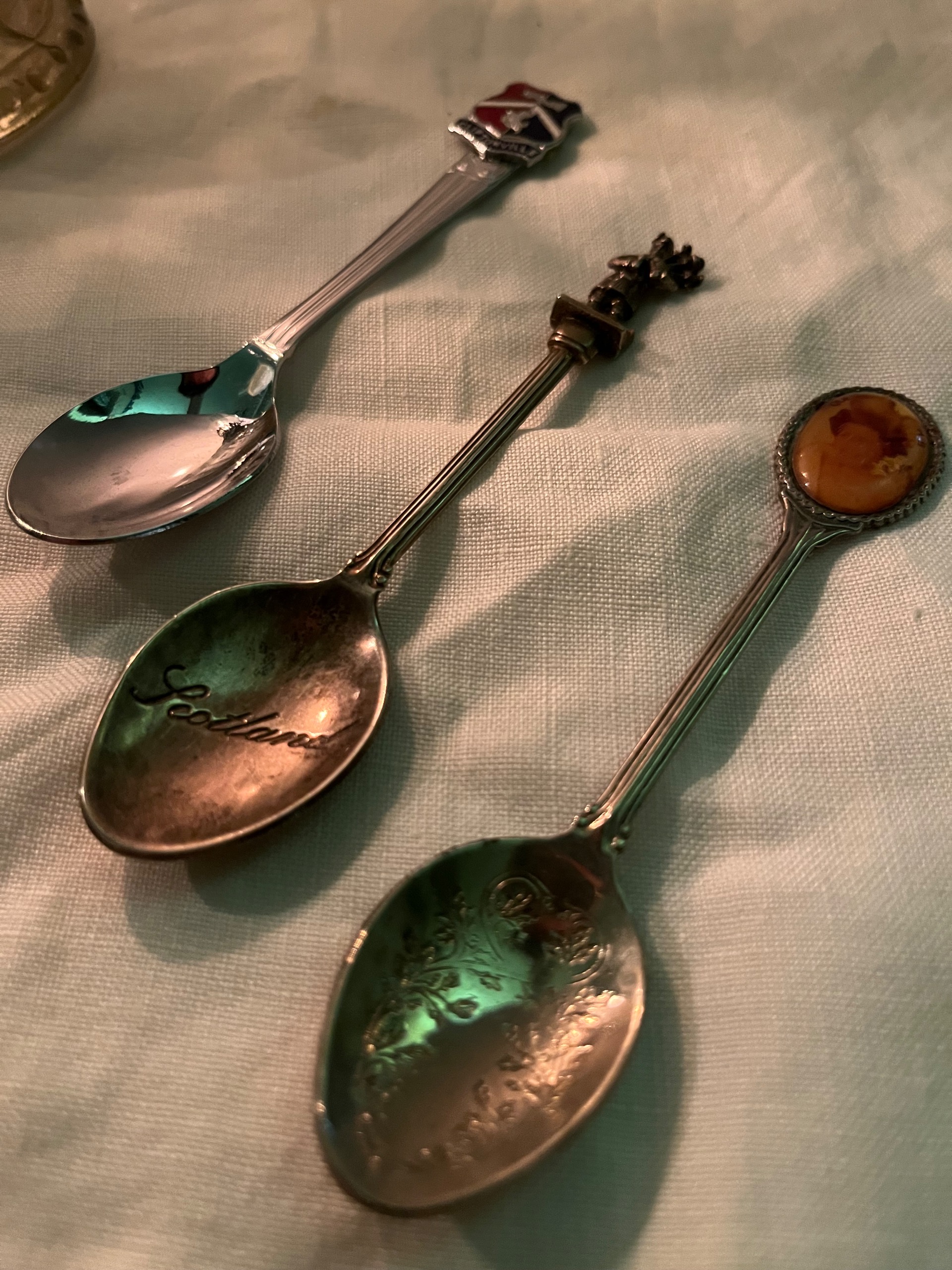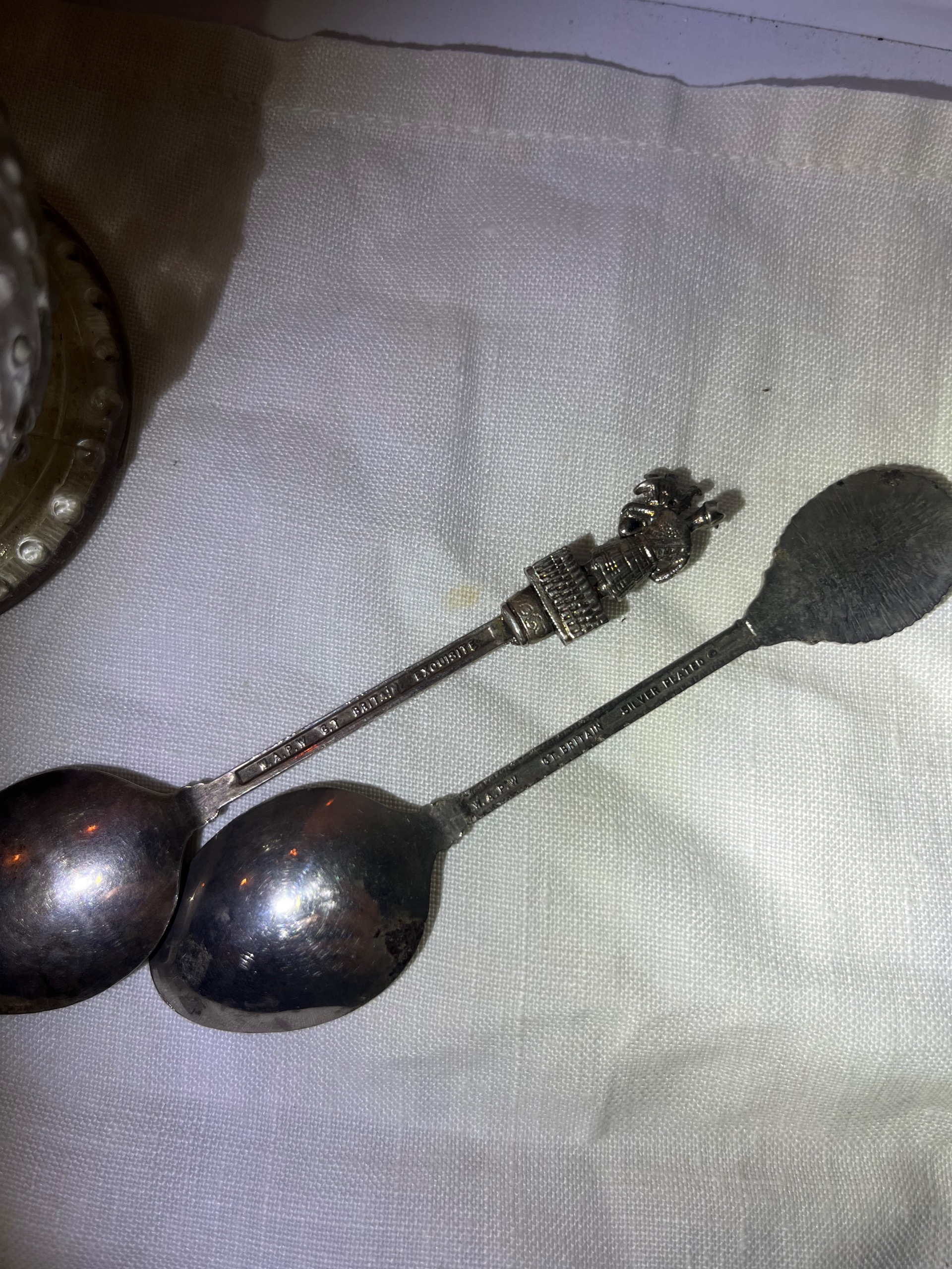 قاشق قدیمی اروپایی کلکسیونی با طرح های متفاوت ساخت انگلستان که دو عدد حک ساخت بریتانیای کبیر و 1 عدد ساخت شفیلد انگستان است که در عکس ها مشخص هستند.