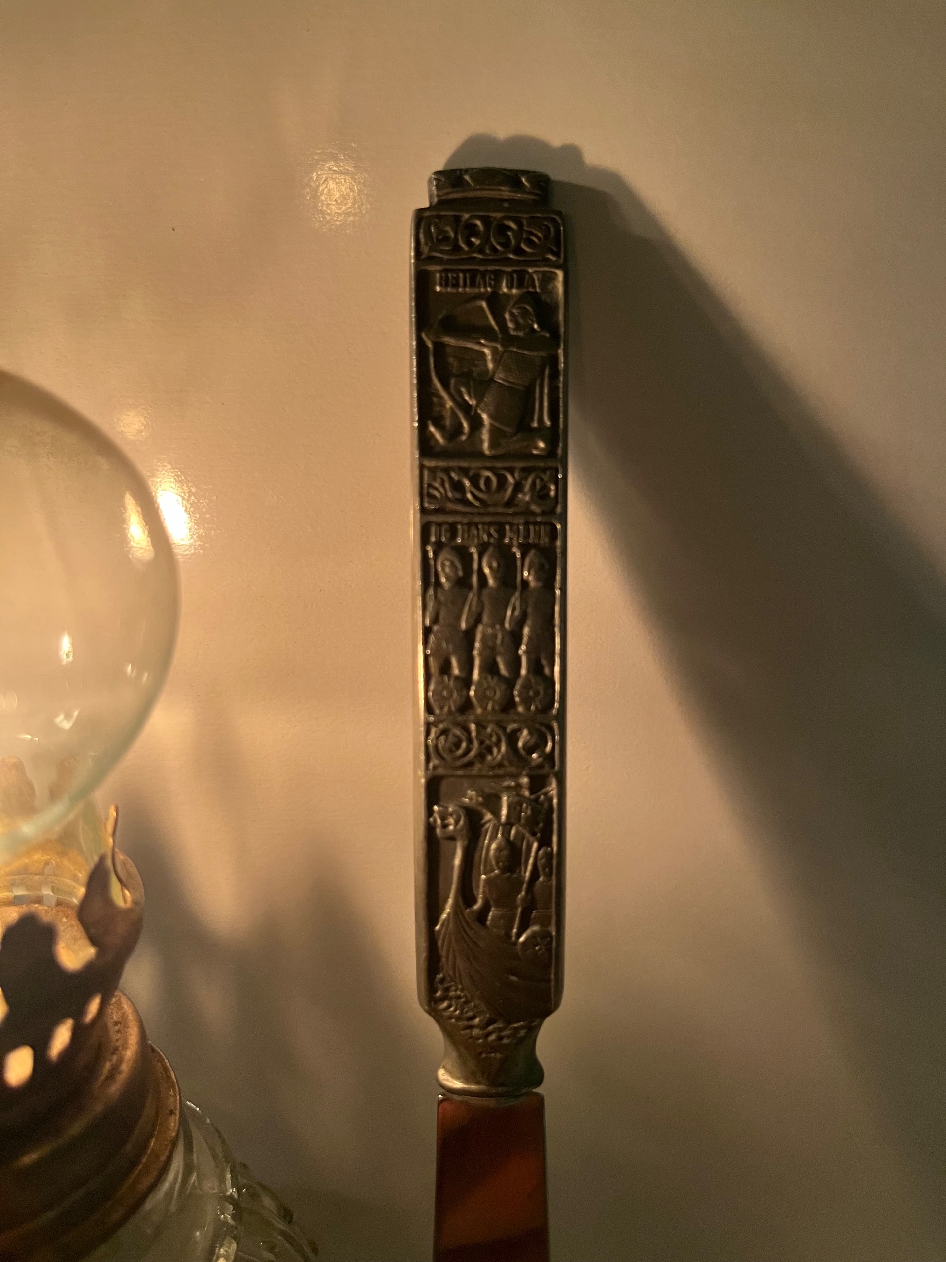 طرح دو طرف دسته یکی می باشد و سربازان مختلف وایکینگ را به تصویرکشیده است و در قسمت بالای دسته هم تاج طراحی شده است.