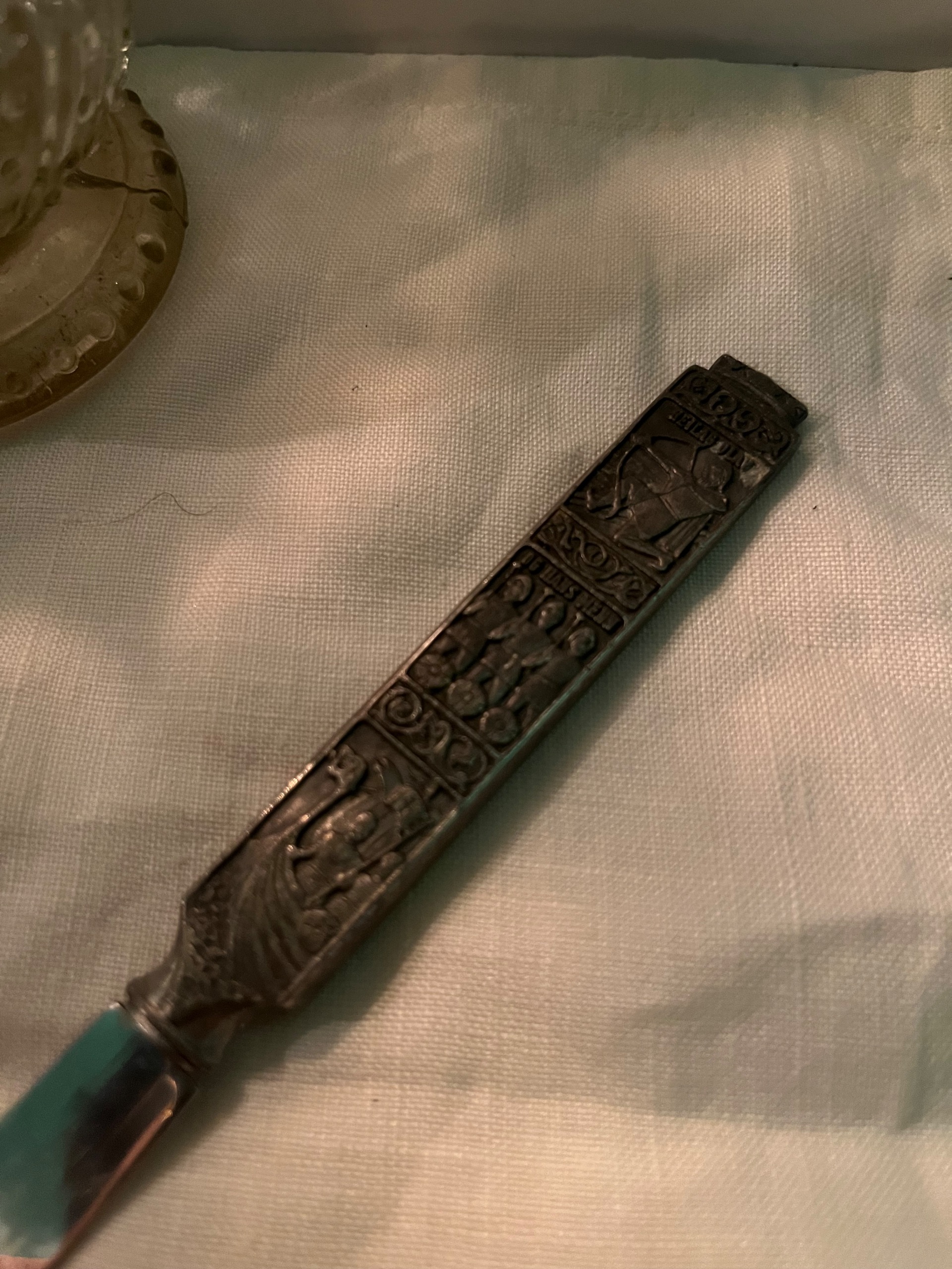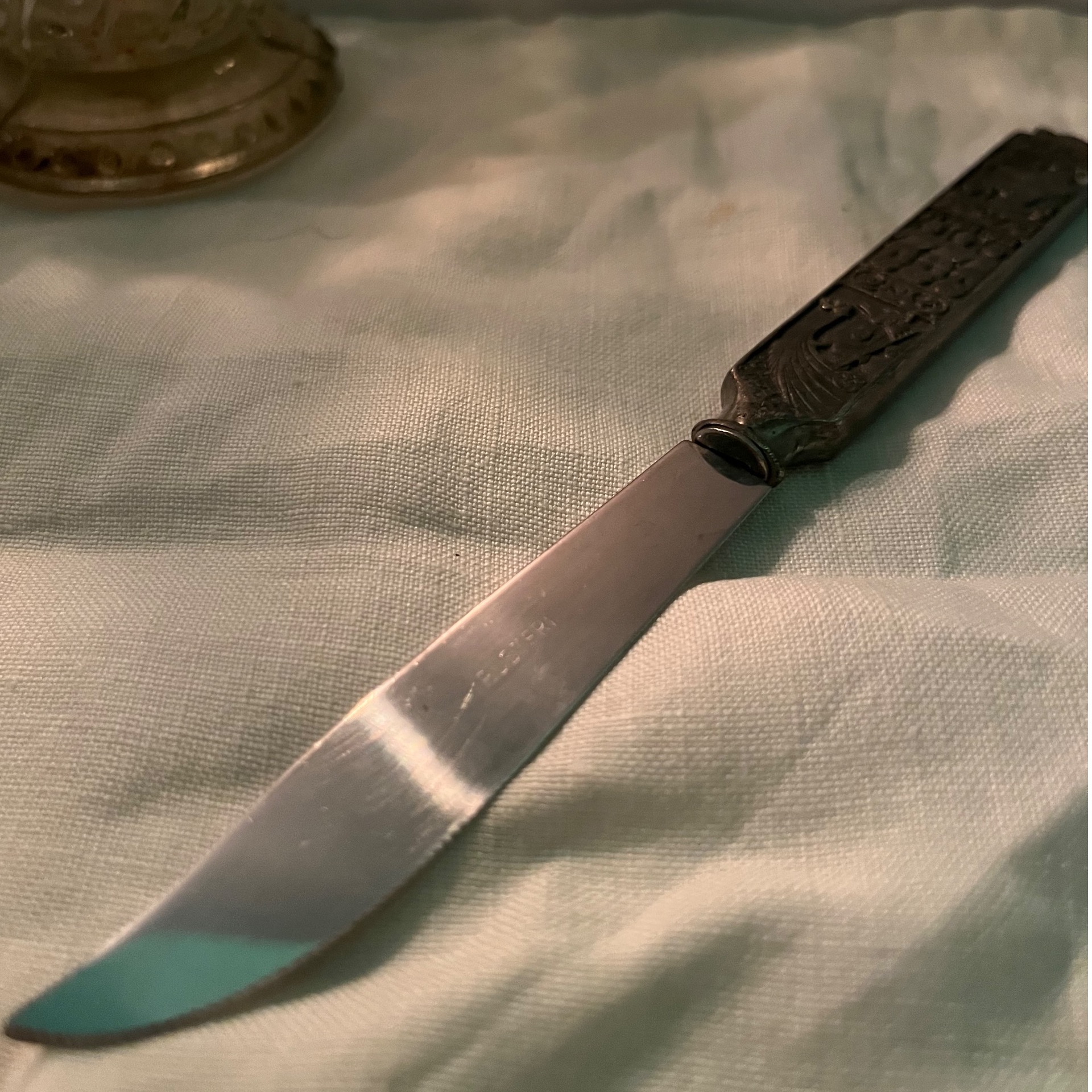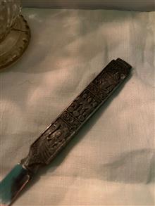 کارد قدیمی کلکسیونی دانمارکی با دسته پیوتر و قسمت پایین استیل و مارک دار می باشد.