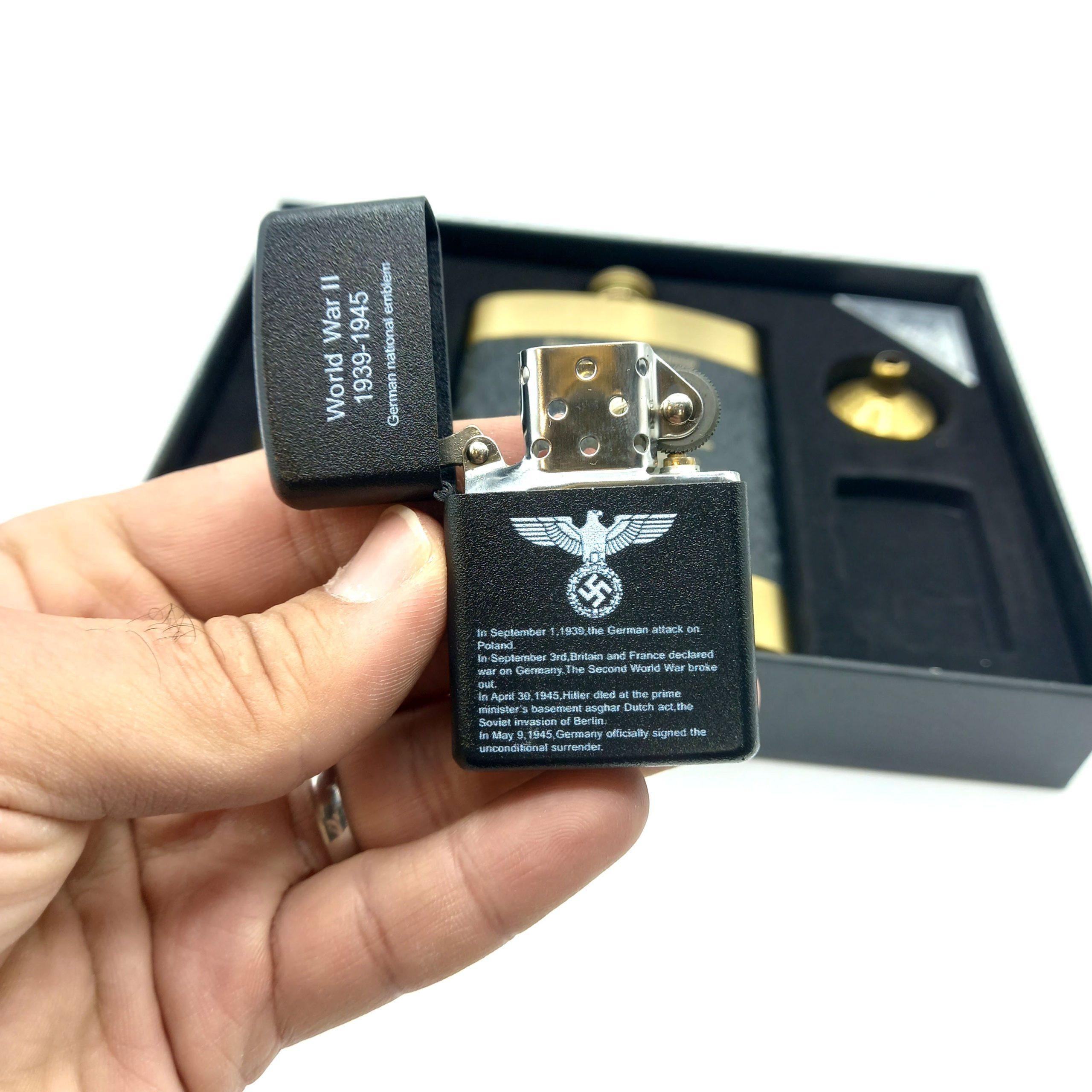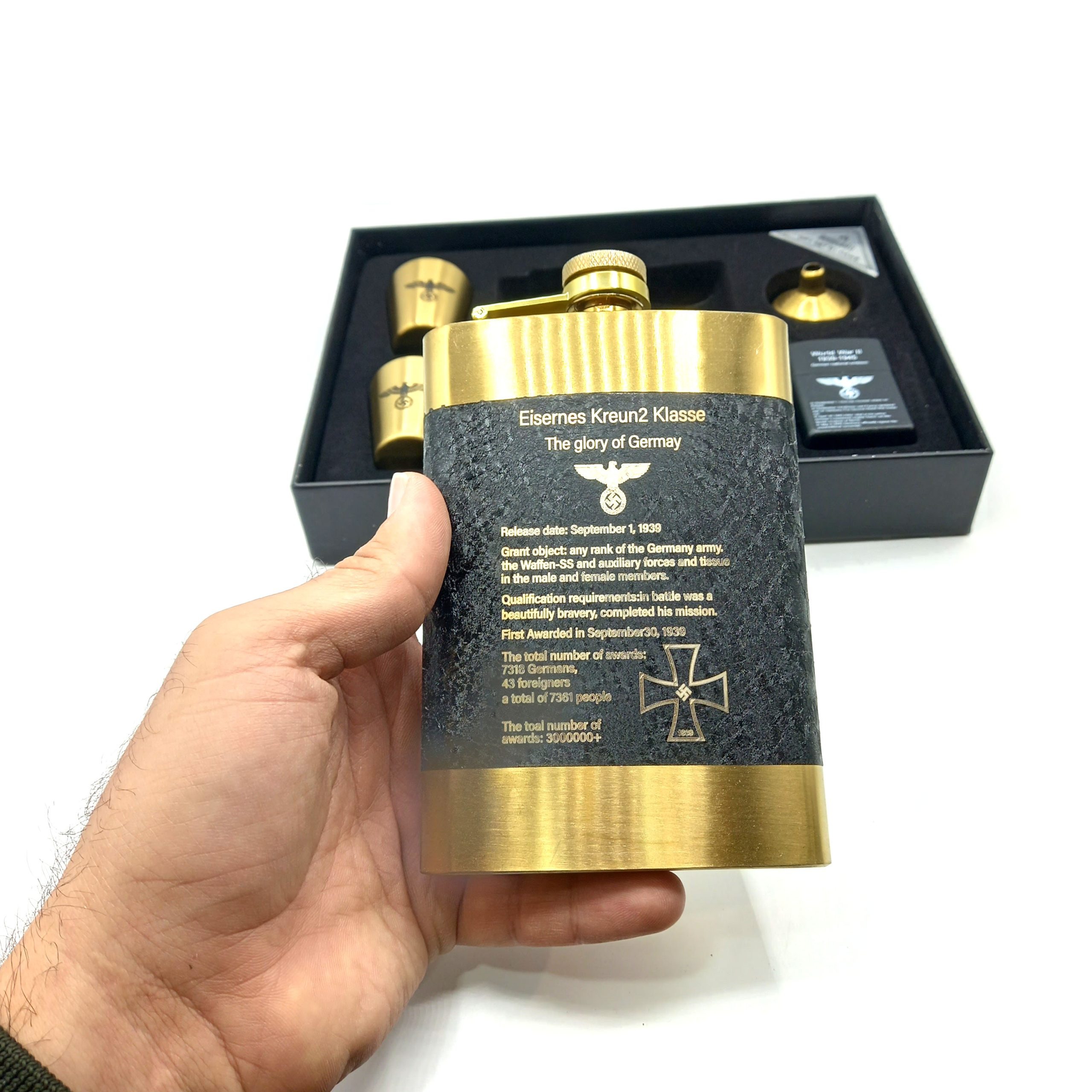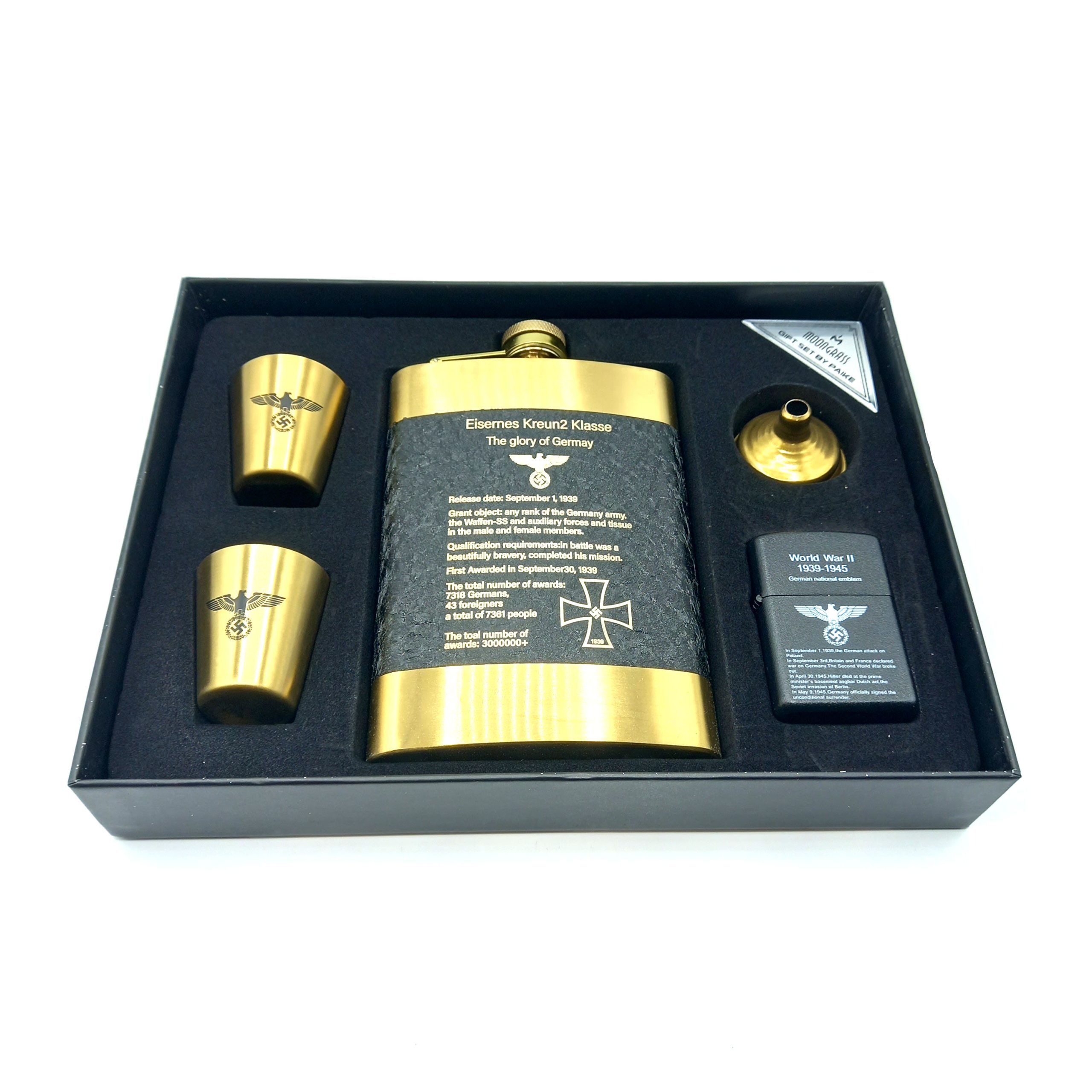 - حتویات پک:1عدد هیپ فلاسک،1 عدد قیف استیل،2 عددلیوان 1 عدد فندک