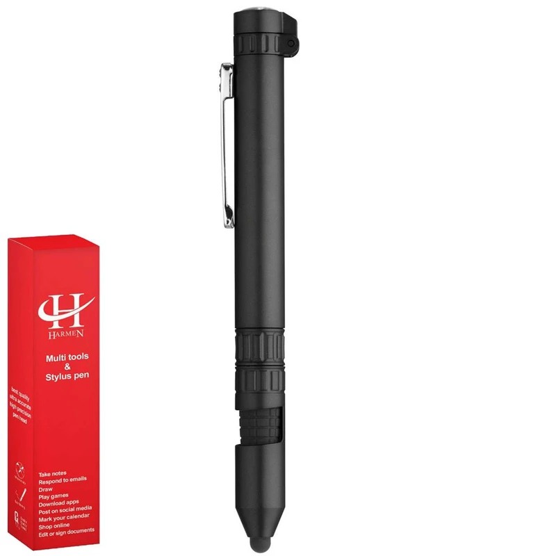ابزار چند کاره HARMEN مدل مولتی تولز 6 در 1 یکی از پرفروشترین ابزار ها و قلم عای لمسی میباشد این قلم چندکاره دارای قطب نما در سر قلم و همچنین دارای پیچ گوشتی دوسو و چهارسو در قسمت میانی ابزار میباشد درب این ابزار چندکاره پس از جداشدن قابلیت تبدیل به استند موبایل و تبلت (پایه نگهدارنده موبایل و تبلت ) با تمای سایزها میباشد همچنین دارای خودکار با مغزی قابل تعویض میباشد ابزار چندکاره مولتی تولز در قسمت درب خود دارای قلم لمسی (قلم تاچ) از جنس سیلیکون بوده که حساسیت زیادی دارد و با تمامی برندهای موبایل و تبلت از جمله اپل ایفون و ایپد و سامسونگ و شیائومی سازگار میباشد این ابزار چندکاره از جنس پلاستیک خشک با کیفیت ABS بوده.