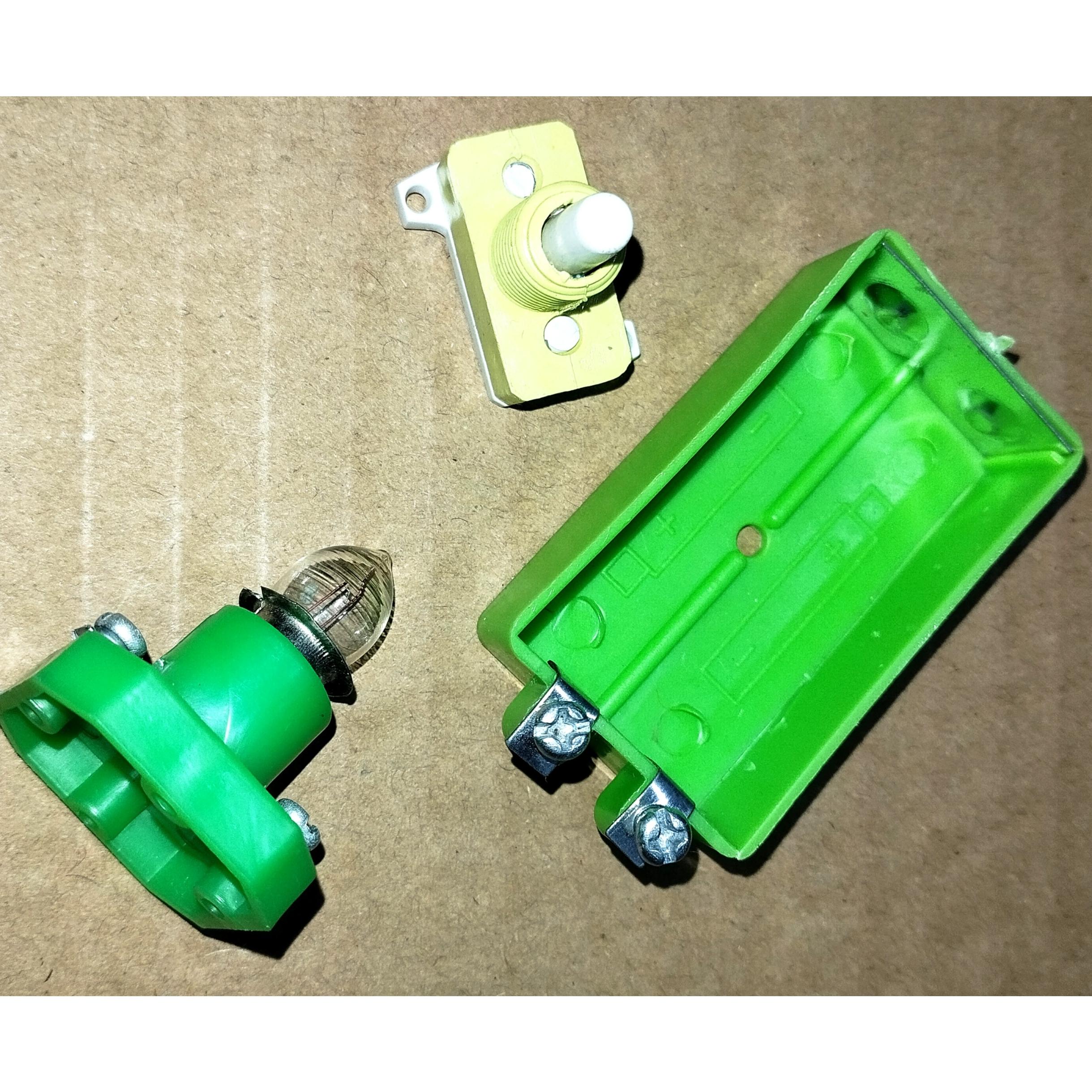داخل پک یک عدد لامپ بهمراه پایه پیچی لامپ..یک عدد کلید فشاری...یک عدد محفظه دوتایی باتری