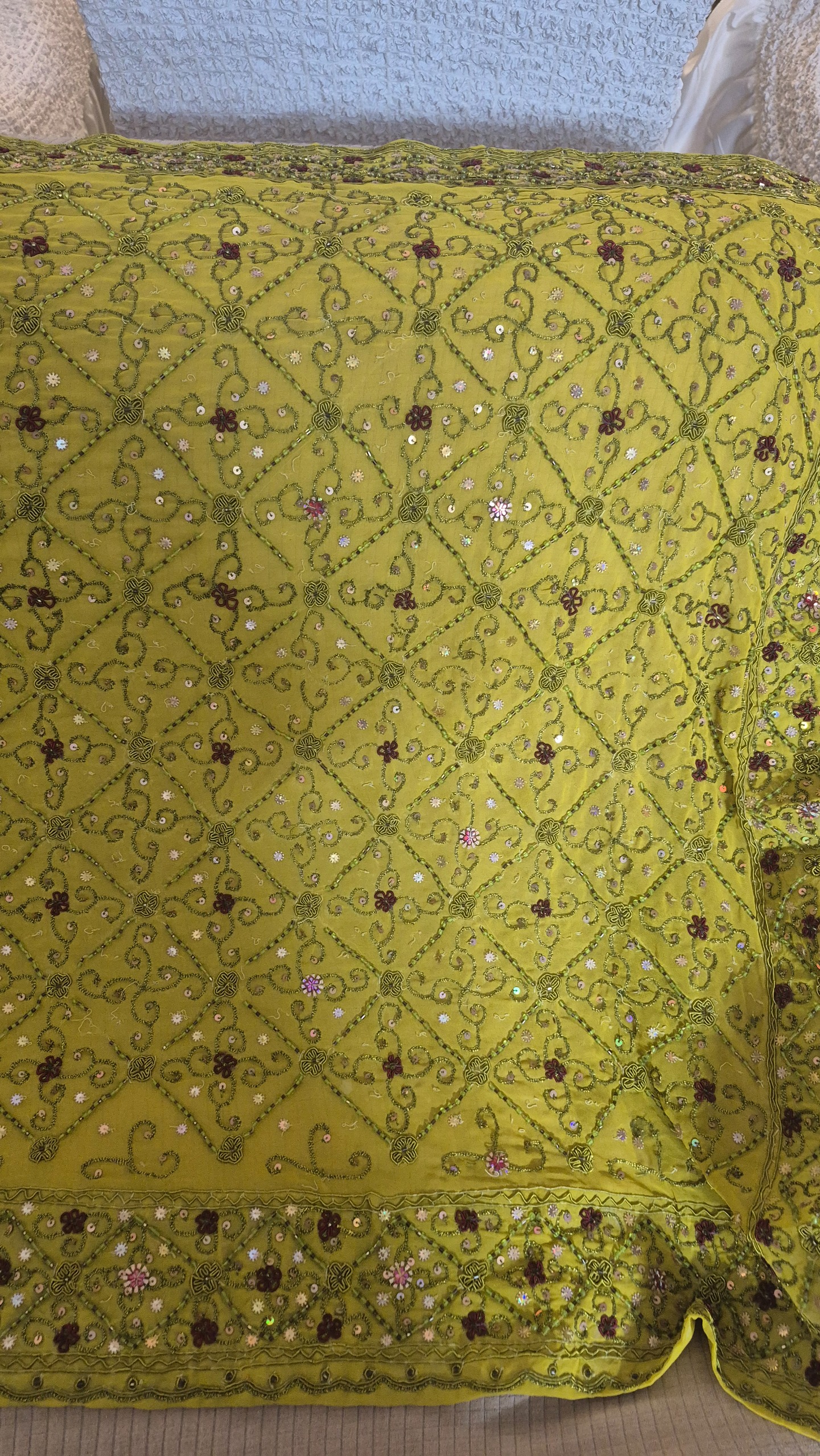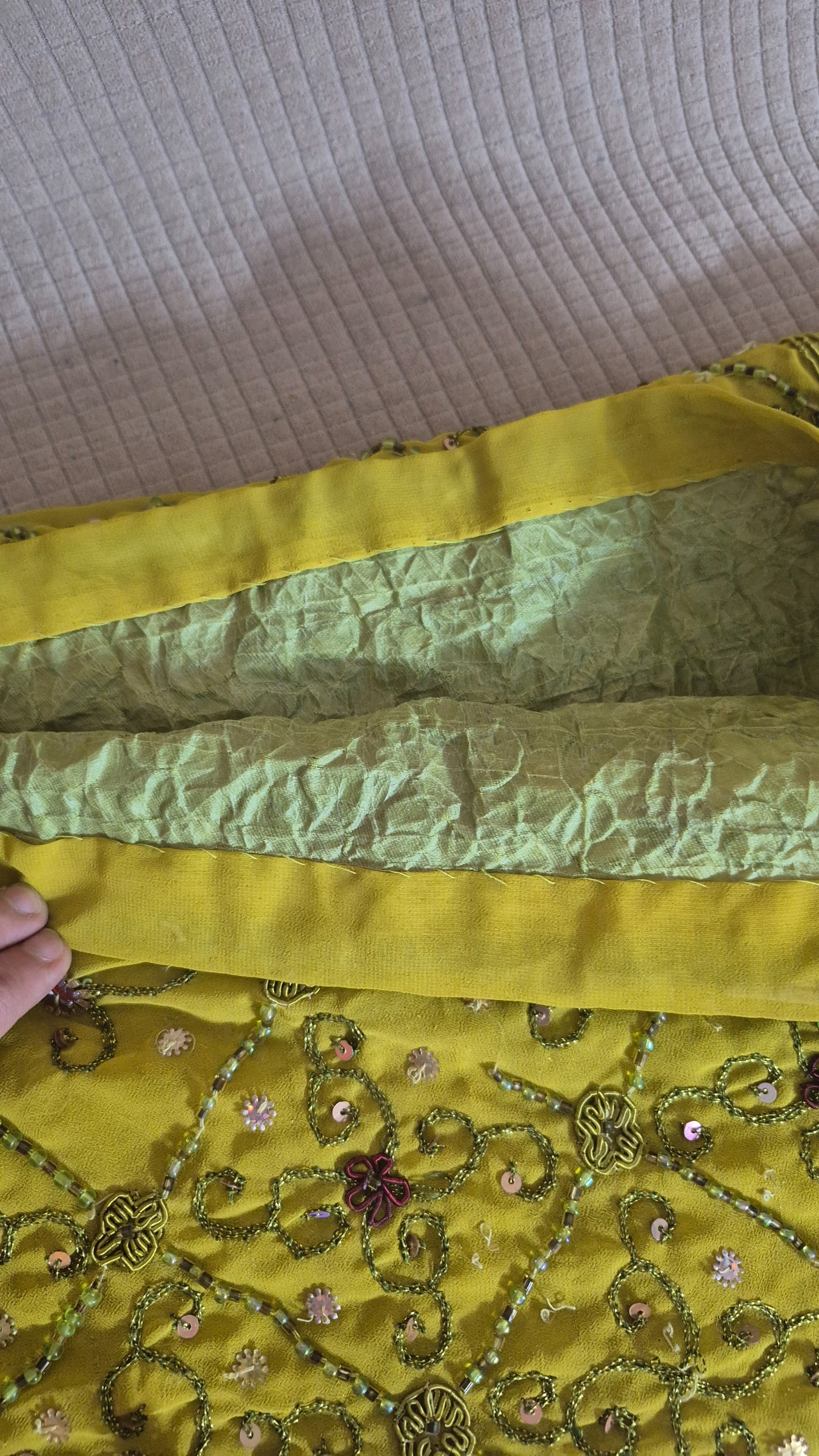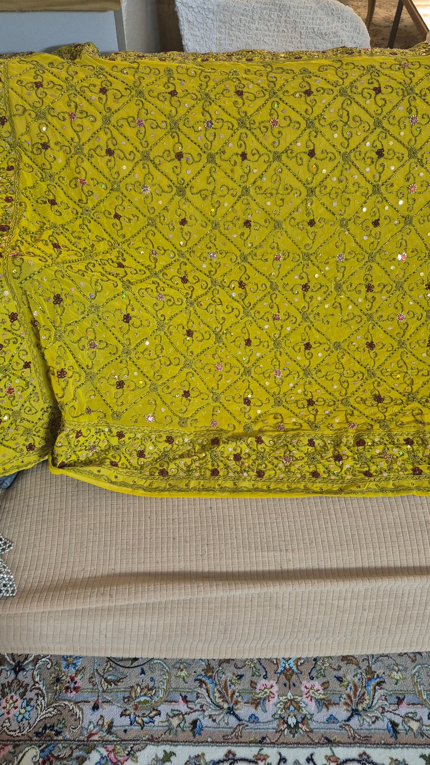 رومیزی کار دست اندازه دومتر و ده در یک متر رنگ خردلی تمام کارهاش با دست انجام شده چون وزنش زیاد هست هزینه با خود خریدار میباشد