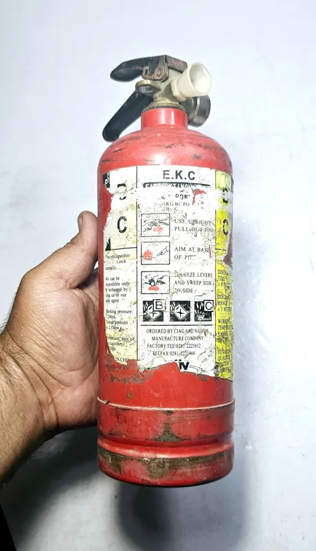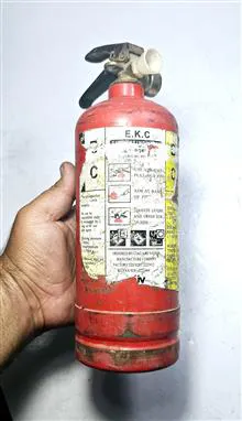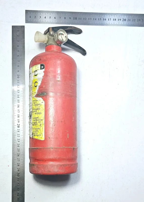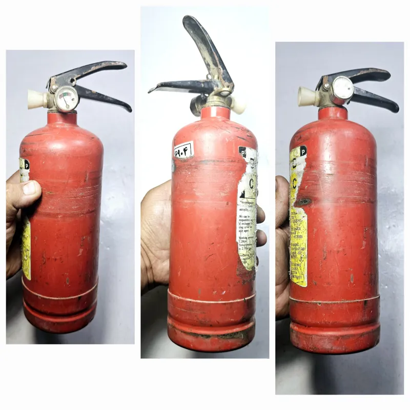 کپسول آتشنشانی خودرو برند E K C ساخت کشور چین ، یک لیتری ، قابل شارژ ، به علت قدمت دارای خط و خش و رنگ رفتگی میباشد که در تصاویر مشخص است ، کپسول نیاز به شارژ دارد ، به همین علت معیوب ثبت شده است