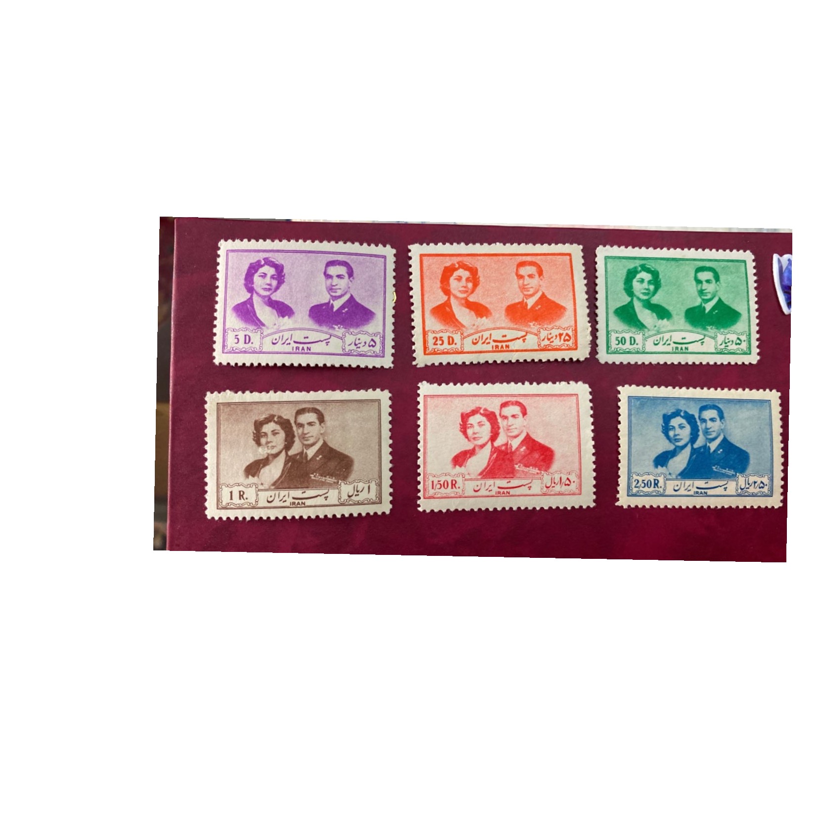 سری کامل تمبر عروسی شاه و ثریا بختیاری کاملا سالم و تمیز و بدون هیچگونه عیب و ایراد دندانه سالم با چسب قیمت کتاب 3.500.000 تومن