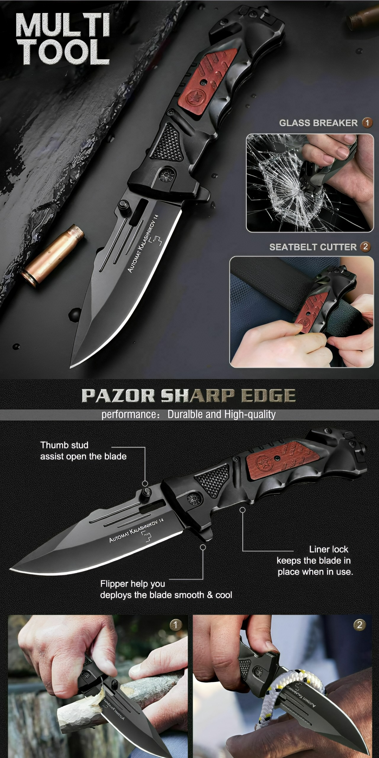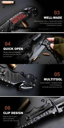 دارای تیغه فنری اتصال به کمربند در پشت دسته و شیشه شکن(ضربه زن) در انتهای دسته.
