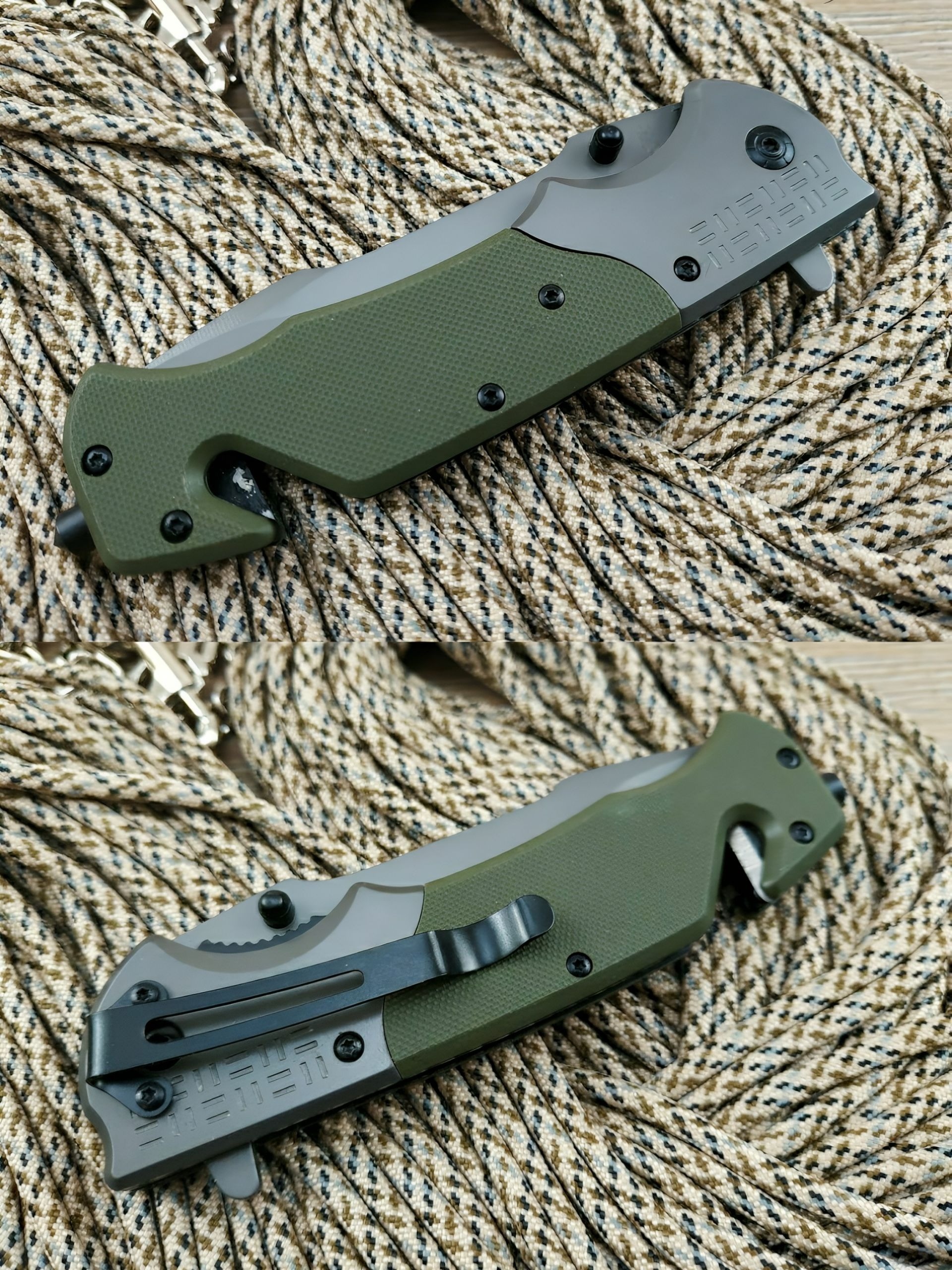دارای تیغه فنری اتصال به کمربند در پشت دسته و شیشه شکن(ضربه زن) در انتهای دسته.