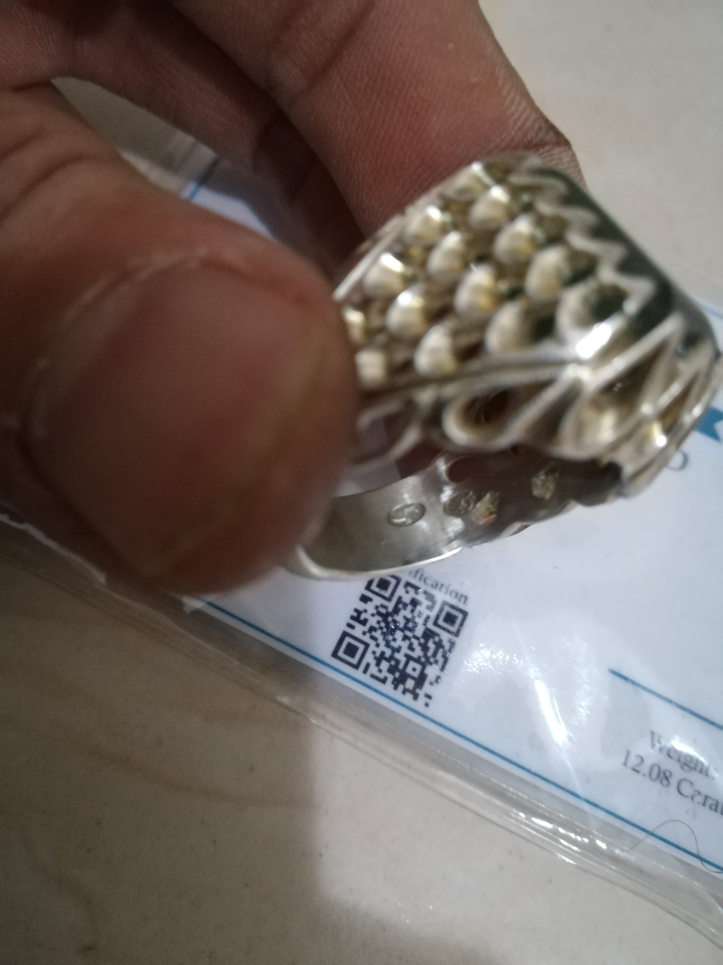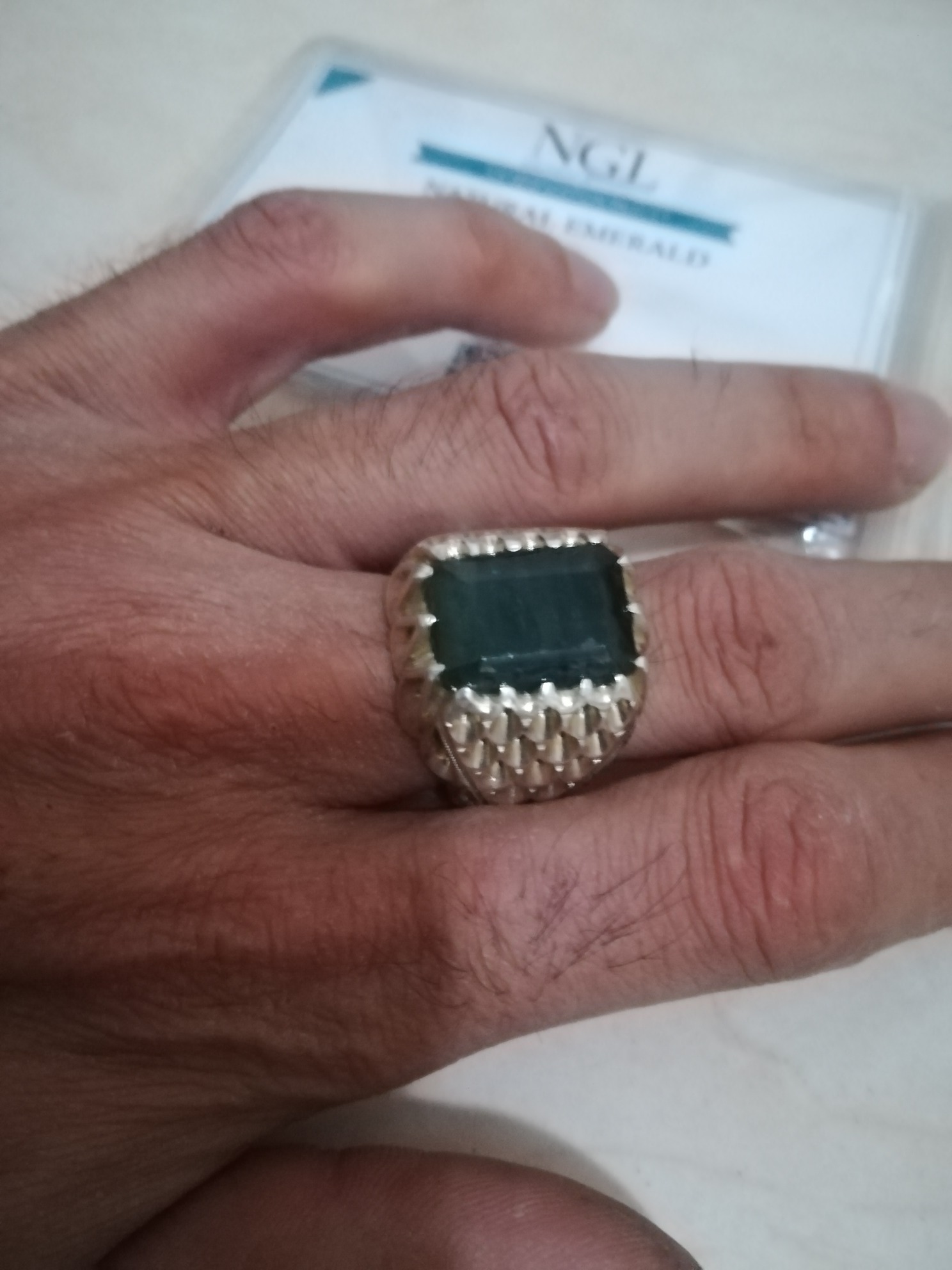 زمرد بینظییر درشت ناب اصیل معدنی زامبیایی بسیار خوشرنگ و زلال با تراشی بینقص و دقیق دارای شناسنامه و سرتیفیکت معتبر جهانی، رکاب دستساز لوکس مدل پولکی از جنس نقره خارجی اعلا عیار 925