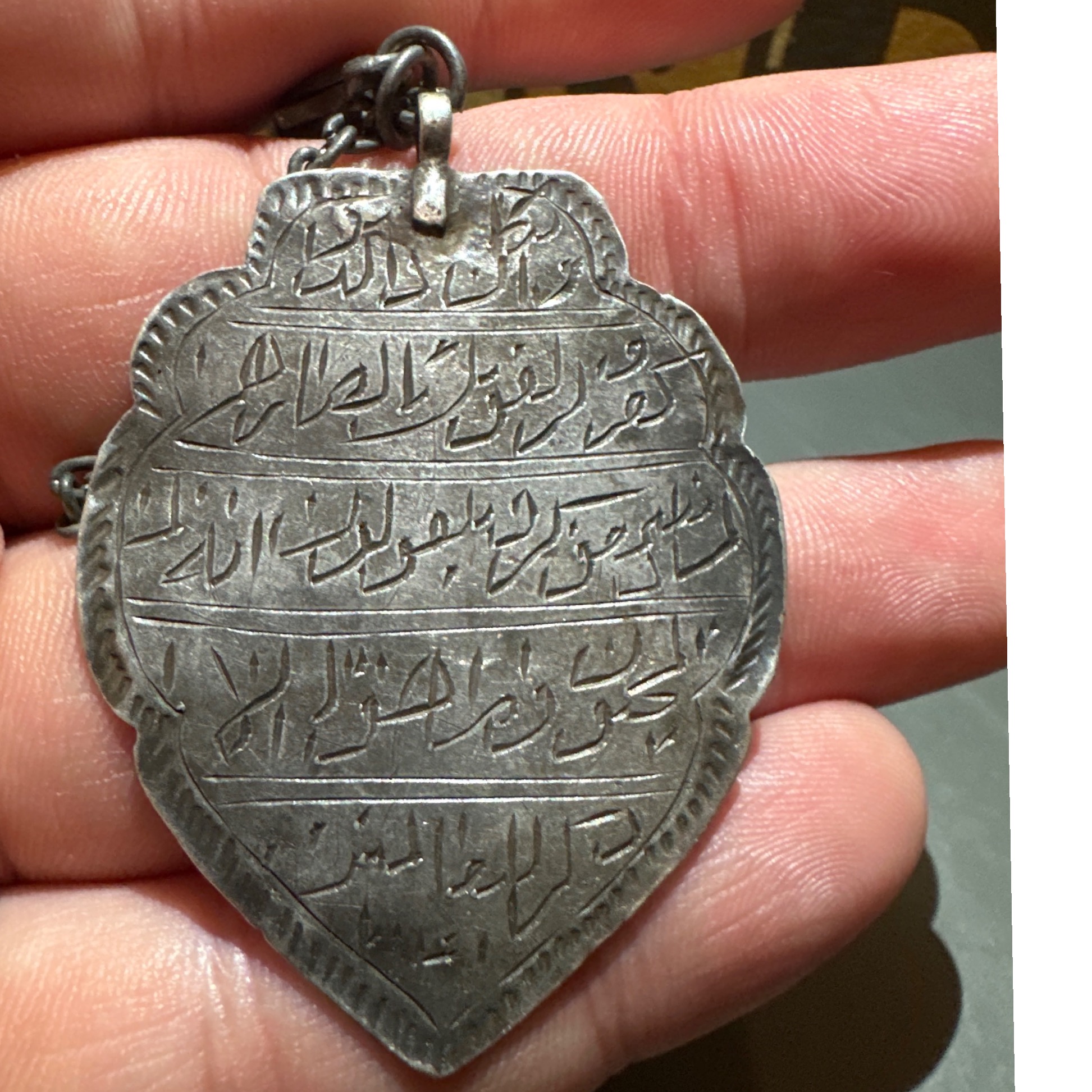 قدمت بالای 100 سال . دست ساز و زیبا . طول خود صفحه 5 سانتی متر و با زنجیر متصل بهش کلا 20 سانتی متر میباشد .