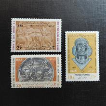 سه تمبر از سری سوم جشنهای دوهزار و پانصدمین سال شاهنشاهی، 1350، مطابق تصویر، پشت تمبرها زرد شده است.