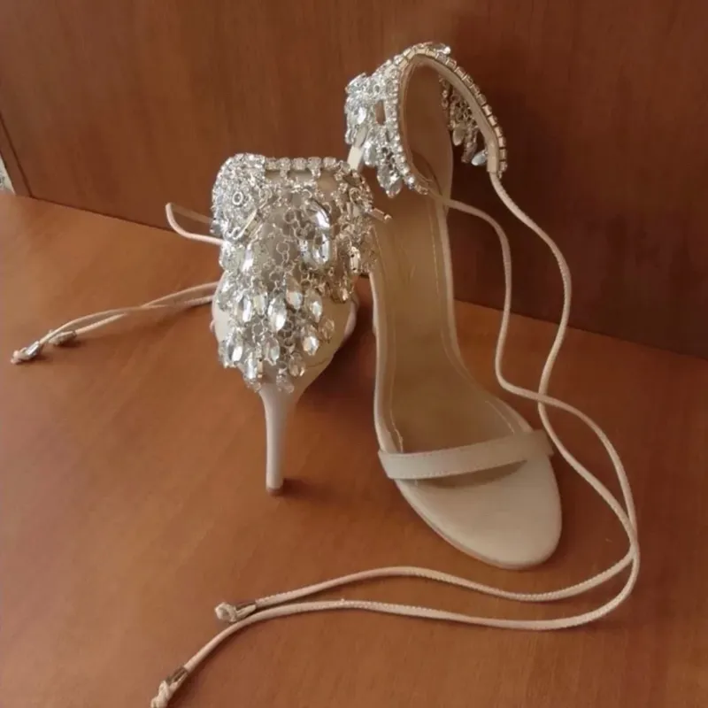 کفش کرم شیری مجلسی بلند نگین جواهری بند دار عروس