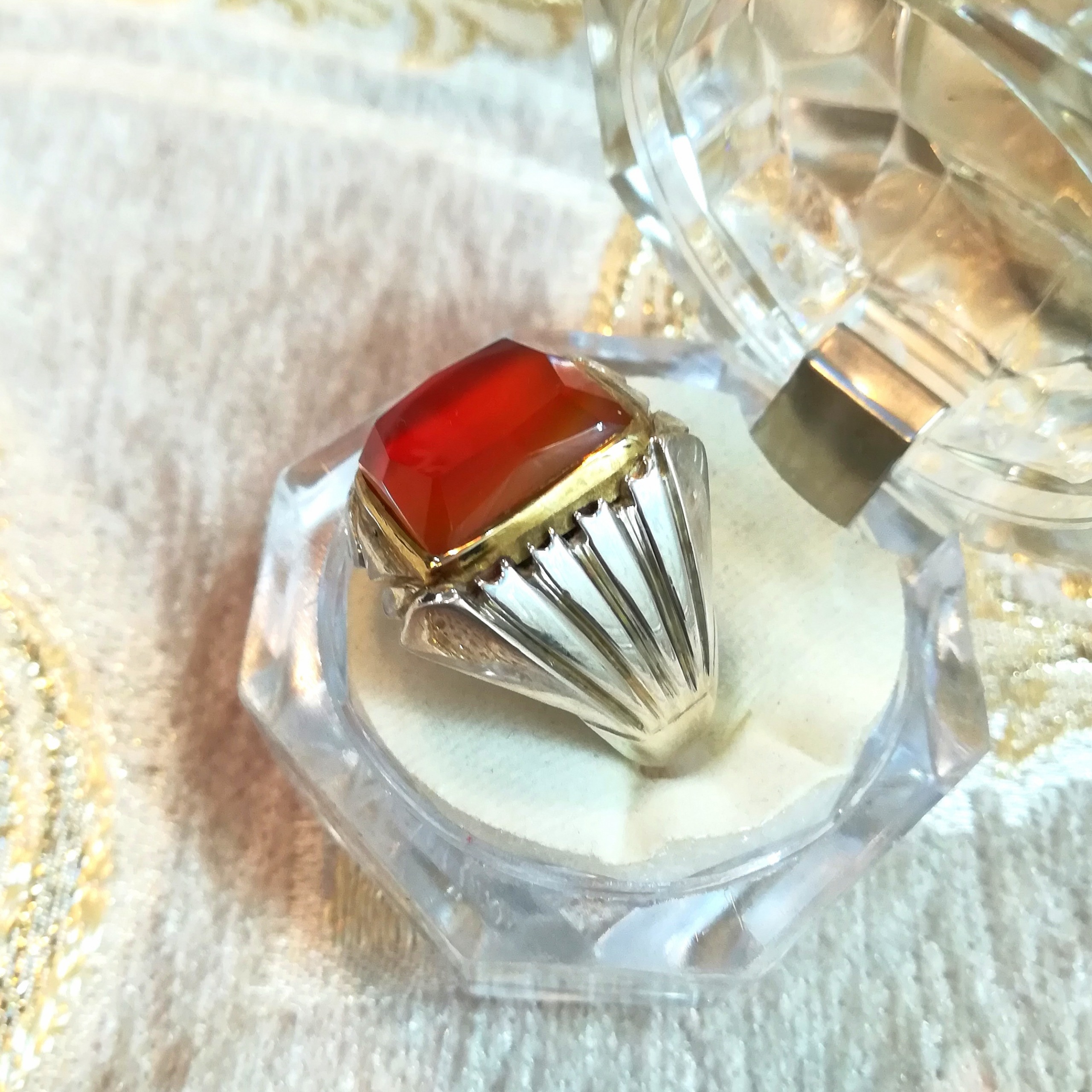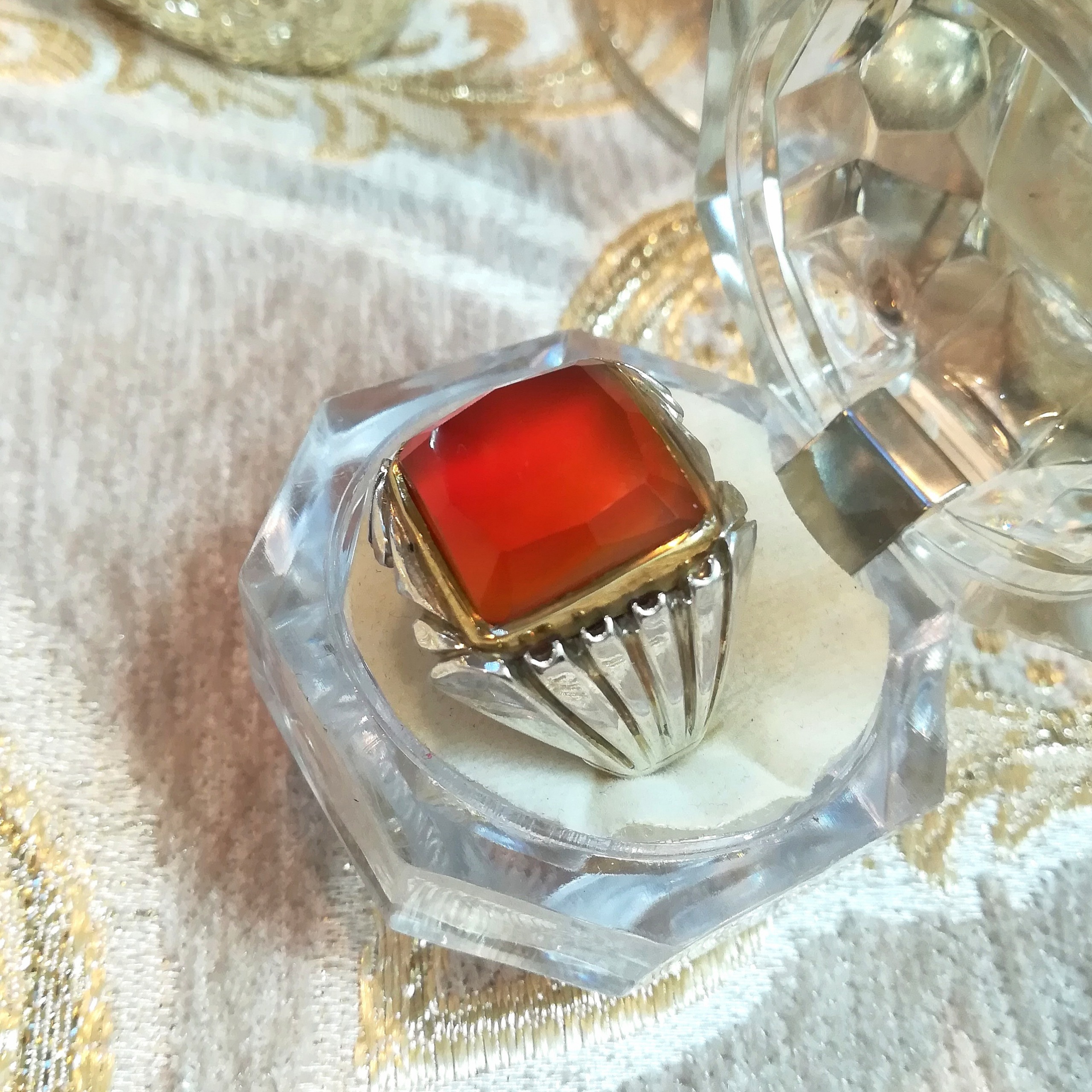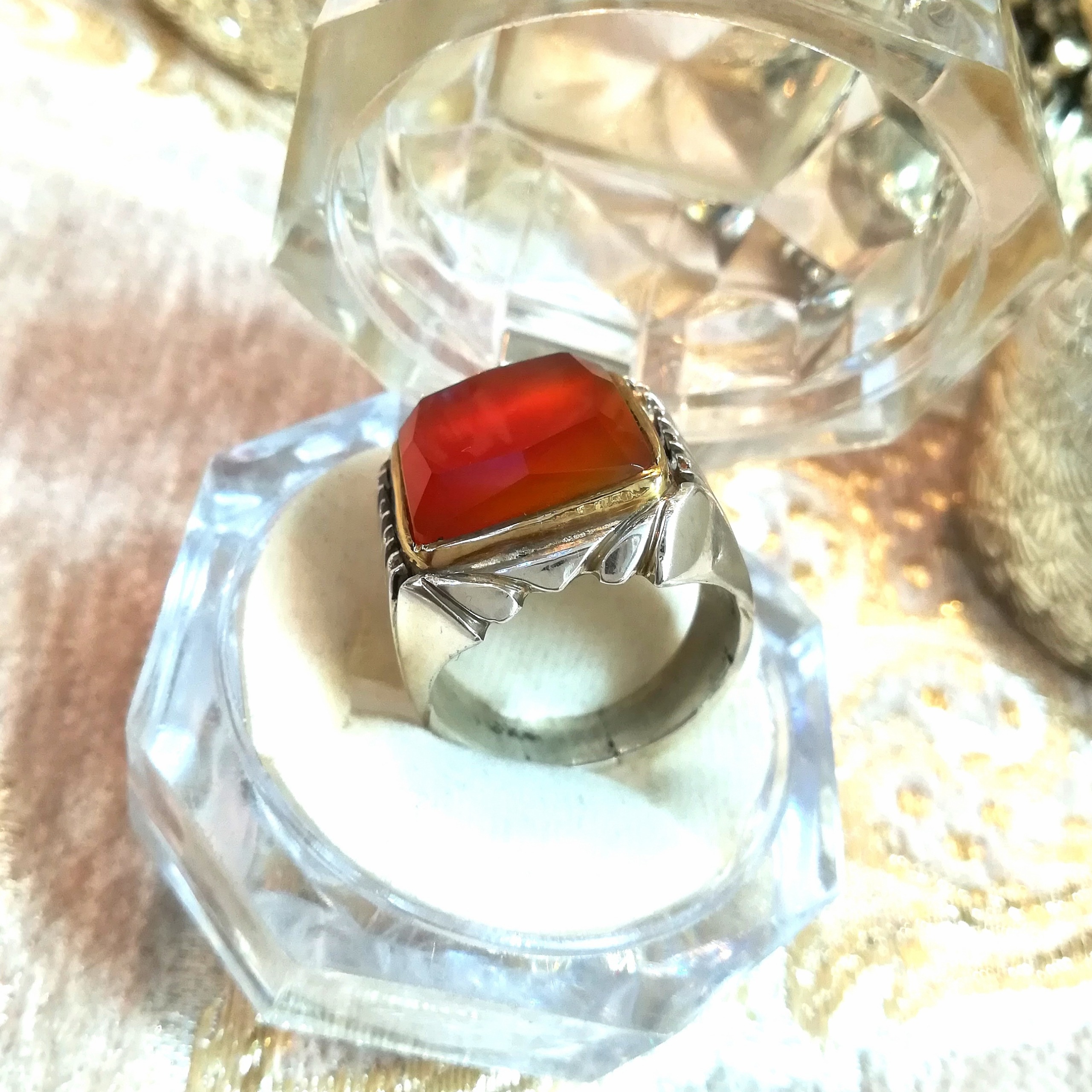 انگشتر لوکس و فاخر عقیق سرخ ناب یمنی آبدار و بسیار زلال و یکدست با تراش جواهری بسیار بینقص و چشمنواز، رکاب نفیس دستساز مدل شیرازی از جنس نقره خارجی اعلا عیار 925