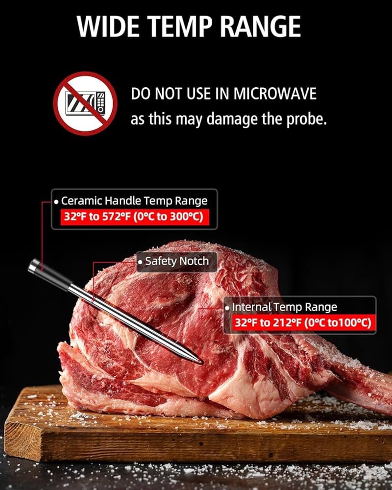 کاوشگر ضد آب IP67: کاوشگرهای ضد آب دارای رتبه IP67 به راحتی تمیز میشوند و قابل شستشو در ماشین ظرفشویی هستند. این پروب گوشت دیجیتال دمای داخلی گوشت (تا 212 درجه فارنهایت) را اندازهگیری میکند و دارای یک دسته سرامیکی مقاوم در برابر حرارت (تا 572 درجه فارنهایت) است.