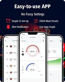 تقویتکننده هوشمند: این تقویتکننده دماسنج گوشت با صفحه نمایش LCD HD، دمای تنظیمشده، دمای فعلی، وضعیت باتری، وضعیت اتصال بلوتوث و سایر اطلاعات غنی را نمایش میدهد و نیاز به بررسی مداوم برنامه تلفن را از بین میبرد.