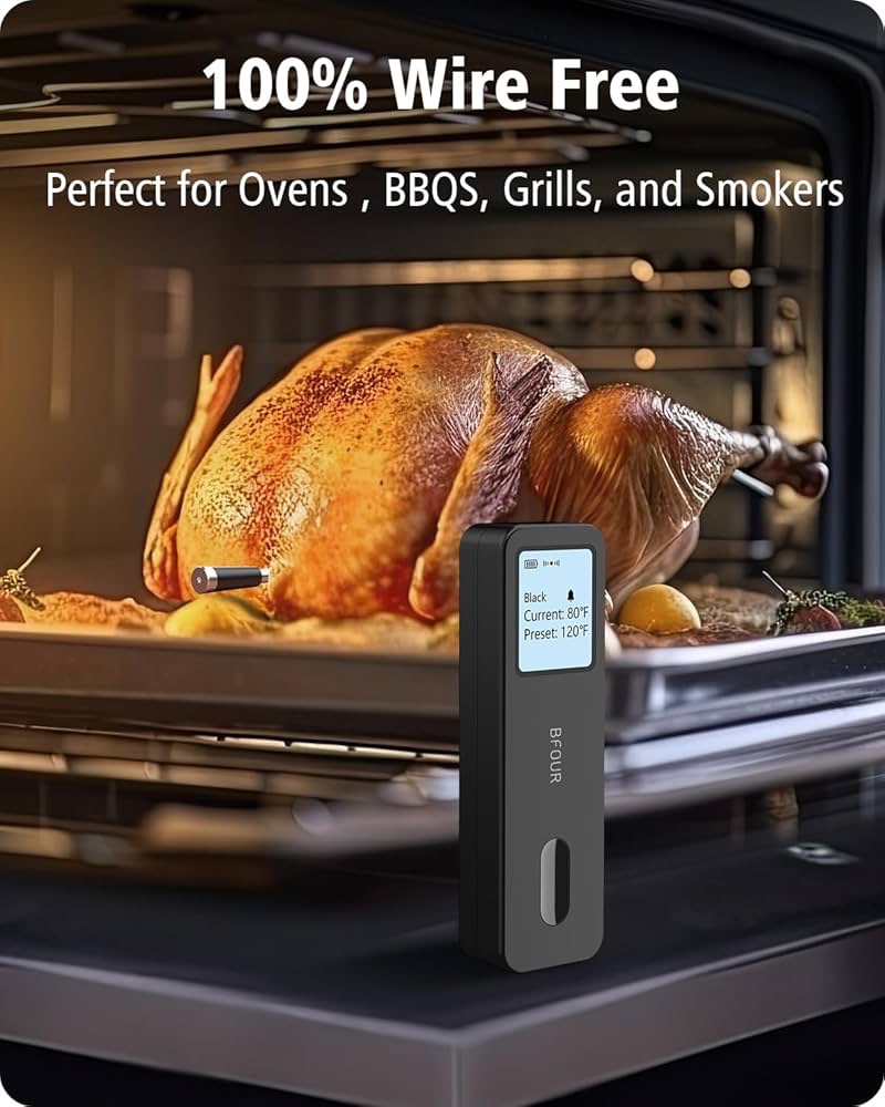 100 درصد بدون سیم: این دماسنج گوشت بیسیم بلوتوث، تمام سیمهای درهمتنیده را از بین میبرد و برای کبابپزها، فرها، کبابپزهای دودی، کبابپزهای جوجهگردان و موارد دیگر عالی است. کاوشگر نمیتواند دمای محیط را اندازهگیری کند.