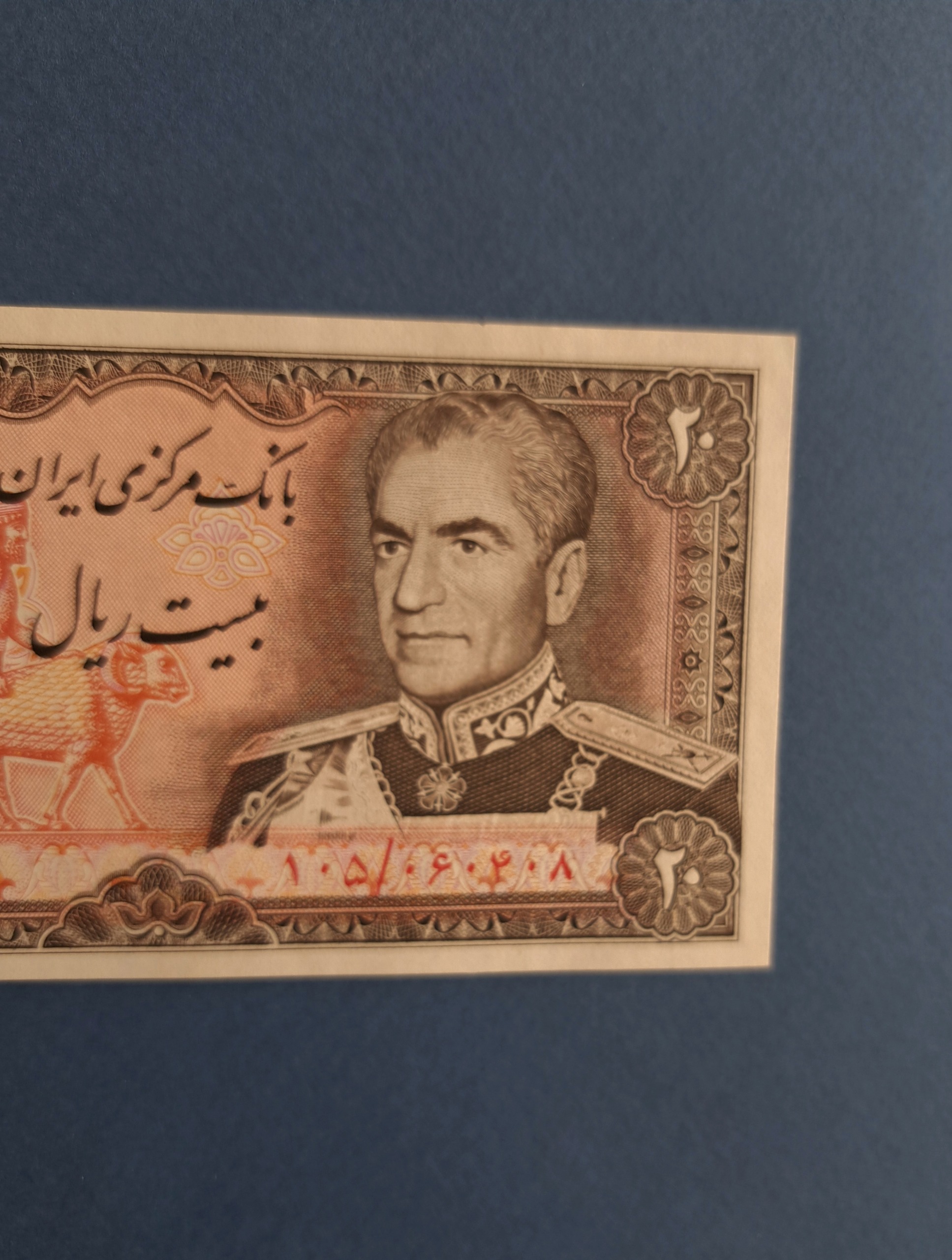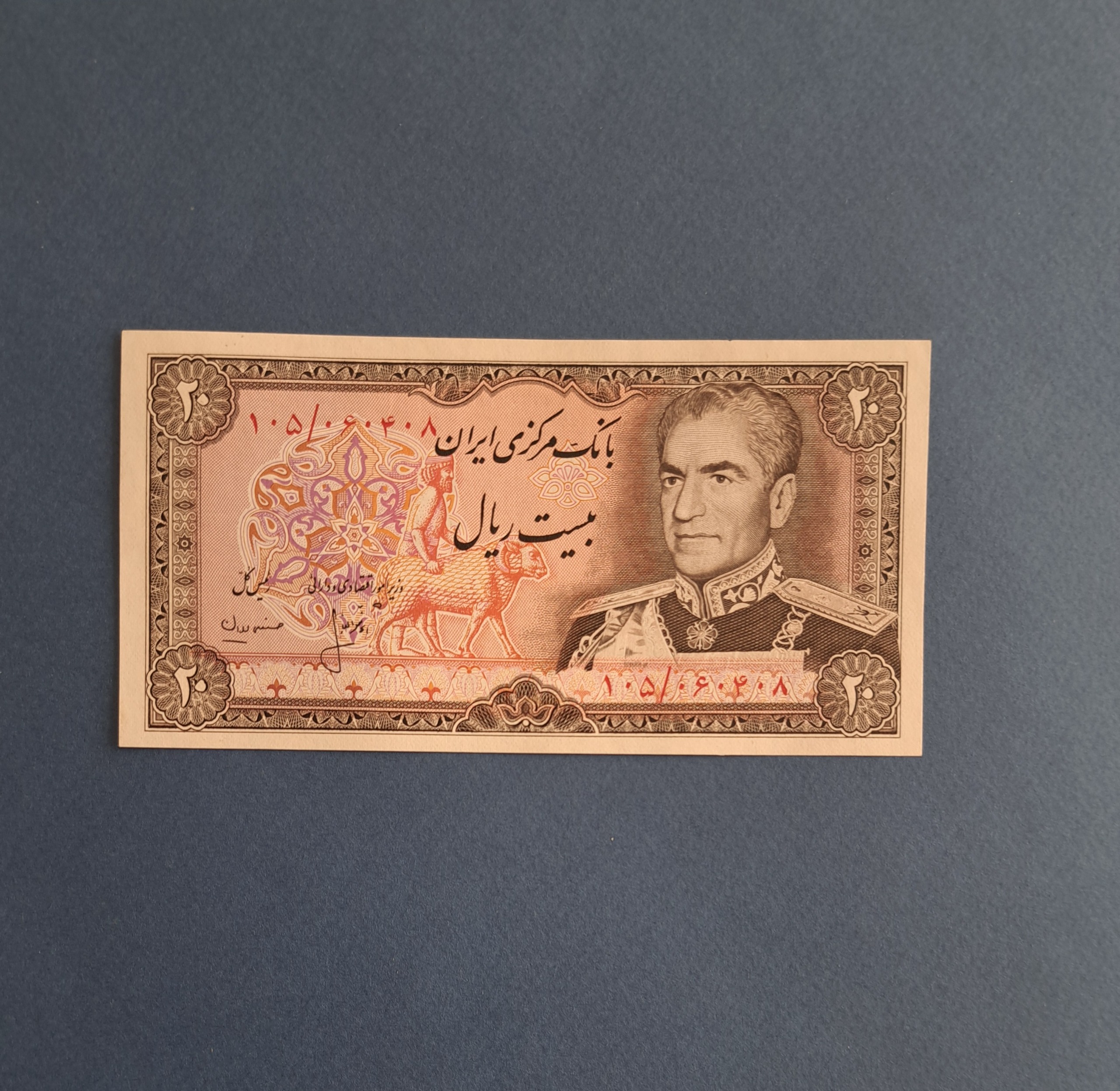 اسکناس تک ارزشمند  و زیبای 20 ریالی پهلوی  با شماره سریال بسیار قشنگ  چهار قلو  8  0 4  0 6  0 5  0 1   با کیفیت بانکی تقدیم میشود