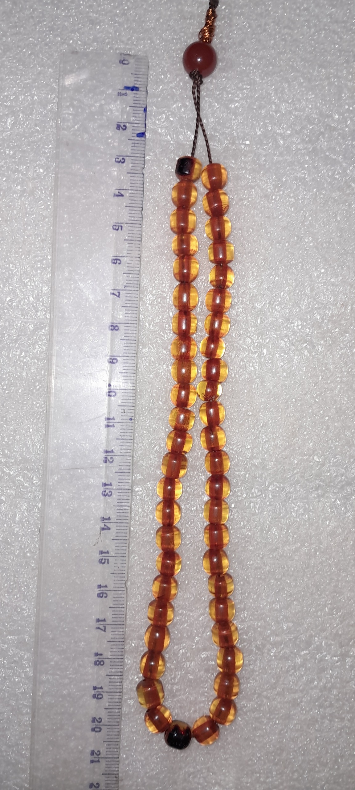 تسبیح کهربا 46 دانه ای،توضیح این که تست حرارت انجام شده مشاهده کنید روی دو مهره که ،نمی سوزد ،رنگ عوض می کند و بوی صمغ در موقع حرارت آزاد می کند و در هنگام مالش بین دست ها بوی خاص دارد .